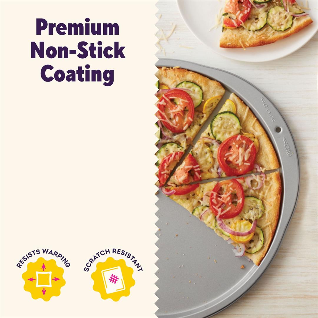 Same Great Pan, New Name: Previously known as Bake It Better, this bakeware is now part of our Premium lineoffering the same trusted quality and performance you know and love. Pizza pan measures 16″ in diameter, ideal for homemade, frozen, and dessert pizzas as well as flatbreads & appetizers Durable steel provides superior quality, distributes heat evenly & resists warping Handles provide a secure grip for effortlessly placing or removing desserts or meals from the oven Durable, scratch-resistant non-stick coating allows for easy food release & quick cleanup Premium non-stick coating ensures effortless release of baked goods, so foods & desserts slide right out and clean-up is a breeze Designed for durability, safe for use with metal tools, & scratch-resistant (abrasive cleaners & scouring pads, not recommended) Oven safe up to 450 degrees Fahrenheit Use & Care for best results: wash in warm, soapy water before first and after each use. Avoid cleaning with abrasive cleansers or scouring pads; we recommend using only those products that are labeled safe for non-stick surfaces. Some foods may stain the metal but will not affect the performance.