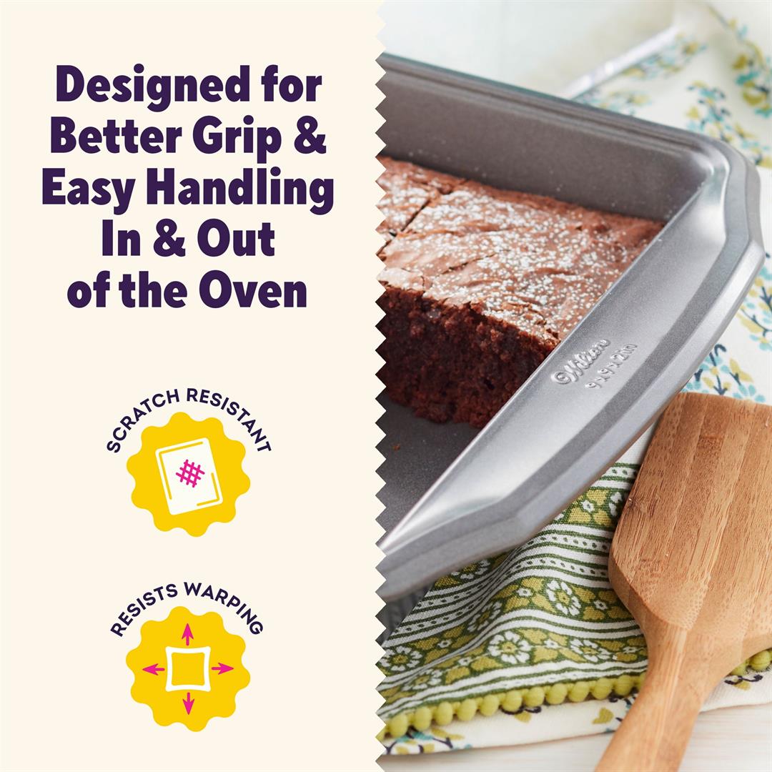 Bake delicious brownies and more with the Wilton Premium 9X9 Non-Stick Steel Square Cake Baking Pan Brownies Cornbread, the ultimate square brownie pan for your baking needs from brownies to breads. Designed for everyday bakers, this durable brownie pan is made from cold-rolled steel, ensuring even heat distribution and resistance to warping for consistently perfect results. The spacious design give you plenty of room to bake brownies, biscuits, cornbread, pastries and more. The Wilton square baking pan is scratch-resistant and its premium non-stock coating allows baked goods to slide off effortlessly, making cleanup quick and easy. Plus, Handles provide a secure grip for effortlessly placing or removing desserts or meals from the oven. Oven safe up to 450 degrees Fahrenheit. A must-have for everyday baking and special occasions alike. Measuring 9 inches wide by 9 inches in length by 2 inches deep, this dishwasher safe cookie sheet is and is backed by a 10-Year Limited Warranty for worry-free baking. For terms & conditions, please visit Wilton.com. At Wilton, we are champions of adding sparkle and fun to any occasion. From an extensive array of baking and decorating products to skill-building classes, it’s our treat to help you create sweeter moments.