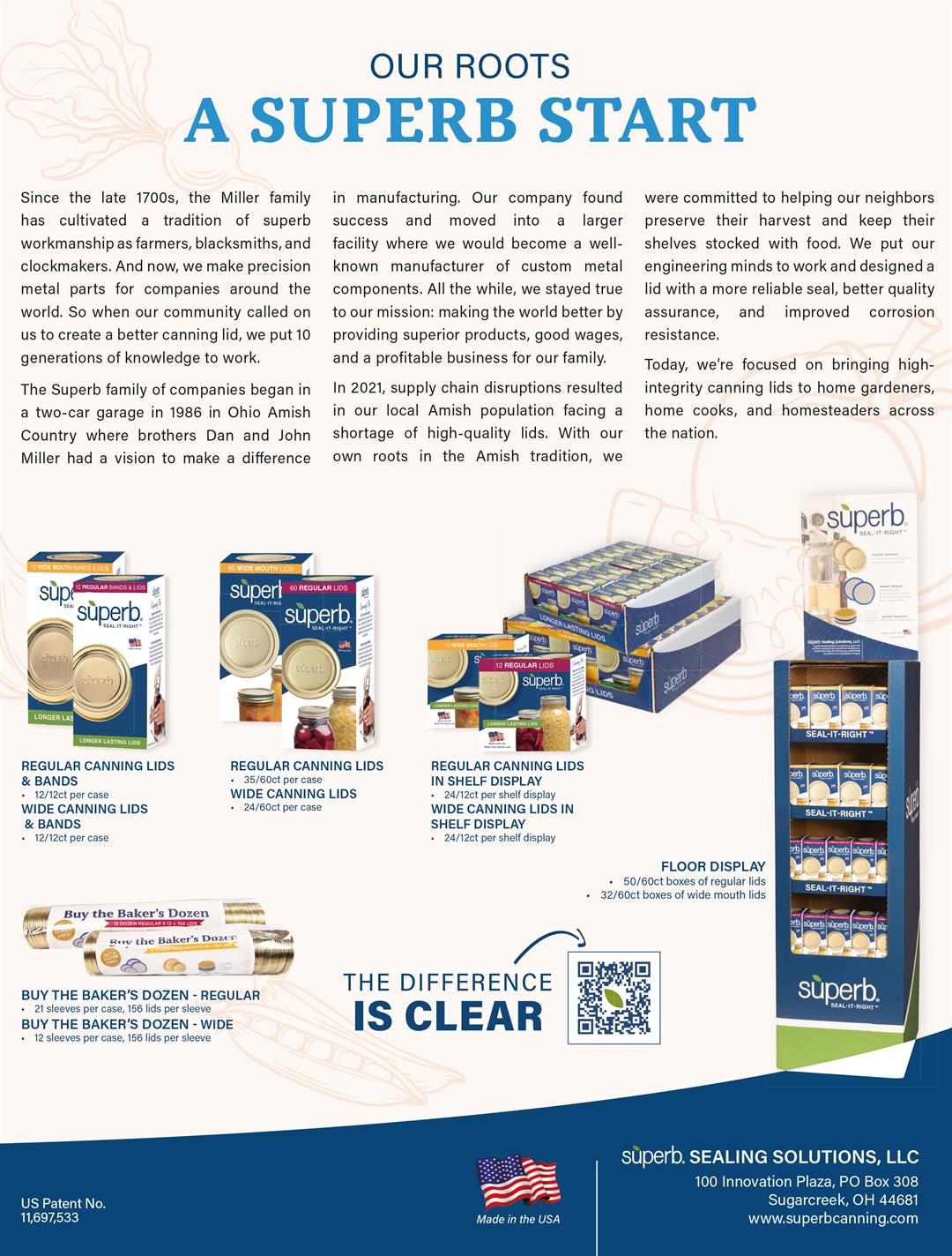 Engineered to be the highest quality lids available, these wide mouth canning lids have a specially formulated adhesive that is thicker and wider to seal on virtually all wide mouth mason style jars. BluSeal Integrity offers more sealing power designed to prevent buckling and seal lasts up to 36 months. It is important not to over-tighten for a proper seal. We recommend tightening with three fingers to ensure the right tightness. The distinctive “pop” feature provides an audible and visual assurance of seal integrity. Made with five layers of corrosion QuinTek protection. Safe for high pressure canning
