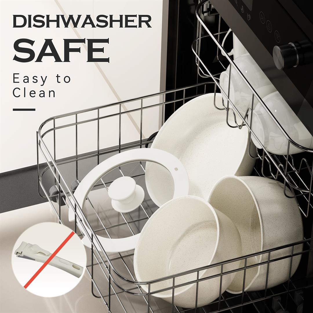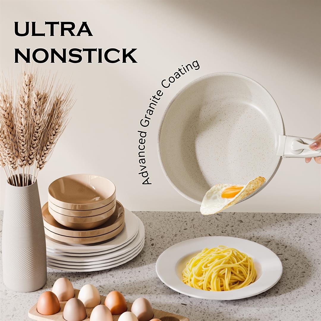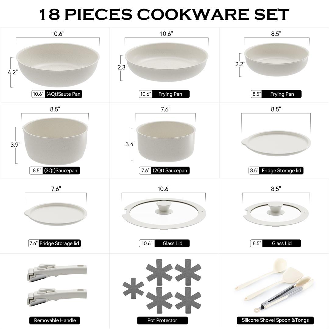 18Pcs Versatile Cooking Set: 18 pcs kitchen cookware set includes 4.5QT saute pan with lid,9 inch/11 inch frying pans, 4.3 QT saucepan with lid and steamer,1.5 QT saucepan with lid and silicone shovel spoon & tongs. The different sizes and types of pots and pans meet all your needs for everyday cooking. Easy & Healthy Cooking: Our cookware set is crafted from premium granite and is PFOS/PFOA-free. The ergonomic design ensures easy handling, while the heat-buffering handles enable safe and comfortable cooking. Enjoy the peace of mind that comes with healthy, safe cooking. Durable Bakelite Handle: With heat-resistant properties allow you do not worry about burning fingers in picking up the pot. Perspective glass lid ergonomic design allow you to check the status of the food in the pot in time. Fast & Even Heat: Our pan sets for cooking features advanced heating technology for rapid and even heat distribution. Whether you’re cooking under time pressure or aiming for perfectly uniform results, our cookware delivers. Compatible with All Stoves: The cookware set is oven-safe up to 400F and is suitable for use on all cooktops, including gas, electric, and induction. Our cookware is easy to clean, often requiring just a quick rinse or a gentle wipe, making it a practical choice for busy kitchens.