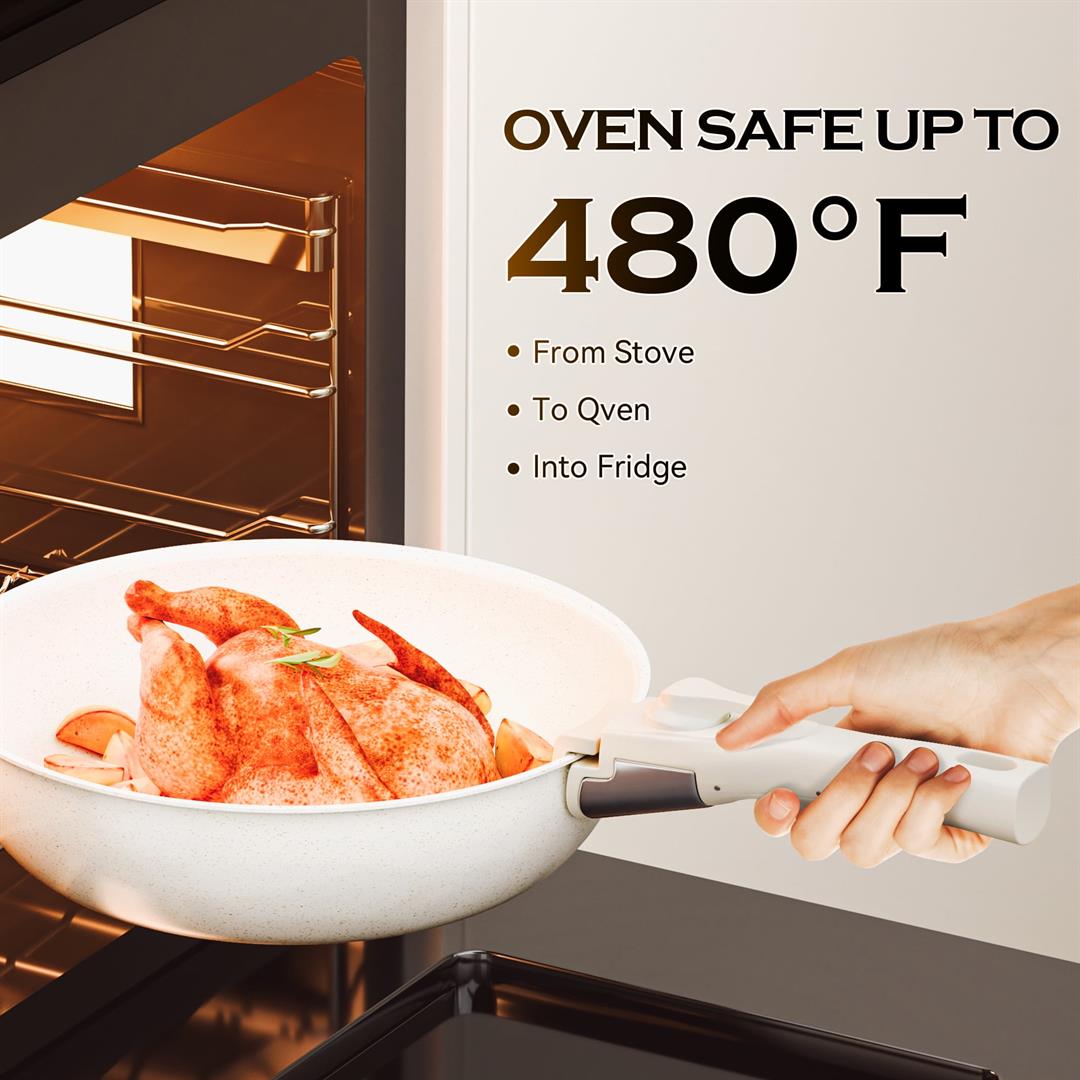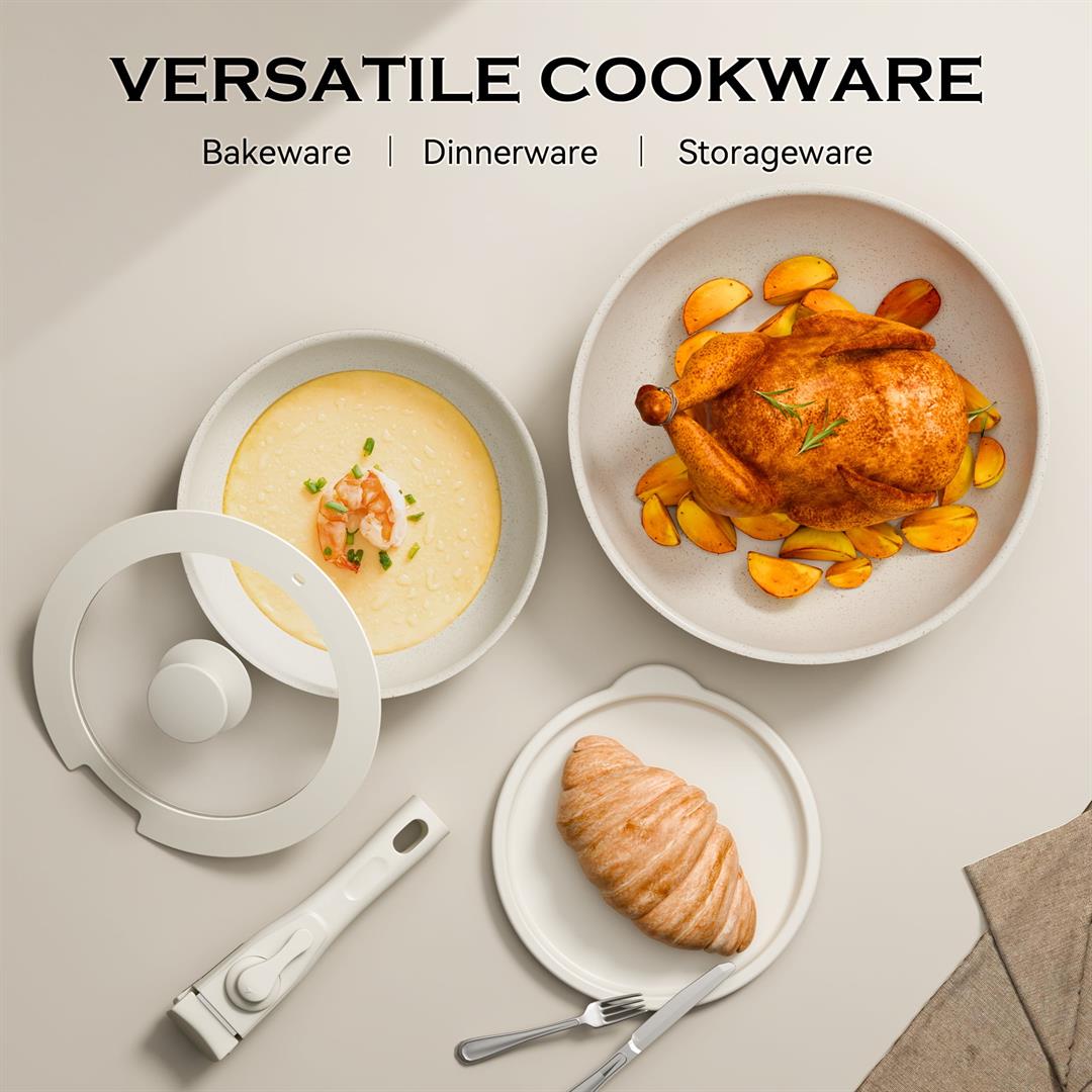 Description Smooth interior makes it exceptionally nonstick – perfect for everyday cooking like pancakes, eggs, steaks, and fish. Rinse or wipe clean – zero residue in 5 seconds. Alternatively, toss it in the dishwasher for time-saving convenience. Detach the handle for oven use. Let’s whip up a delicious frittata! Suitable for All Stove- High Magnetic conduction stainless steel base with Extended Bottom Design allows our kitchen cookware sets to work on all cooktops, including induction, heat evenly and quickly. Specifications: Piece Count: 18 Color: White /Black for your choice Material: Stainless steels Size: 11.4×11.4×6.7in Weight: 7.7lb