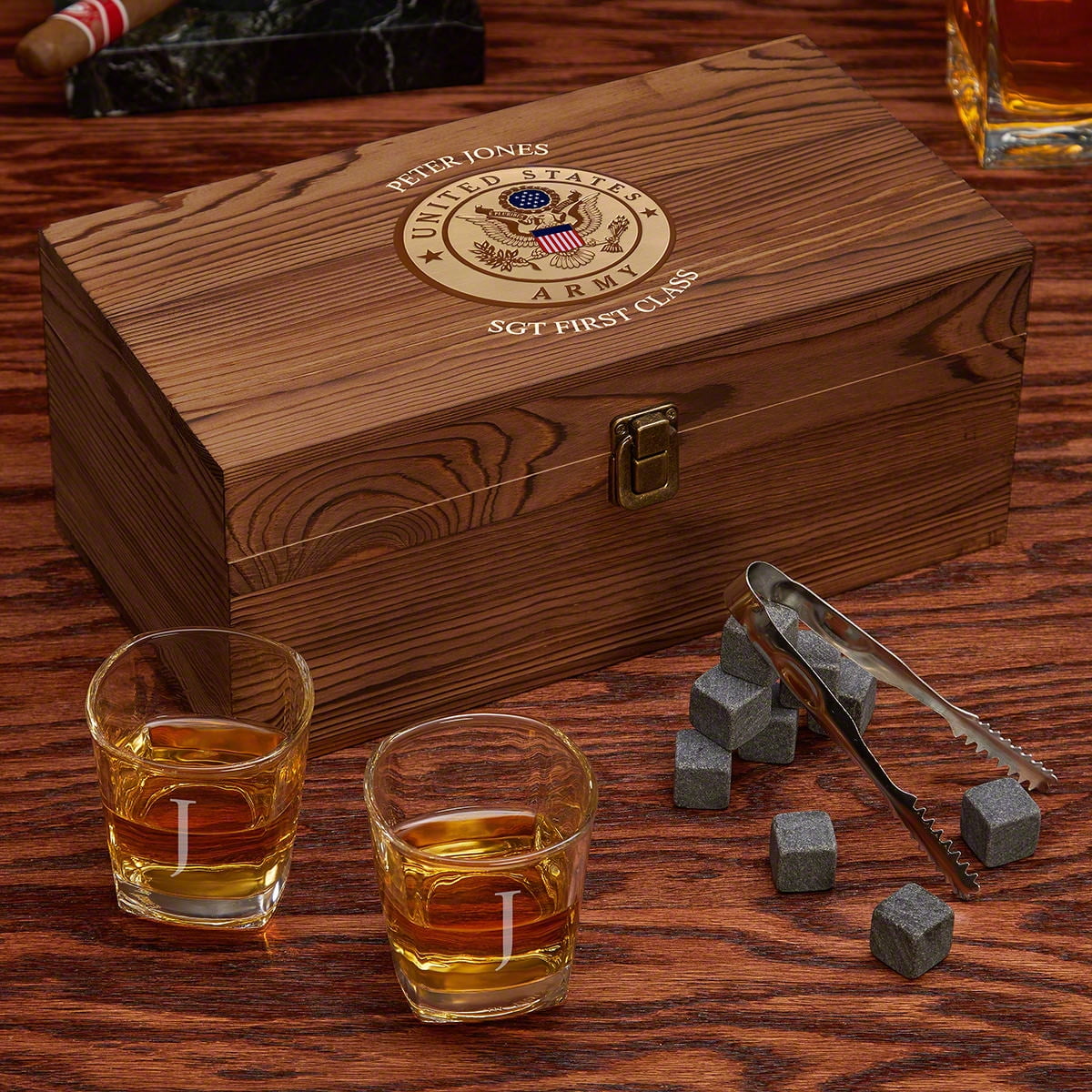 Honor the serving or retired soldier with an awesome set of Army gifts Includes a wooden gift box, two shot glasses, nine whiskey stones, a pair of tongs, and a travel pouch Gift box is engraved with two lines of text around a 4″ wide Army crest, glasses with an initial A great gift for currently serving soldiers or veterans during the holidays or their birthday Box measures 12″ x 6.25″ x 5″, shot glasses each measure 3″ x 2.75″ and hold 6 oz