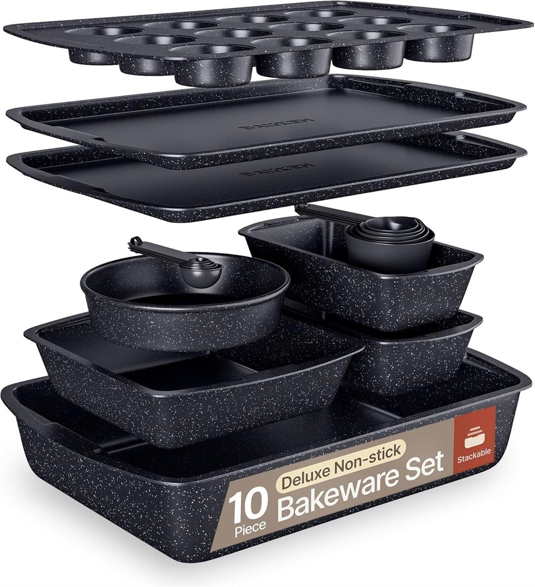 Complete Bakeware Set: Includes all the essential pans you need for baking cakes, muffins, cookies, pizzas, and more. Always have the right tool on hand for every recipe. Reliable Construction: Made from durable carbon steel to resist warping and provide even heat distribution. Built for consistent baking performance in any kitchen. Nonstick Coating: Features a premium nonstick interior and exterior for easy food release and fast cleanup. No more stuck-on messjust perfect results every time. Oven Safe Up to 450F: Designed to handle high temperatures, making this bakeware ideal for everything from delicate pastries to hearty roasted dishes. Stackable Design: Space-saving nesting pans help you keep your kitchen organized and clutter-free, with all pieces stored neatly and efficiently.