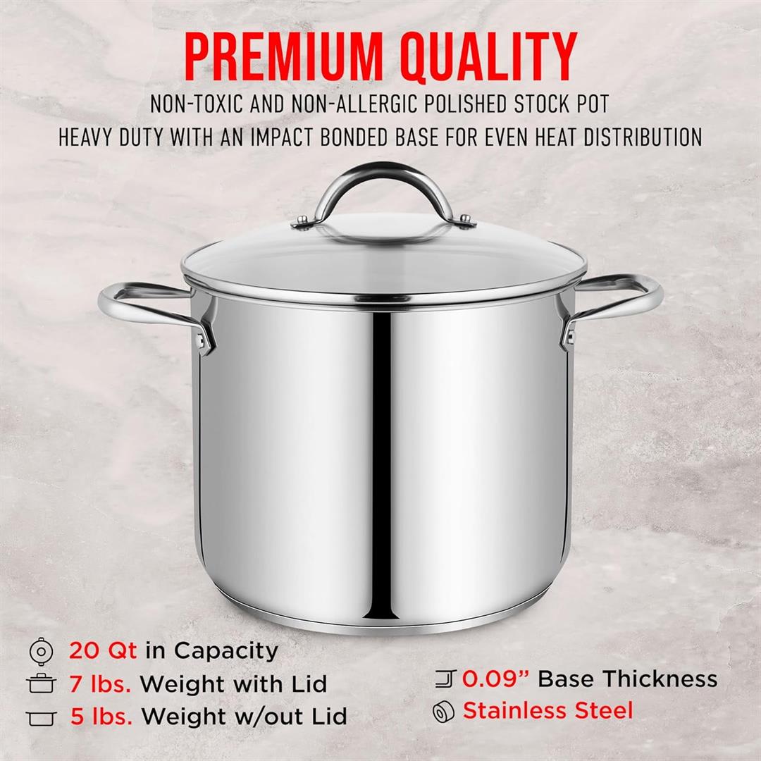 Bakken- Swiss Deluxe 20-Quart Stainless Steel Stockpot with Glass Lid Large Capacity, Heavy-Duty, Induction Compatible & Food-Grade