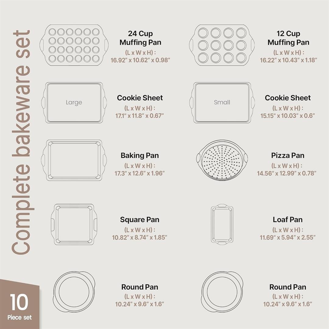 The BAKKEN 10-piece Nonstick Carbon Steel Bakeware Set is the perfect addition to any kitchen, whether for home cooks or professionals. This set includes one baking pan measuring 17.32” x 12.6” x 1.96”, one pizza pan measuring 14.56” x 12.99” x 0.78”, one small cookie pan measuring 15.15” 10.03” 0.60”, two round pans both measuring 10.24” x 9.60” x 1.60”, a square pan measuring 10.82 8.74 1.85, one loaf pan measuring 11.69 5.94 2.55, one big cookie pan measuring 17.1” x 11.8” x 0.67”, twelve cup muffin pan all measuring 16.22” x 10.43” x 1.18”, and twenty-four cup muffin pan all measuring 16.92” x 10.62” x 0.98”. These pans are ideal for everything from baking cookies and croissants to roasting vegetables, ensuring even heat distribution thanks to their commercial-grade carbon steel construction. The sturdy design prevents warping, even at high temperatures, making them perfect for everyday use. The nonstick coating not only ensures that your baked goods slide right off but also makes cleanup a breeze, helping you save time in the kitchen. These pans are oven-safe up to 450F, providing ample temperature resistance for a wide variety of recipes. In addition to their high performance, these pans feature a space-saving, stackable design that allows for easy storage, making them perfect for both home kitchens and professional settings. Safe for use in the oven, refrigerator, and freezer, and free from harmful chemicals .This bakeware set provides a reliable solution for all your baking needs, ensuring that every meal is prepared safely.