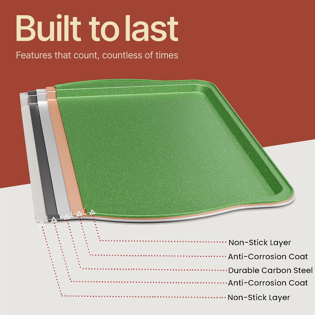 DURABLE CONSTRUCTION: Made with commercial-grade carbon steel, this 10-piece bakeware set ensures even heat distribution for perfect baking without warping. The nonstick green marble coating makes food easy to release and cleanup a breeze. COMFORTABLE HANDLES: Designed for both style and safety, the red silicone handles provide a secure, slip-resistant grip, making it easy to transfer your pans from oven to countertop with confidence while still oven-safe. NONSTICK & EASY TO CLEAN: The nonstick coating not only prevents your baked goods from sticking but also resists stains and is dishwasher safe. However, for long-lasting use, handwashing is recommended to maintain the integrity of the nonstick surface. VERSATILE & SPACE-SAVING: This stackable baking pan set is perfect for any kitchen, providing versatility for baking cakes, muffins, cookies, and more. Its space-saving design allows easy storage, making it ideal for home cooks and professional kitchens. SAFE & RELIABLE FOR EVERYDAY USE: This set is oven, refrigerator, and freezer safe. It provides a reliable, reusable, and eco-friendly solution for all your baking needs, ensuring your food is safe from harmful chemicals.
