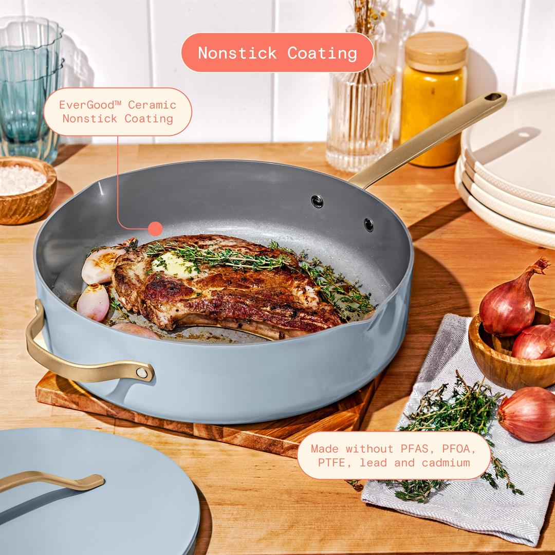 Made with EverGood Ceramic Nonstick Coating Integrated pour spouts and strainer lid Oven safe up to 500F, including the lid Compatible with all stovetops, including induction Durable construction for fast and even heating Sleek design with gold finish handles Dishwasher safe, hand wash recommended
