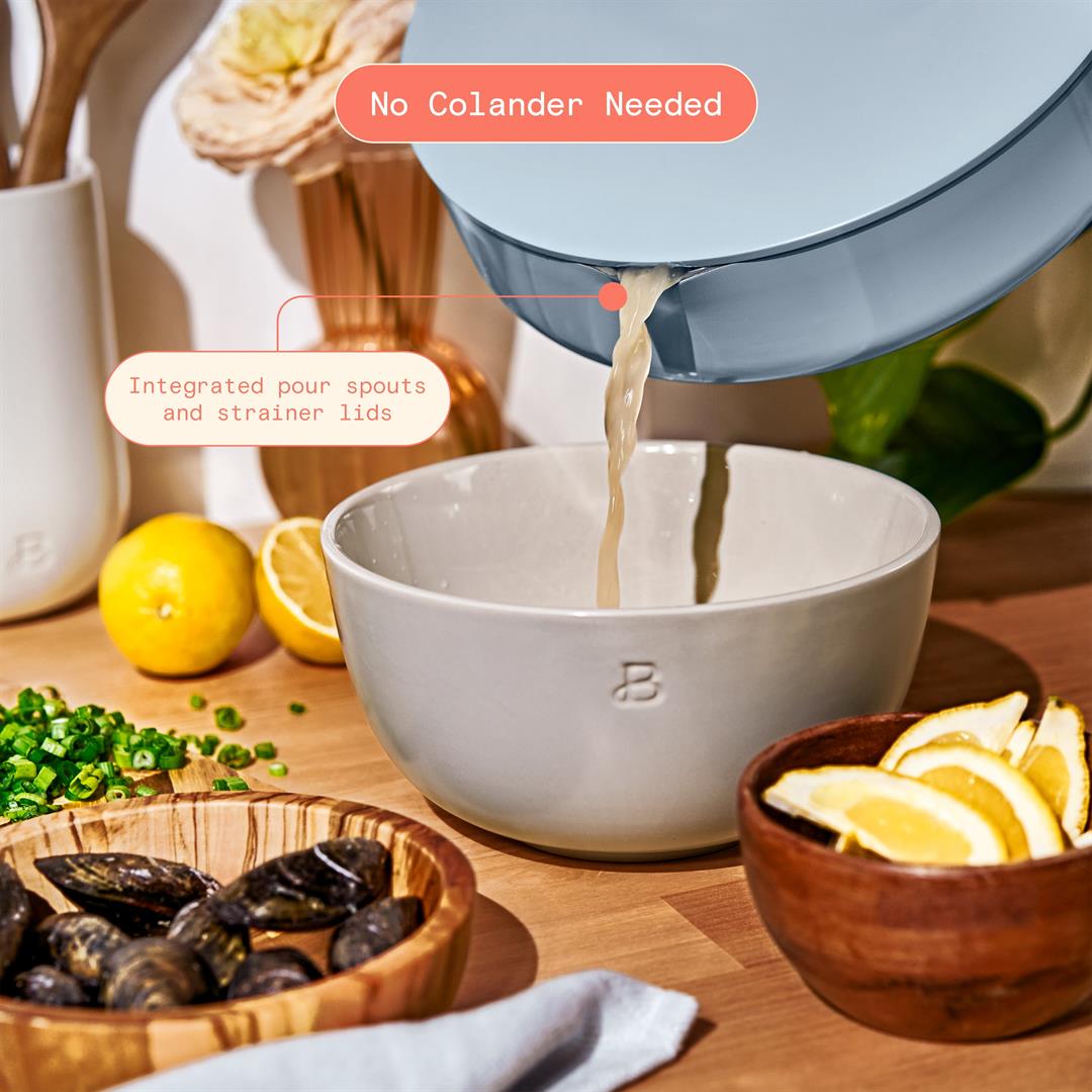 Sophisticated cookware with a thoughtful design? Yes, please. Meet the Beautiful 5.5qt Ceramic Nonstick Saut Pan with Strainer Lid. This versatile pan is great for sauting, pan-frying, and searing vegetables, meat, and fish. Plus, it comes with integrated pour spouts and lid with a strainer built right in to minimize messy pours. It is also made with EverGood Ceramic Nonstick Coating. The pan and lid are oven safe to 500F and compatible with all stovetopsincluding induction. While the pieces are dishwasher safe, we recommend hand washing.