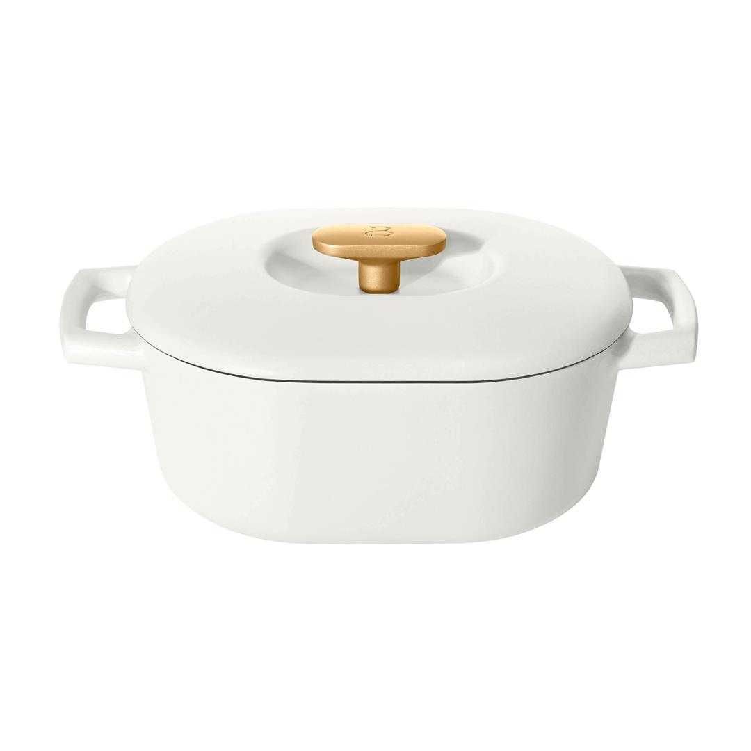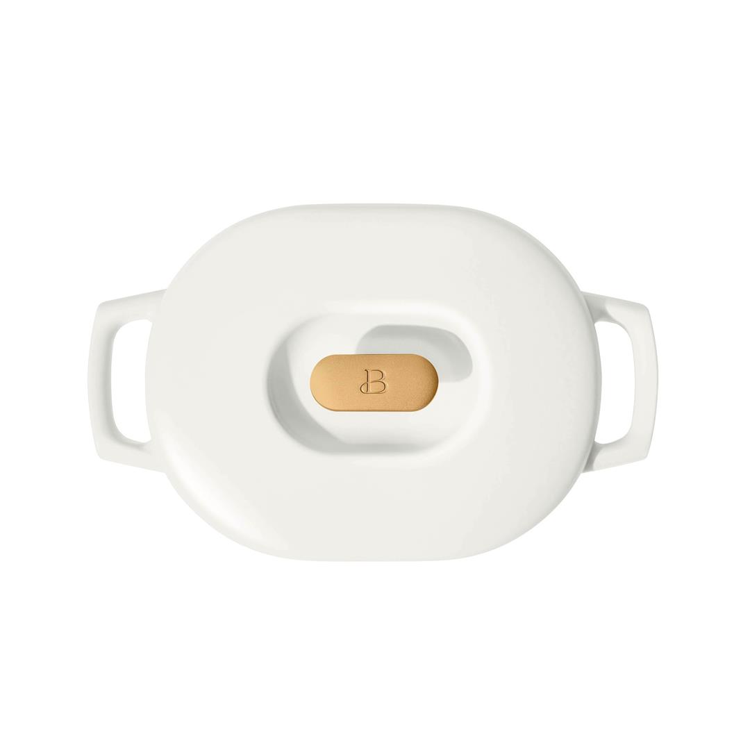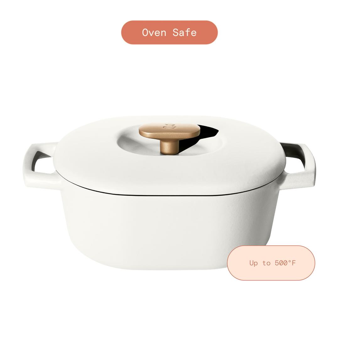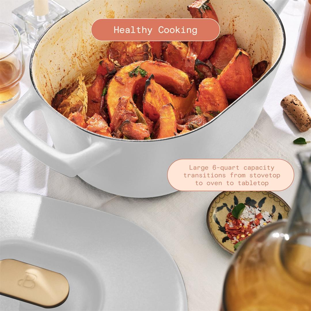 Durable cast iron construction retains heat and locks in moisture Enamel coating reduces sticking No pre-seasoning required Oven safe up to 500F Oval shape is ideal for roasts and larger cuts of meat Wide handles and large stainless steel knob enable easy handling, even with oven mitts Beautiful by Drew Barrymore available exclusively at Walmart Beautiful 6 Quart Enamel Dutch Oven, White Icing by Drew Barrymore