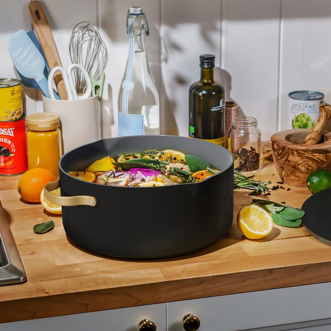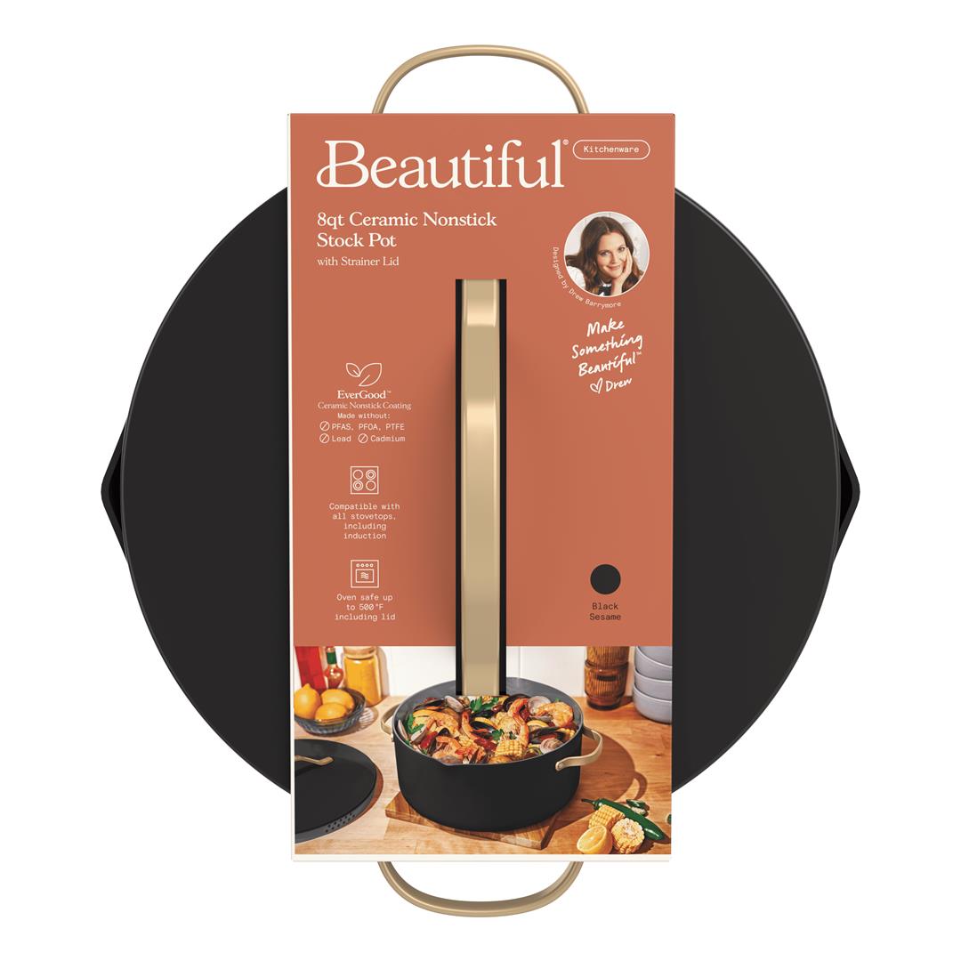 Beautiful 8 Quart Ceramic Non-Stick Stock Pot with Strainer Lid, Black Sesame by Drew Barrymore