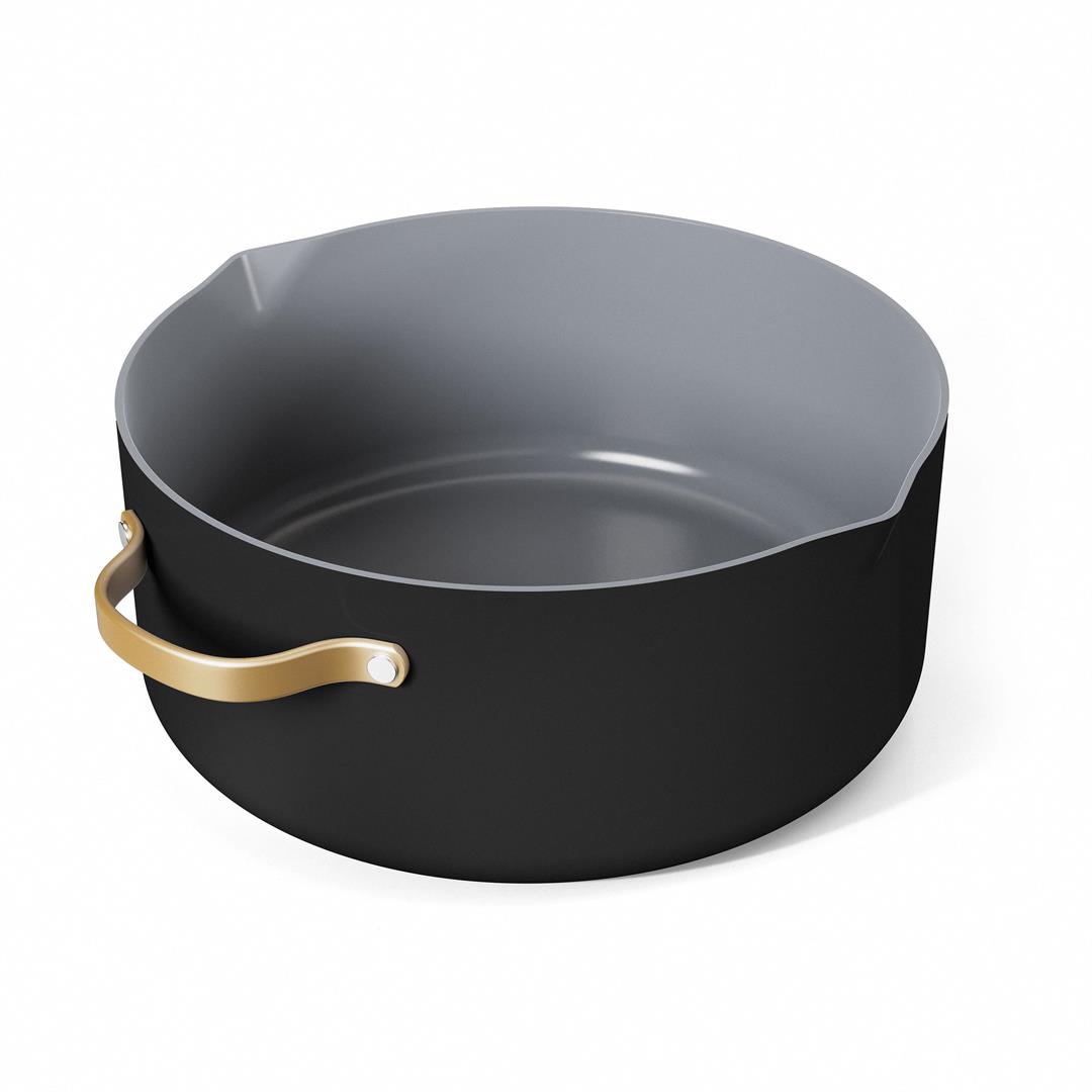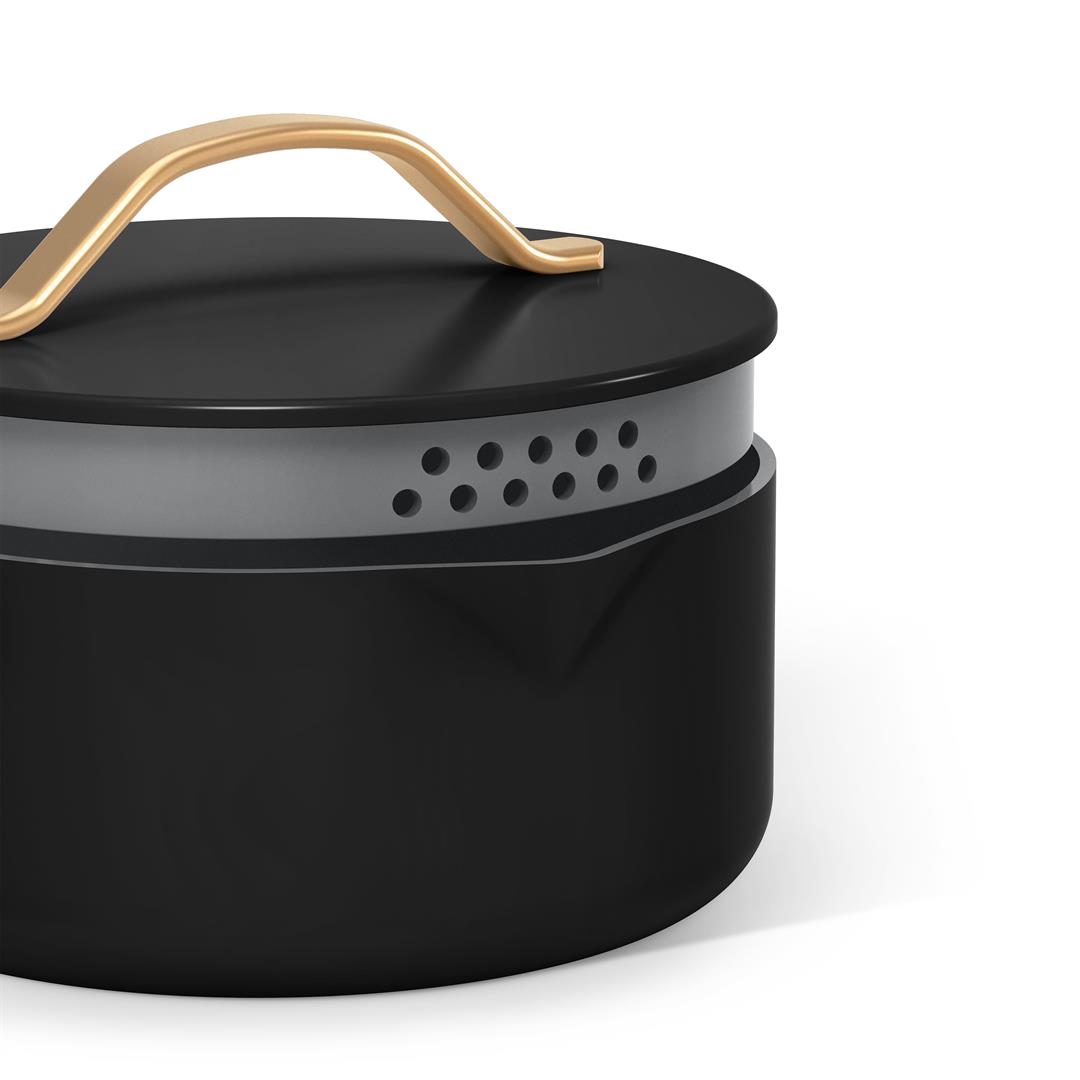 Made with EverGood Ceramic Nonstick Coating Integrated pour spouts and strainer lid Oven safe up to 500F, including the lid Compatible with all stovetops, including induction Durable construction for fast and even heating Sleek design with gold finish handles Dishwasher safe, hand wash recommended