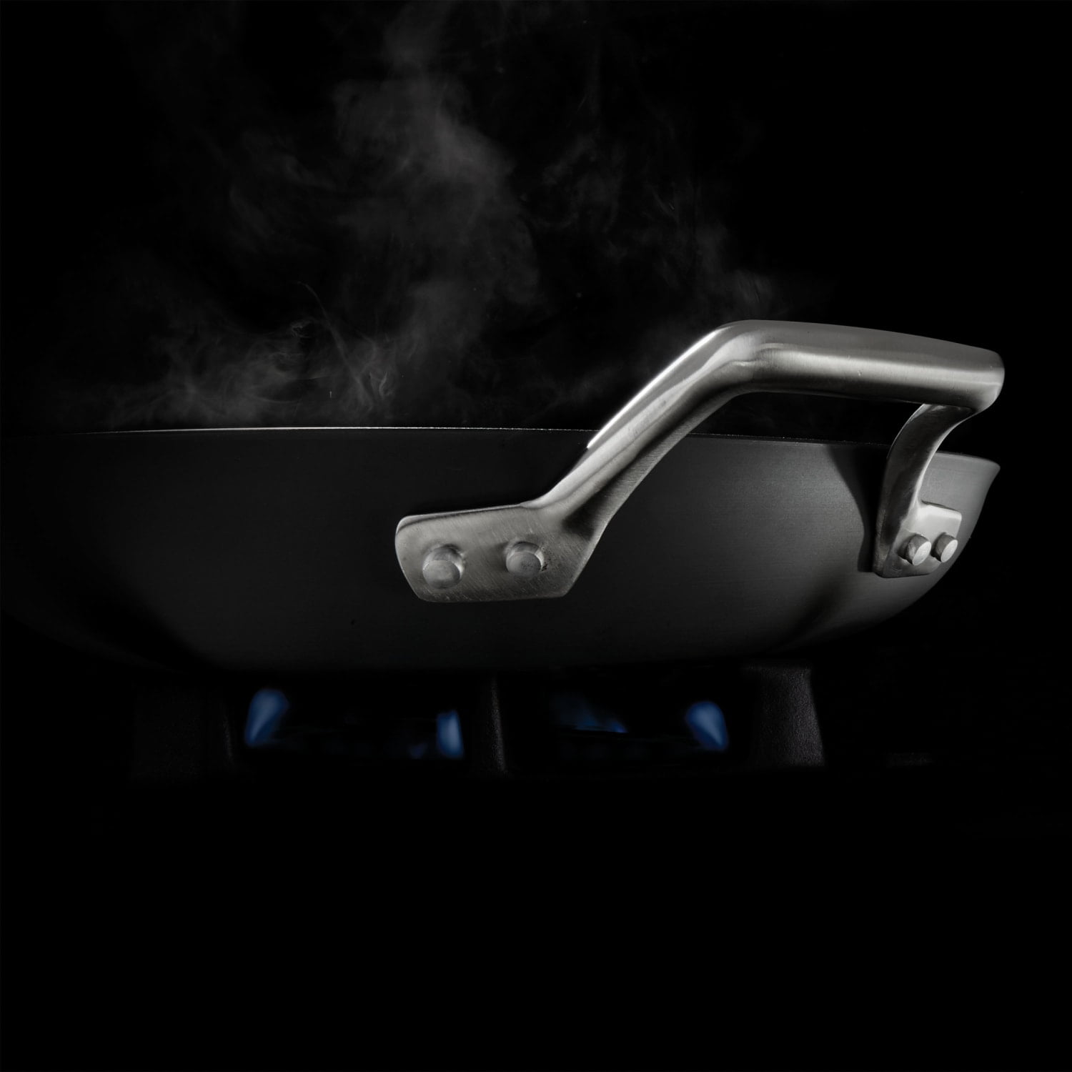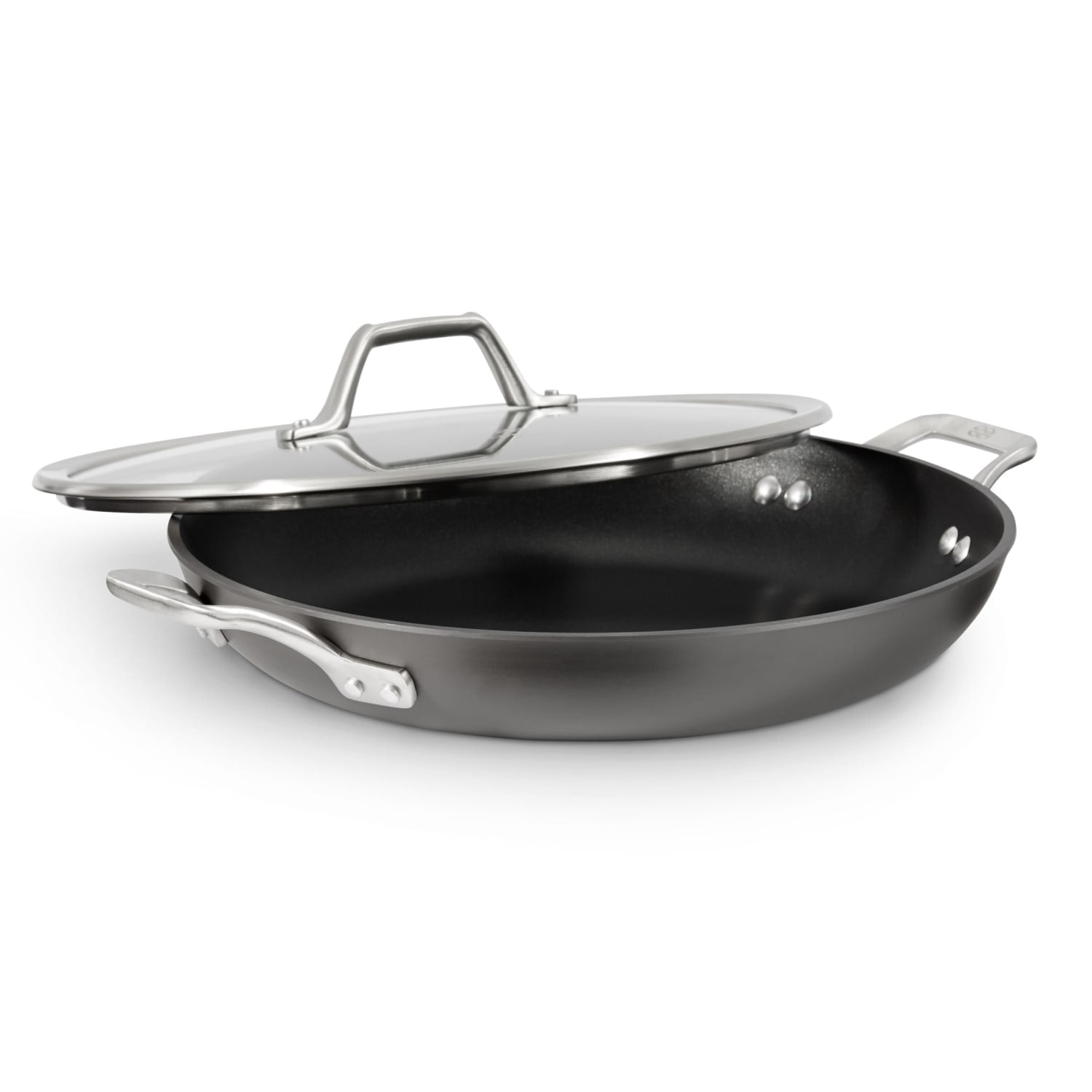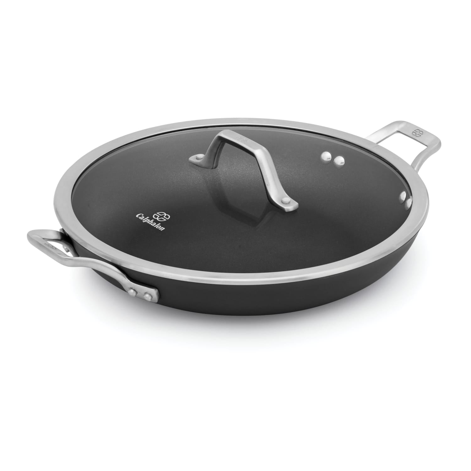 Calphalon Signature Nonstick 12″ Everyday Pan with Cover Crafted from heavy-gauge hard-anodized aluminum for lasting durability Brushed stainless steel handle Use any utensil: Metal whisks, spoons, and spatulas won’t scratch the nonstick surface Dishwasher-safe for easy cleanup Tempered glass cover is oven-safe for finishing recipes or keeping foods warm Limited Lifetime Warranty