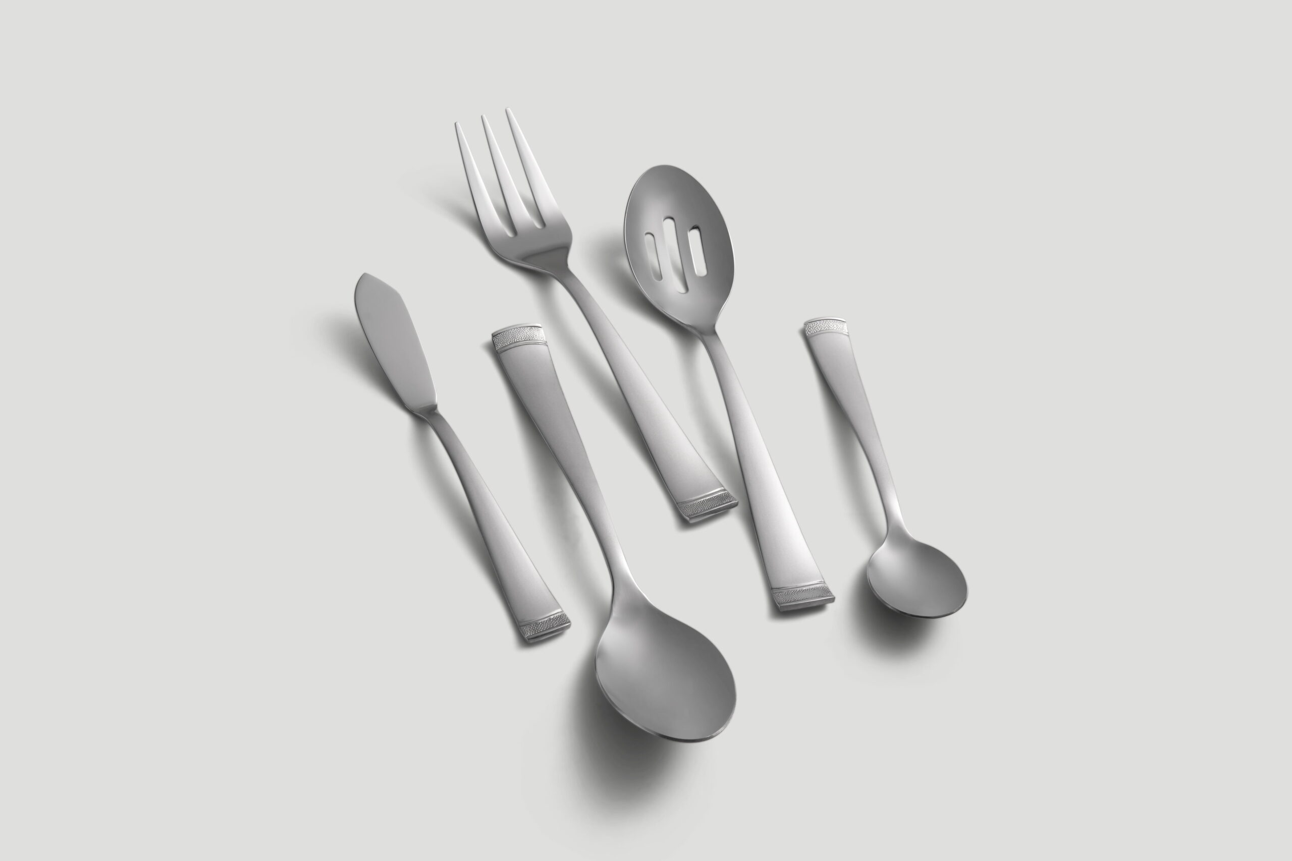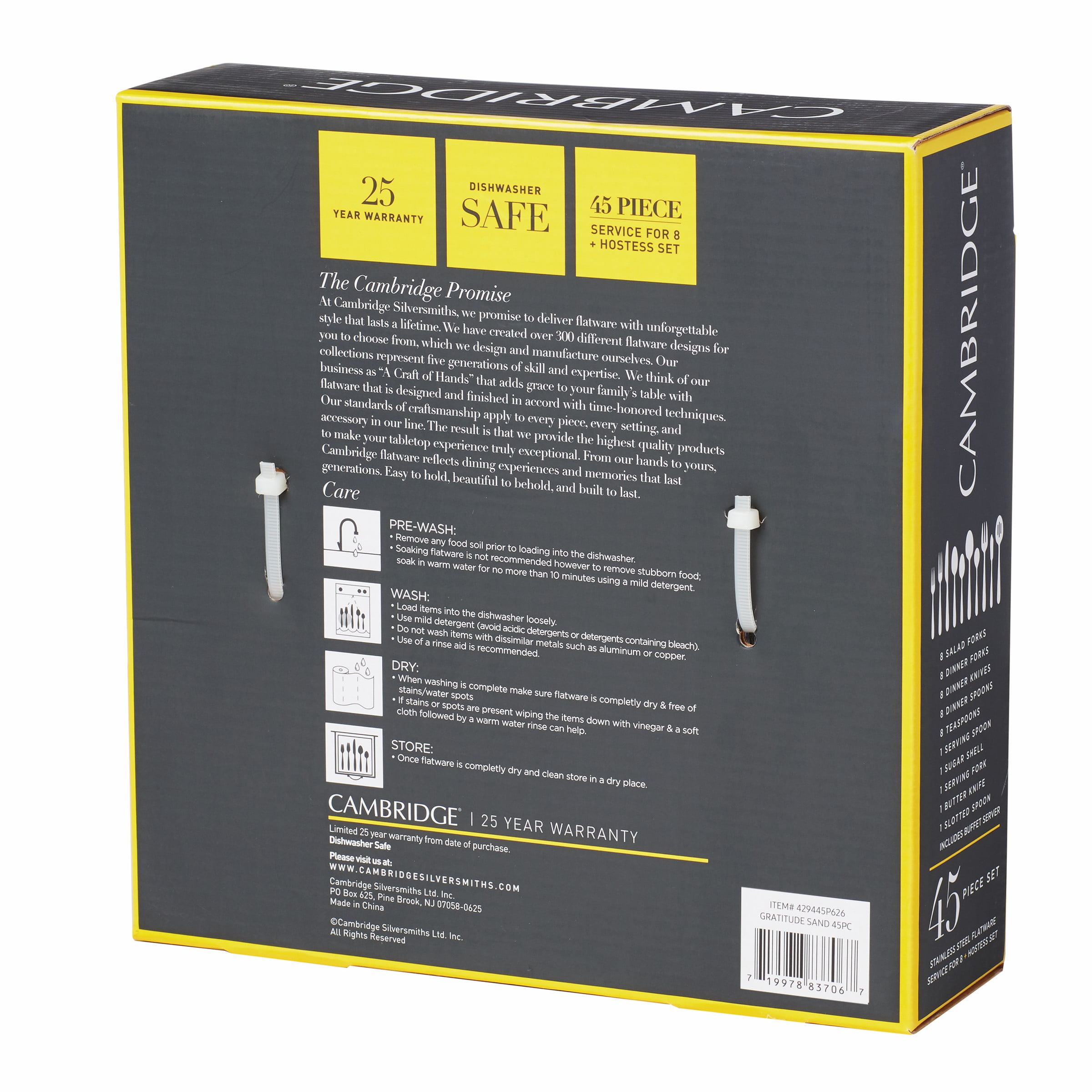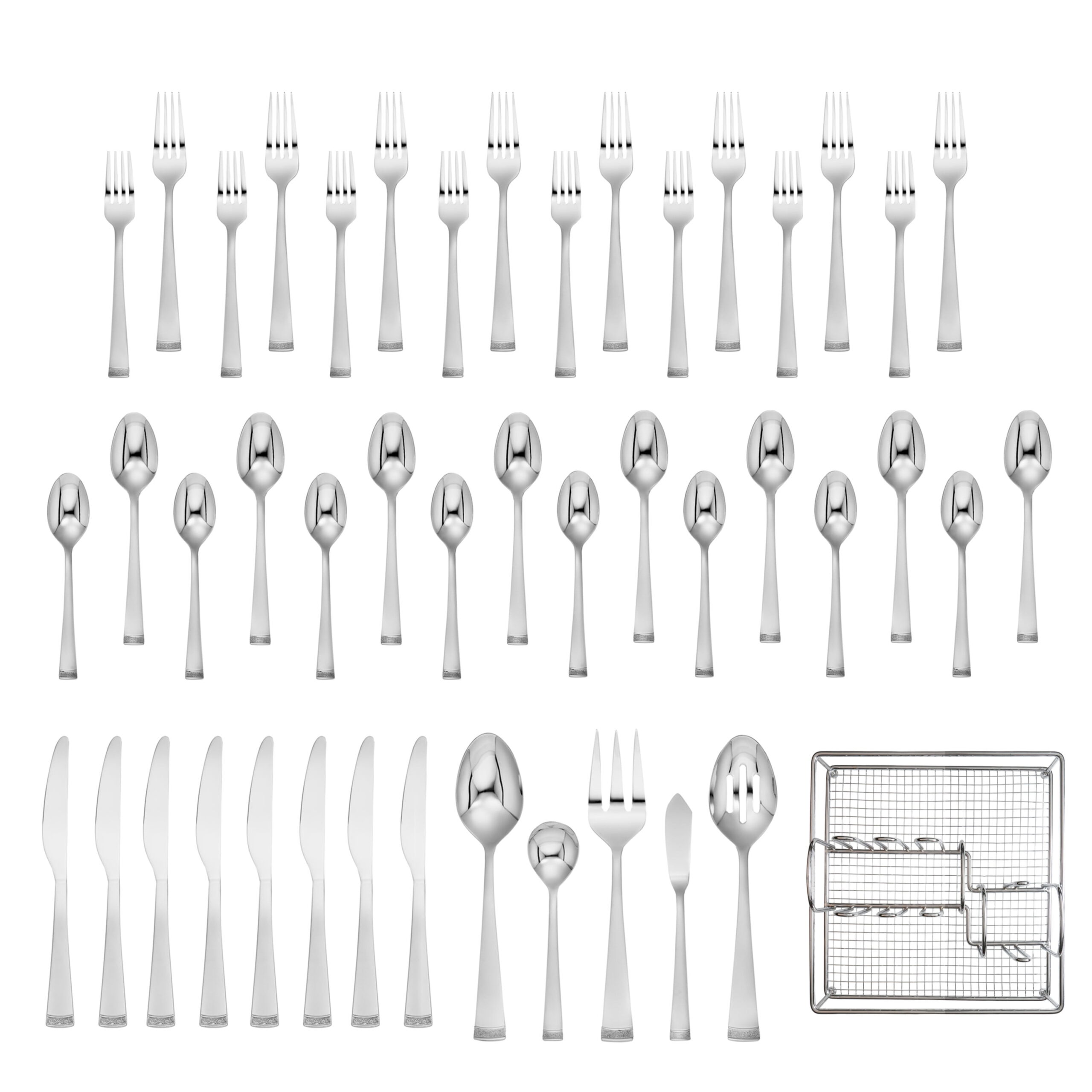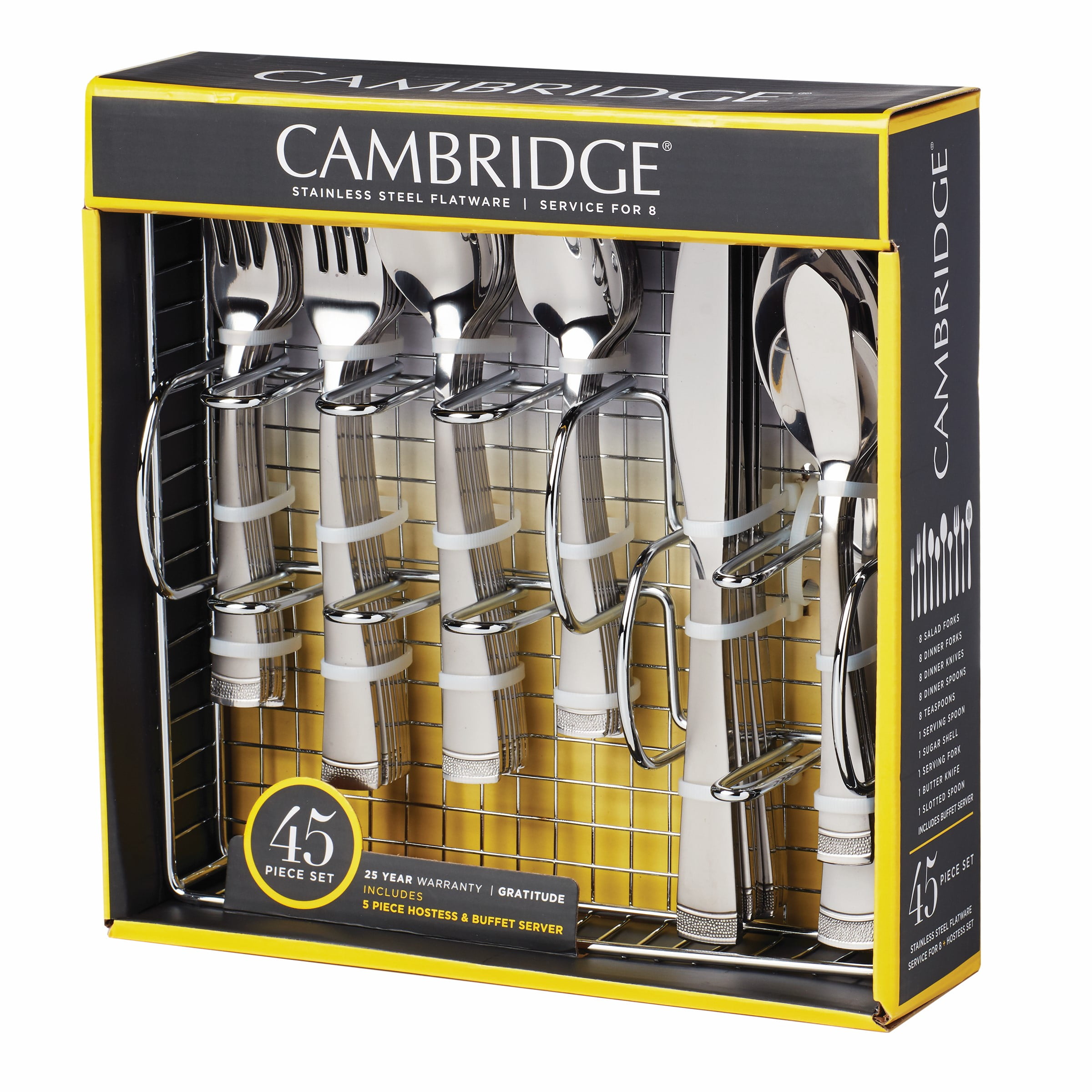 Cambridge Gratitude Sand 45-Piece Stainless Steel Flatware Set with Chrome Buffet (Service for 8) 45 Piece Set includes 8 dinner forks, 8 dinner knives, 8 dinner spoons, 8 teaspoons, 8 salad forks, 1 serving spoon, 1 slotted spoon, 1 serving fork, 1 butter knife, 1 sugar shell in a buffet server. Sand Finish 18/0 Stainless Steel Flatware is Dishwasher Safe. Remove any food soil prior to loading into the dishwasher. Avoid using abrasive cleaning agents such as steel wool and citric acid detergent. Do not soak, clean after use. Buffet Tray can be wiped off with a damp cloth as needed and left to air dry. Buffet Tray included