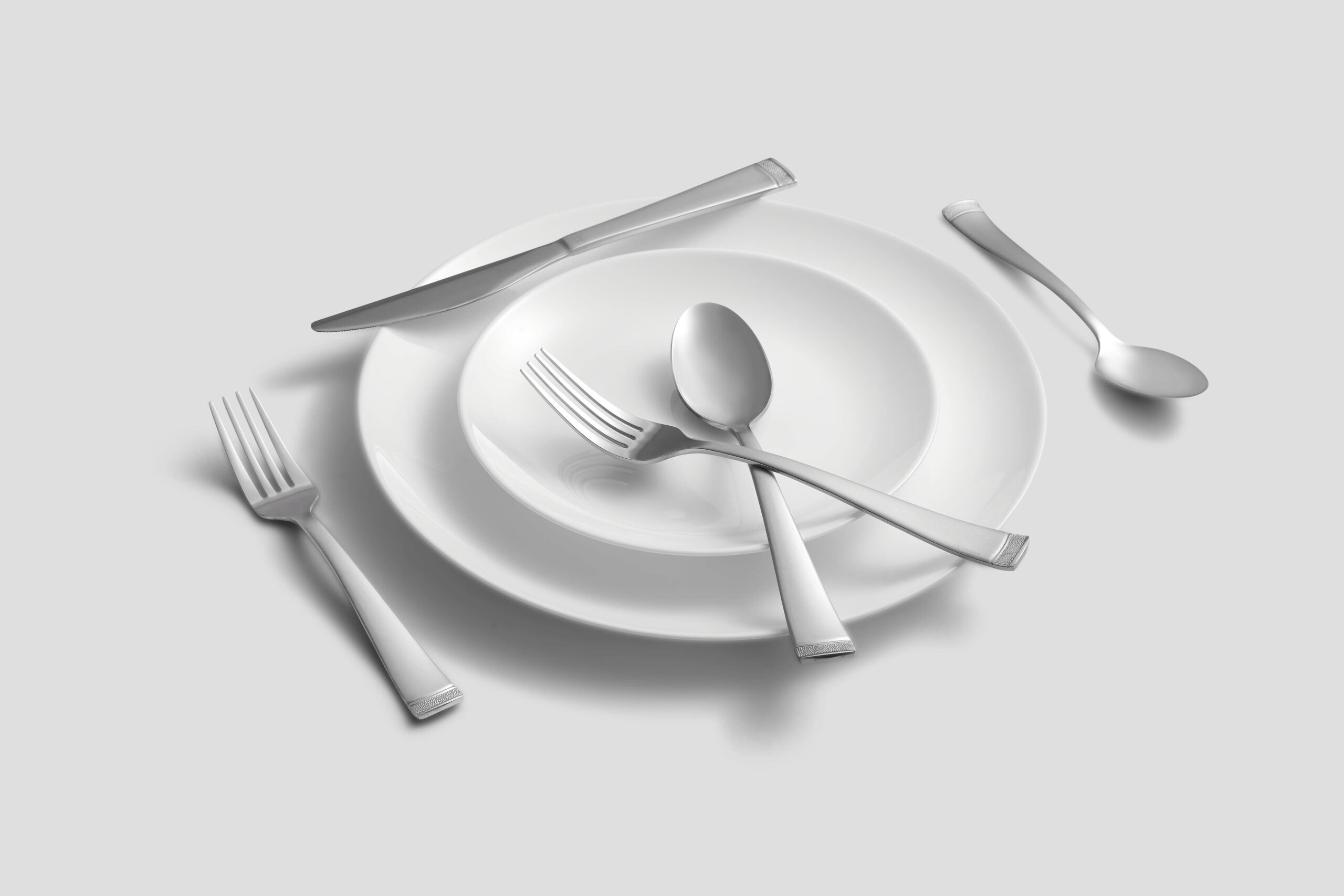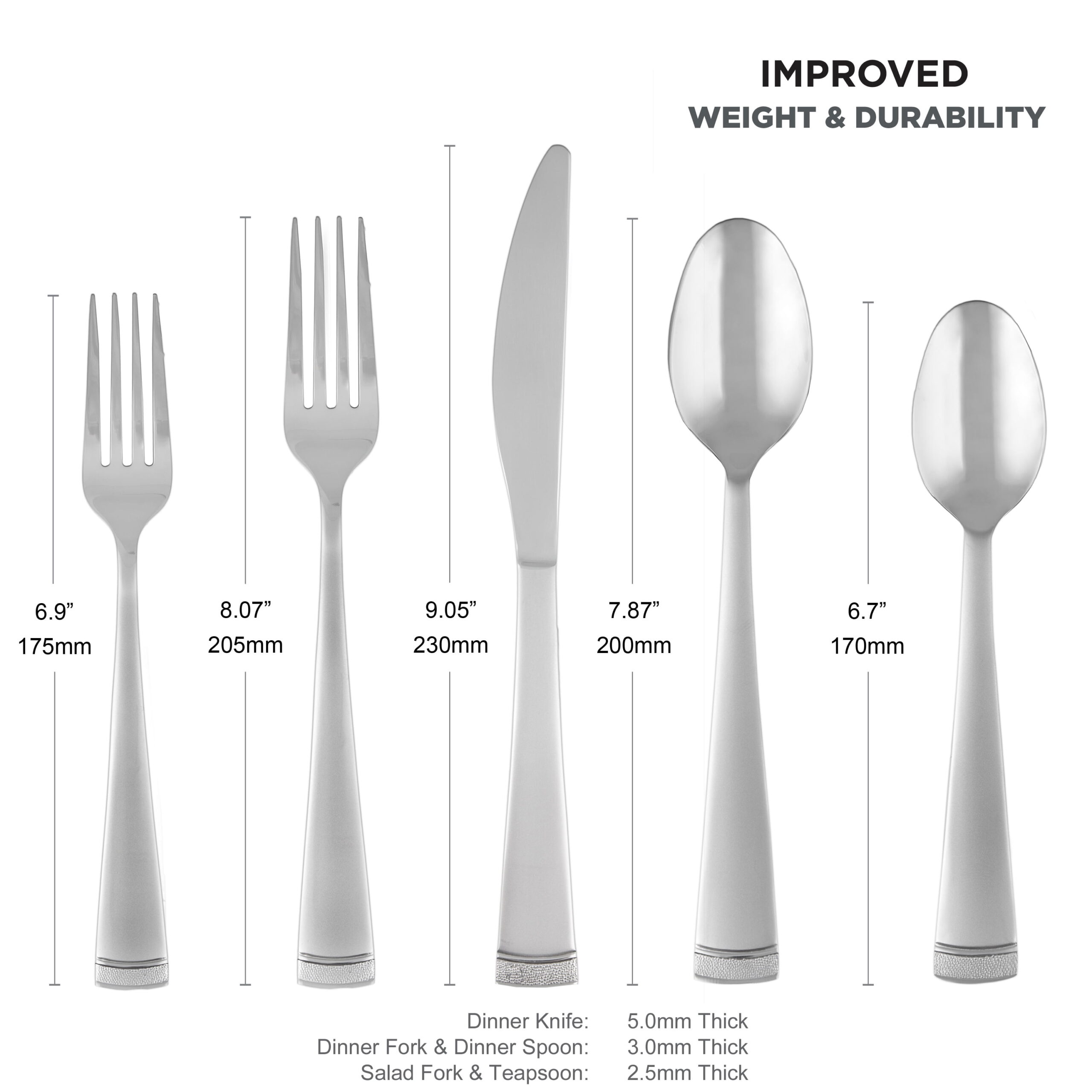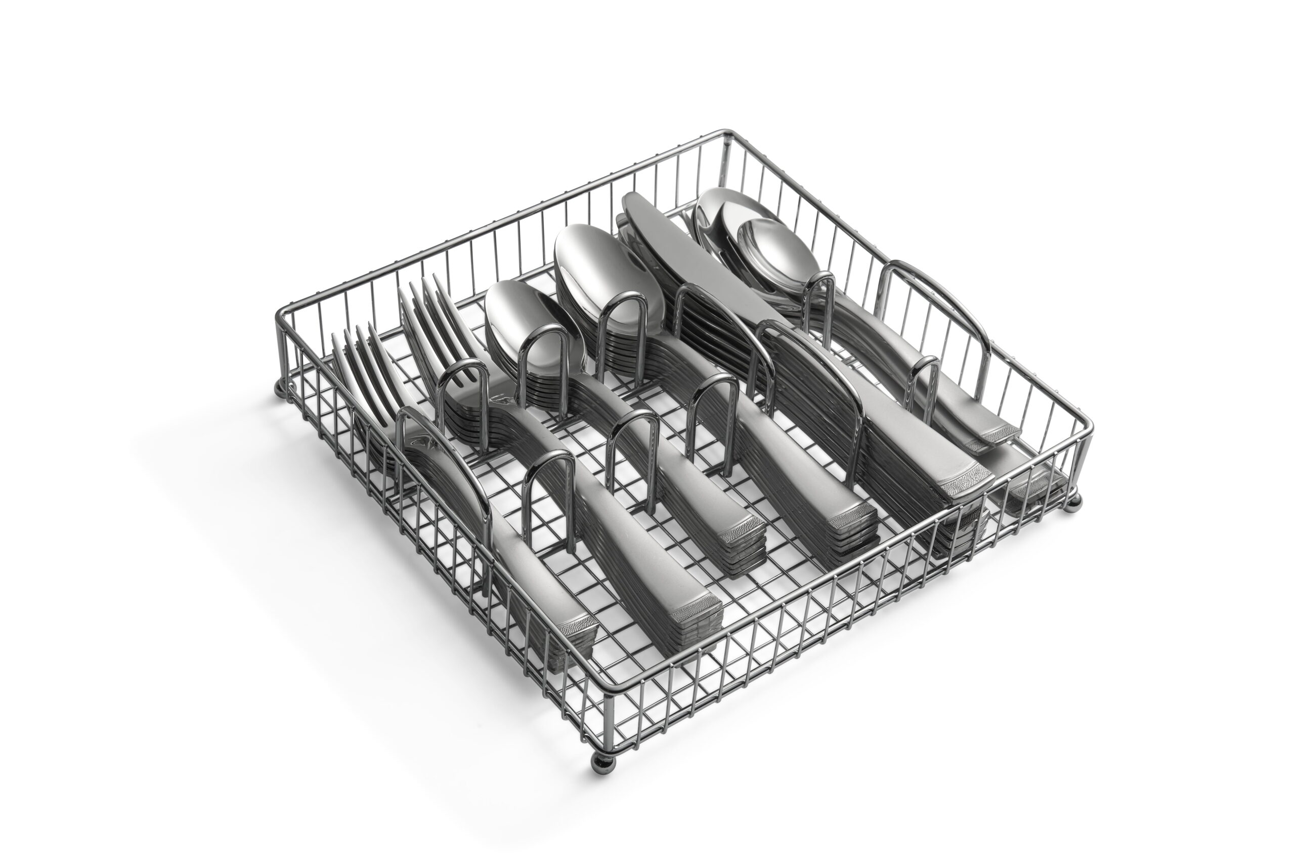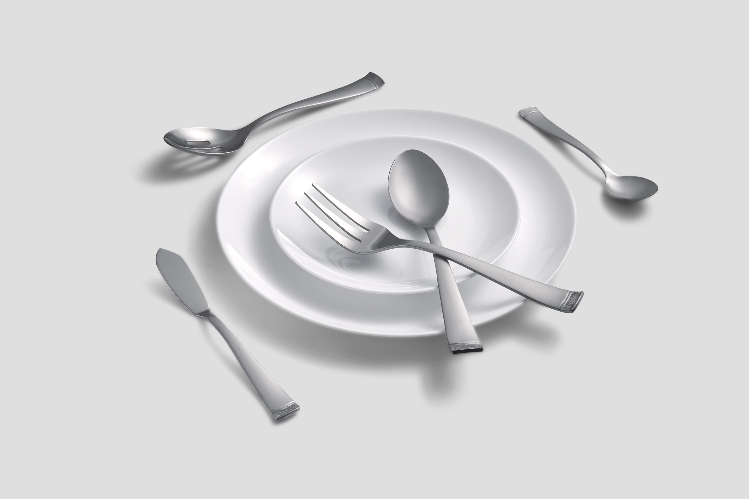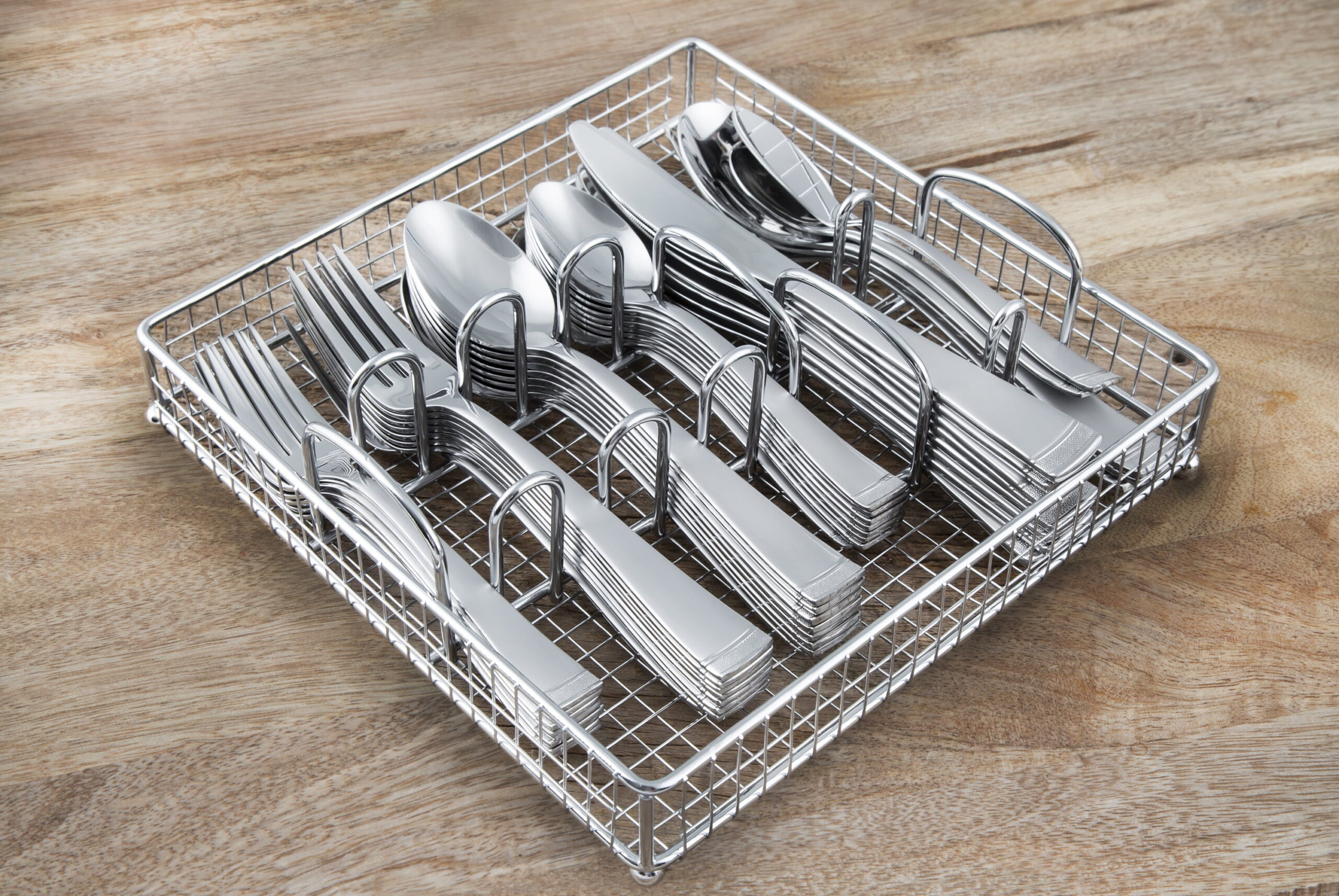 Cambridge Gratitude Sand 45-Piece Stainless Steel Flatware Set with Chrome Buffet (Service for 8) 45 Piece Set includes 8 dinner forks, 8 dinner knives, 8 dinner spoons, 8 teaspoons, 8 salad forks, 1 serving spoon, 1 slotted spoon, 1 serving fork, 1 butter knife, 1 sugar shell in a buffet server. Sand Finish 18/0 Stainless Steel Flatware is Dishwasher Safe. Remove any food soil prior to loading into the dishwasher. Avoid using abrasive cleaning agents such as steel wool and citric acid detergent. Do not soak, clean after use. Buffet Tray can be wiped off with a damp cloth as needed and left to air dry. Buffet Tray included