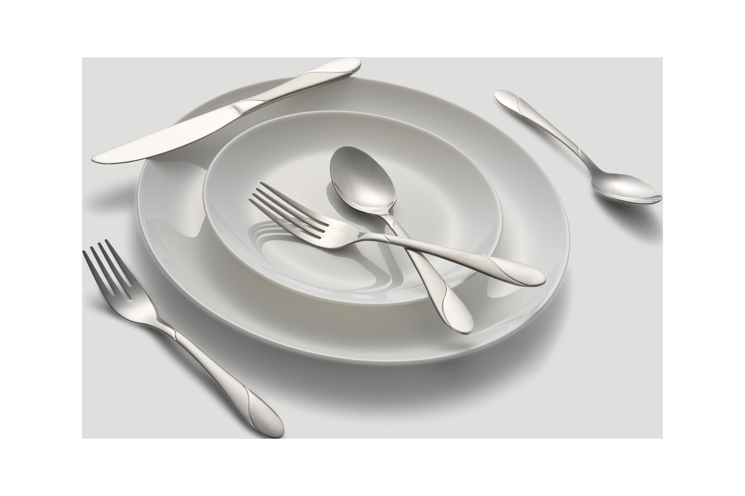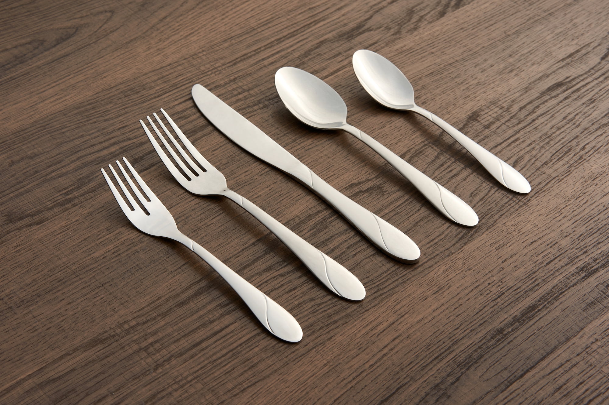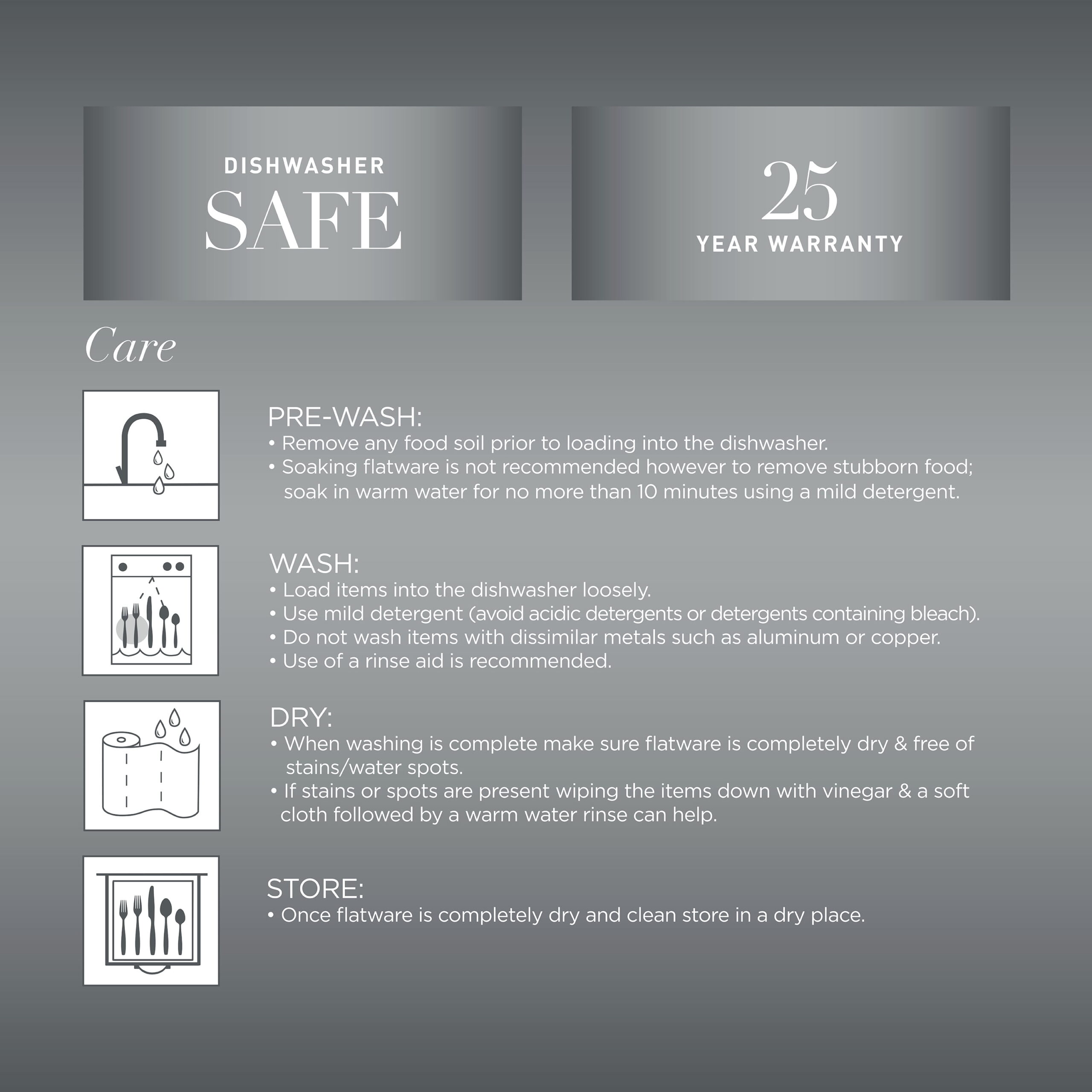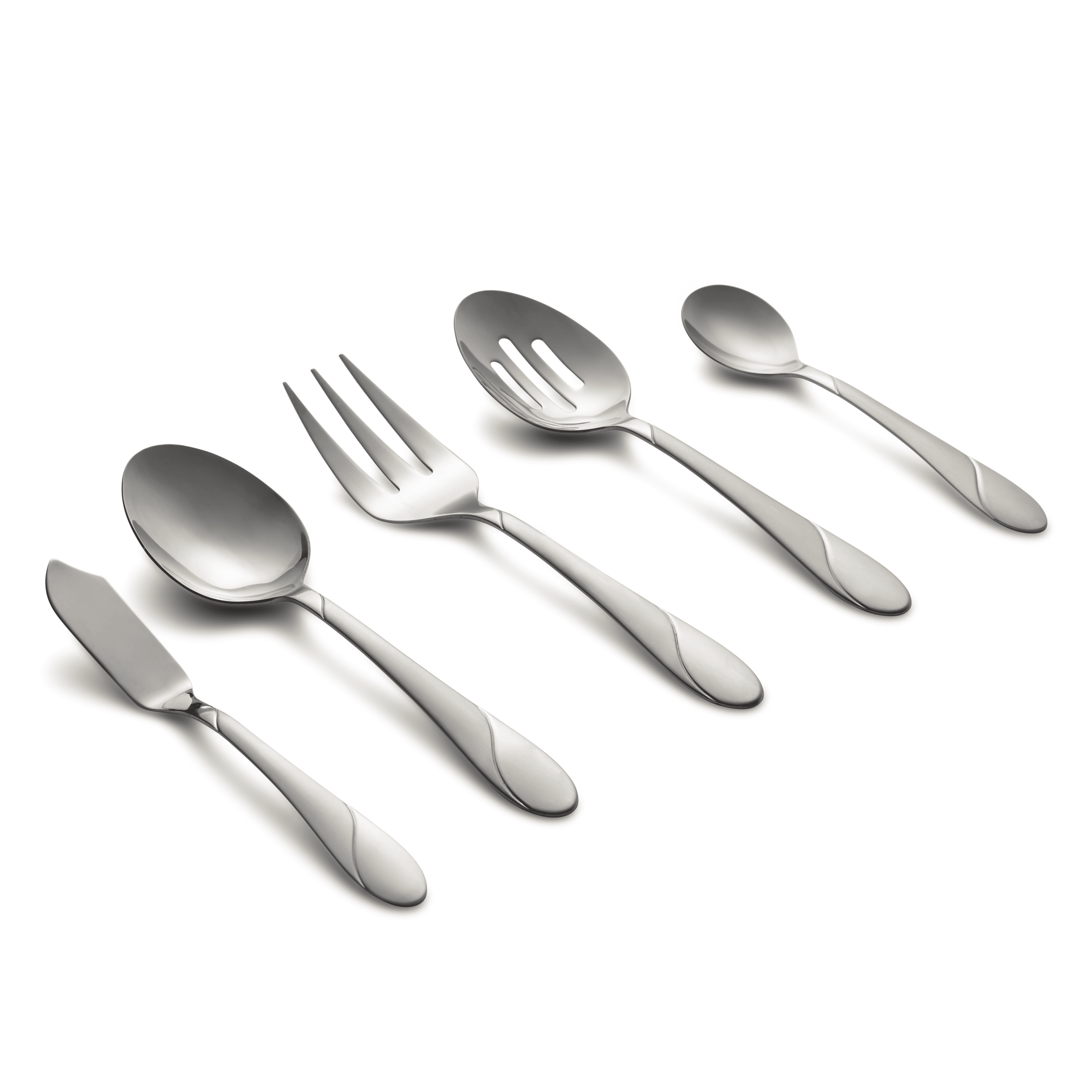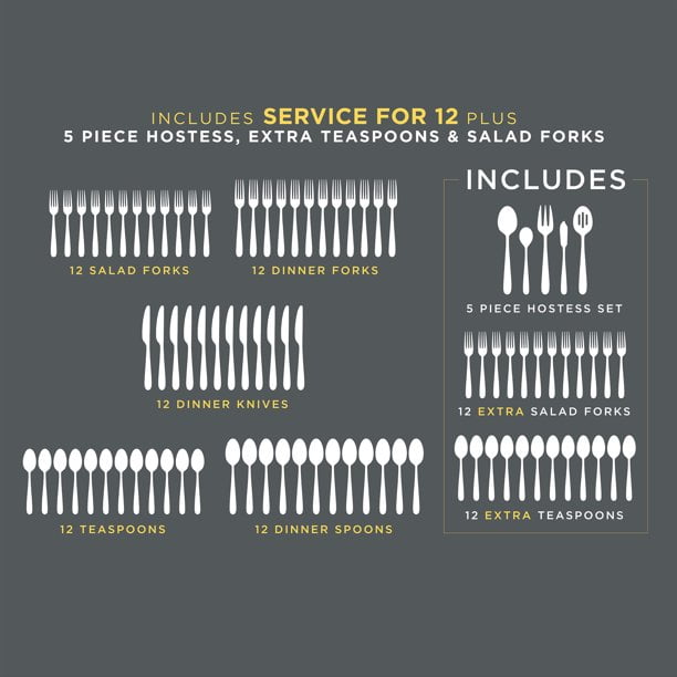 Cambridge Silversmiths Swirl Sand 89-Piece Stainless Steel Flatware Set (Service for 12) Set Includes: 24 salad forks, 24 teaspoons, 12 dinner forks, 12 dinner knives, 12 dinner spoons, 1 serving spoon, 1 slotted serving spoon, 1 cold meat fork, 1 sugar shell, 1 butter knife. Service for 12 Material content: 18/0 stainless steel Dishwasher safe Never needs polishing