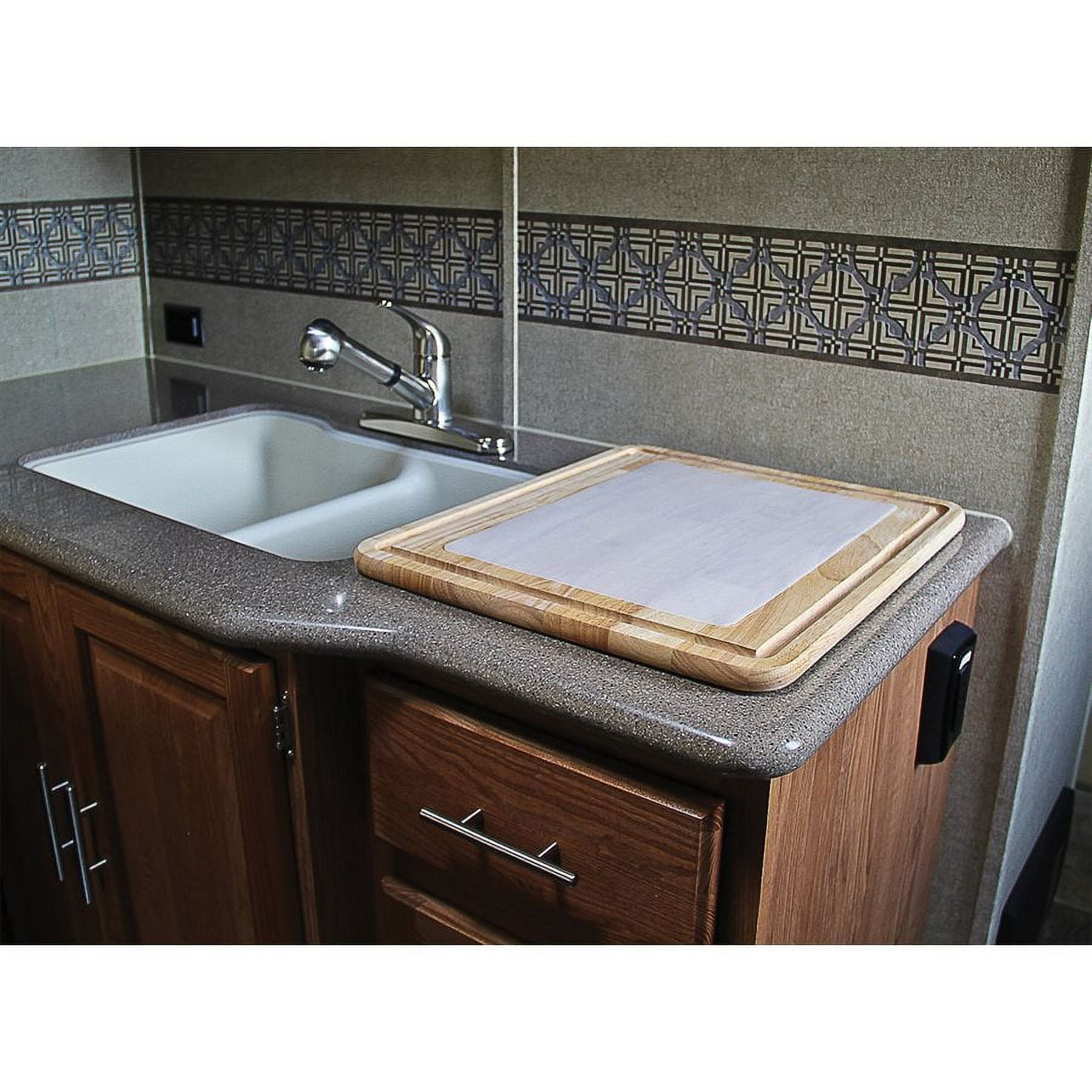 Camco’s Stove Topper and Cutting Board won’t nick or dull knives. The non-skid backing holds the board securely in place and doubles as a serving tray. A flexible cutting mat is included for easy pouring of chopped fruits and vegetables. Selected hardwoods are treated to preserve and enhance the natural beauty of wood. Designed to fit 3 or 4 burner stoves in your RV. Great for use in the home kitchen. Color: Wood Brown; Model#: 43753