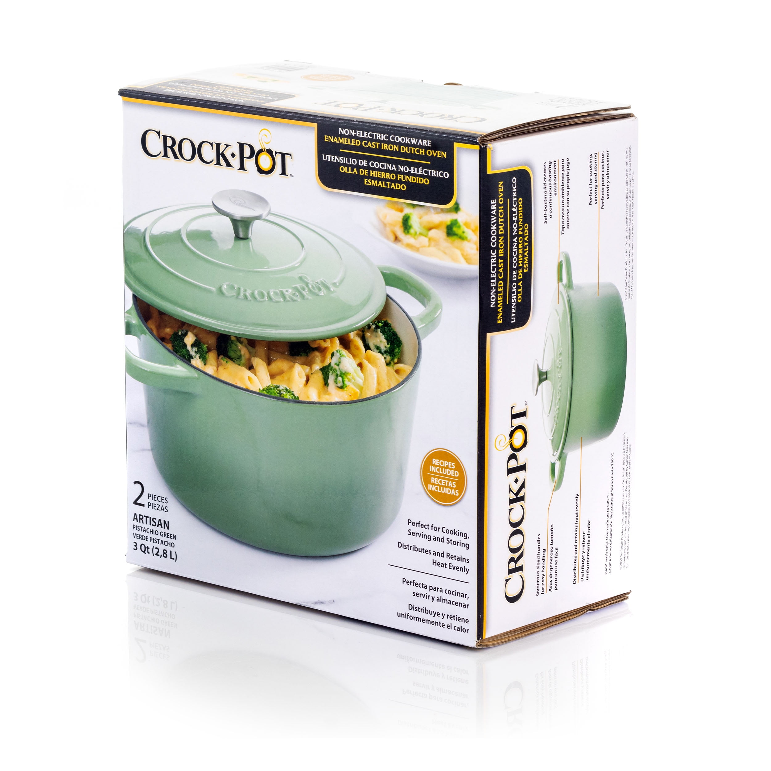 Crock-Pot Artisan 2 Piece 3 Quarts Enameled Cast Iron Dutch Oven in Pistachio Green 124966.02 The Crock-Pot Artisan 2 Piece 3 Quarts Enameled Cast Iron Dutch Oven is ideal for delicious dinners for any occasion. This cookware’s self-basting lid creates a continuous basting environment for more flavorful meals. It distributes and retains heat evenly and allows for a multitude of cooking techniques. The oversized handles and stainless steel knob provides a sturdy grip for easy handling and carrying. This cooking pot is perfectly suitable for a large array of dishes such as baked potato soup, spiced rice, and warm curry for the family to enjoy!