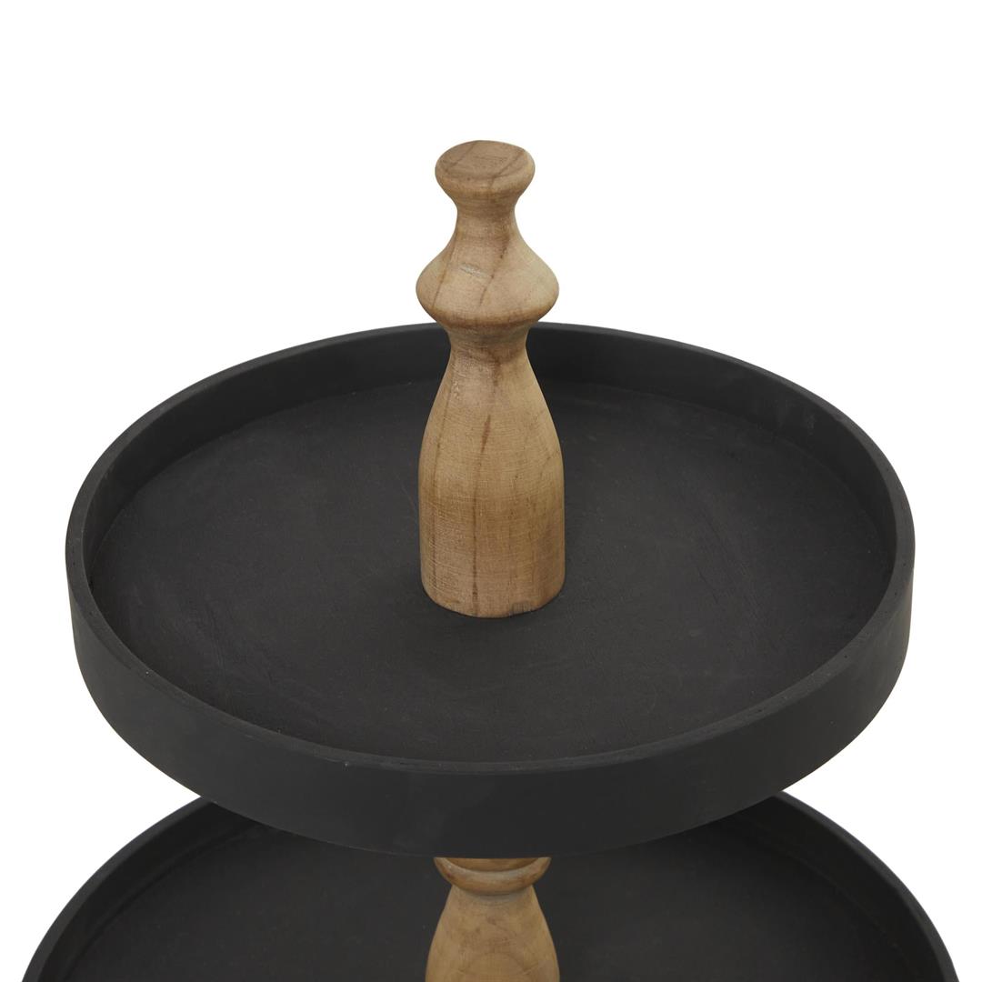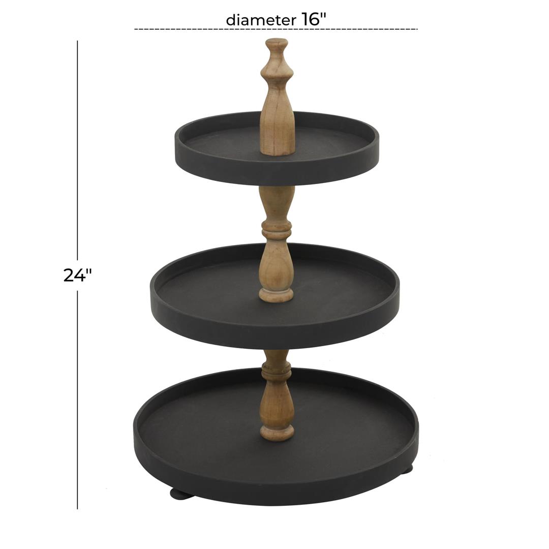 Infuse your home with cozy charm, where weathered textures, rustic finishes, and warm earthy tones create a wholesome atmosphere The black decorative tiered server is made from fir wood, plywood, and MDF, ensuring a sturdy construction Featuring a matte black finish with a brown wooden post, this round tiered serving tray is perfect for a farmhouse or country cottage theme Elevated edges on the wood tiered server provide an anti-slip feature, ensuring secure storage for kitchen accessories and trinkets The black wood tiered server measures 16.25L x 16.25W x 24.30H inches, and weighs 5.82 lbs Matte black decorative server for weddings highlights a round structure resting on four feet with a segmented wood post Wipe clean with a dry cloth The farmhouse dessert tower display is crafted by carving and assembling wood trays set on orb stands to form its structure Farmhouse style DecMode 16″ x 24″ Black Wood 3 Tiered Server with Wood Post, 1-Piece makes a perfect addition to any home