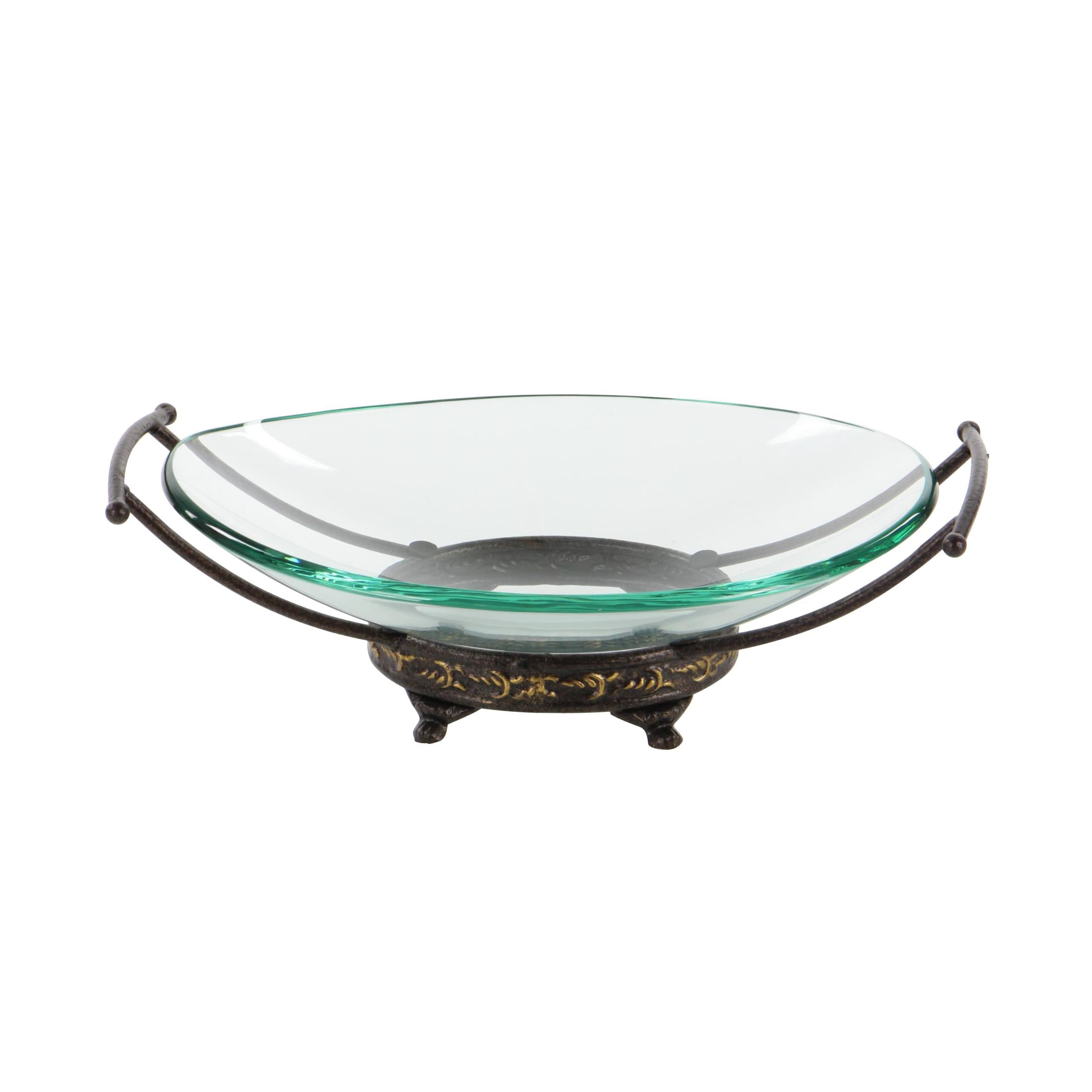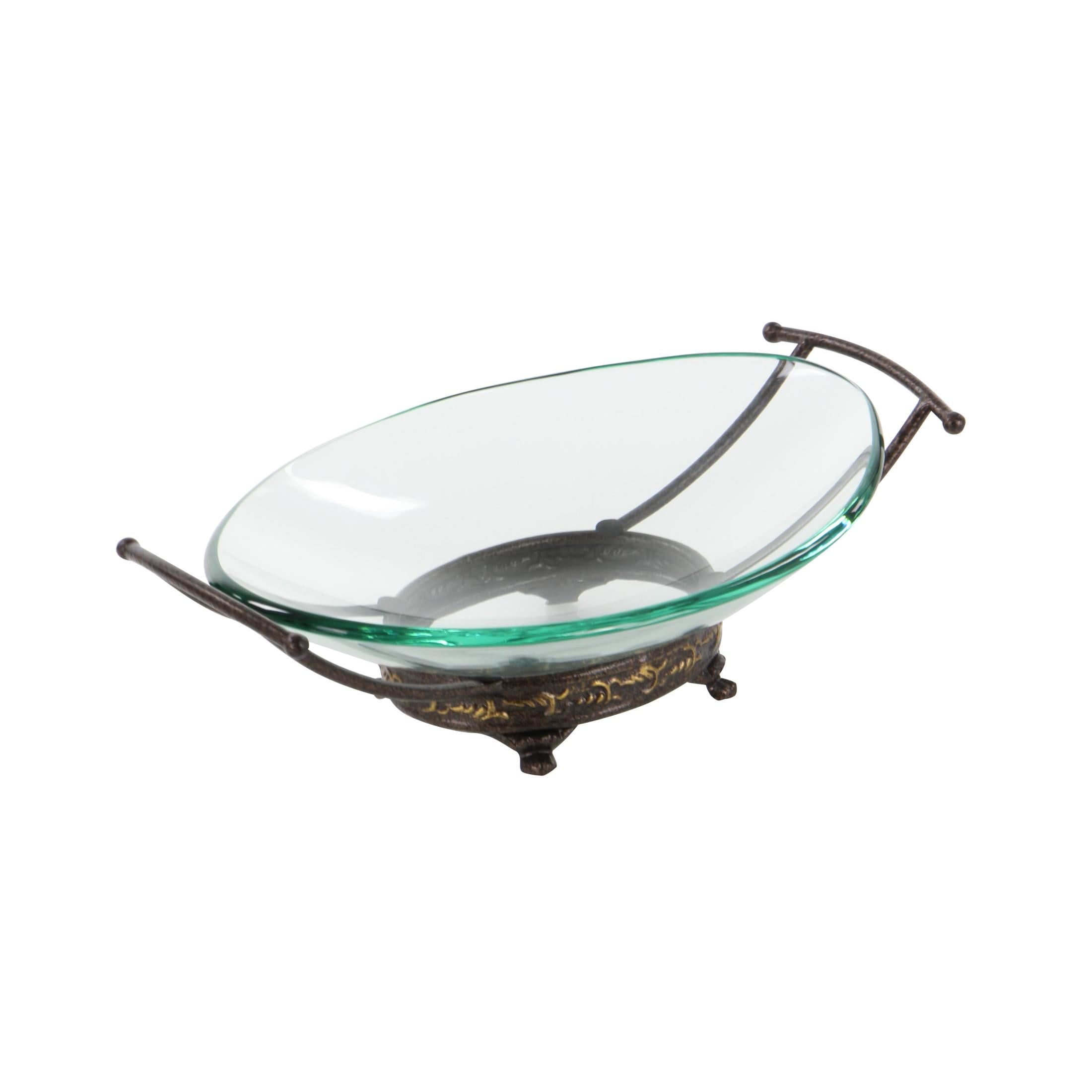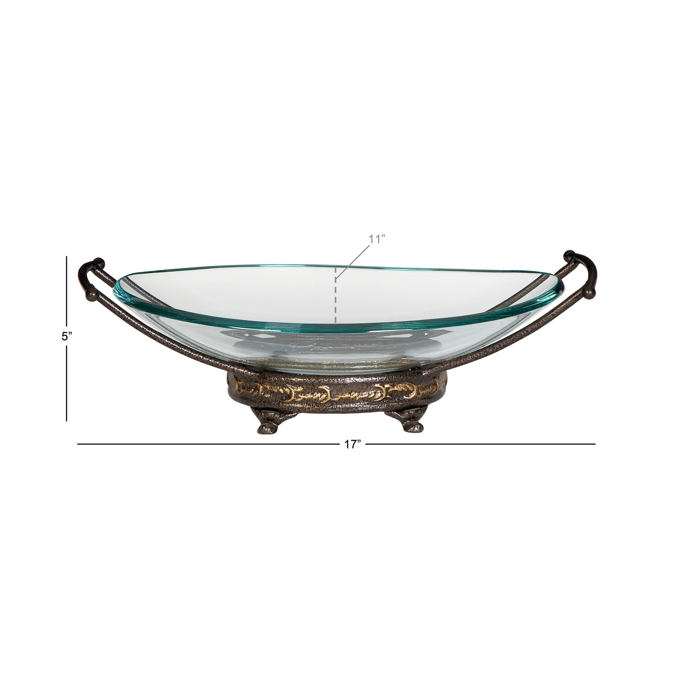 Designed with timeless sophistication, rich old-world textures and warm hues come together for a refined classic taste of luxury The clear decorative serving bowl is crafted from a durable iron frame and thick glass body, ensuring sturdy quality construction This oval serving bowl for kitchen showcases a glass bowl with a polished clear finish, beautifully contrasted by a brown metal base with gold accents This tempered glass serving bowl flaunts a metal stand adorned with a gold calligraphic motif, adding elegance to any surface The clear tempered glass serving bowl measures 17L x 11W x 5H inches, and weighs 7.20 lbs The polished clear decorative serving bowl boasts intricate patterns, with its oval shape accentuated by the delicate gold details on the base Wipe clean with a dry cloth The traditional serving bowl for table combines a welded metal base with precisely cut and molded glass to create an elegant piece Traditional style DecMode 17″ x 5″ Clear Tempered Glass Kitchen Serving Bowl with Brown Metal Base, 1-Piece makes a perfect addition to any home