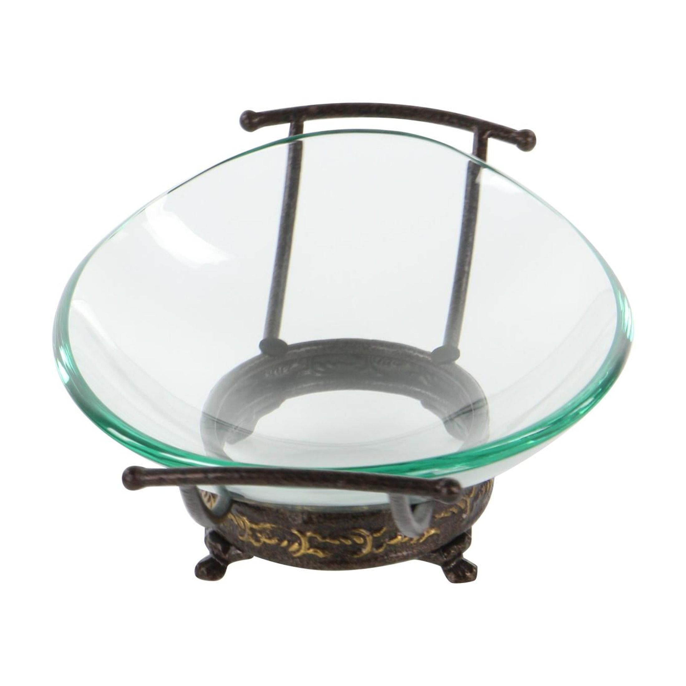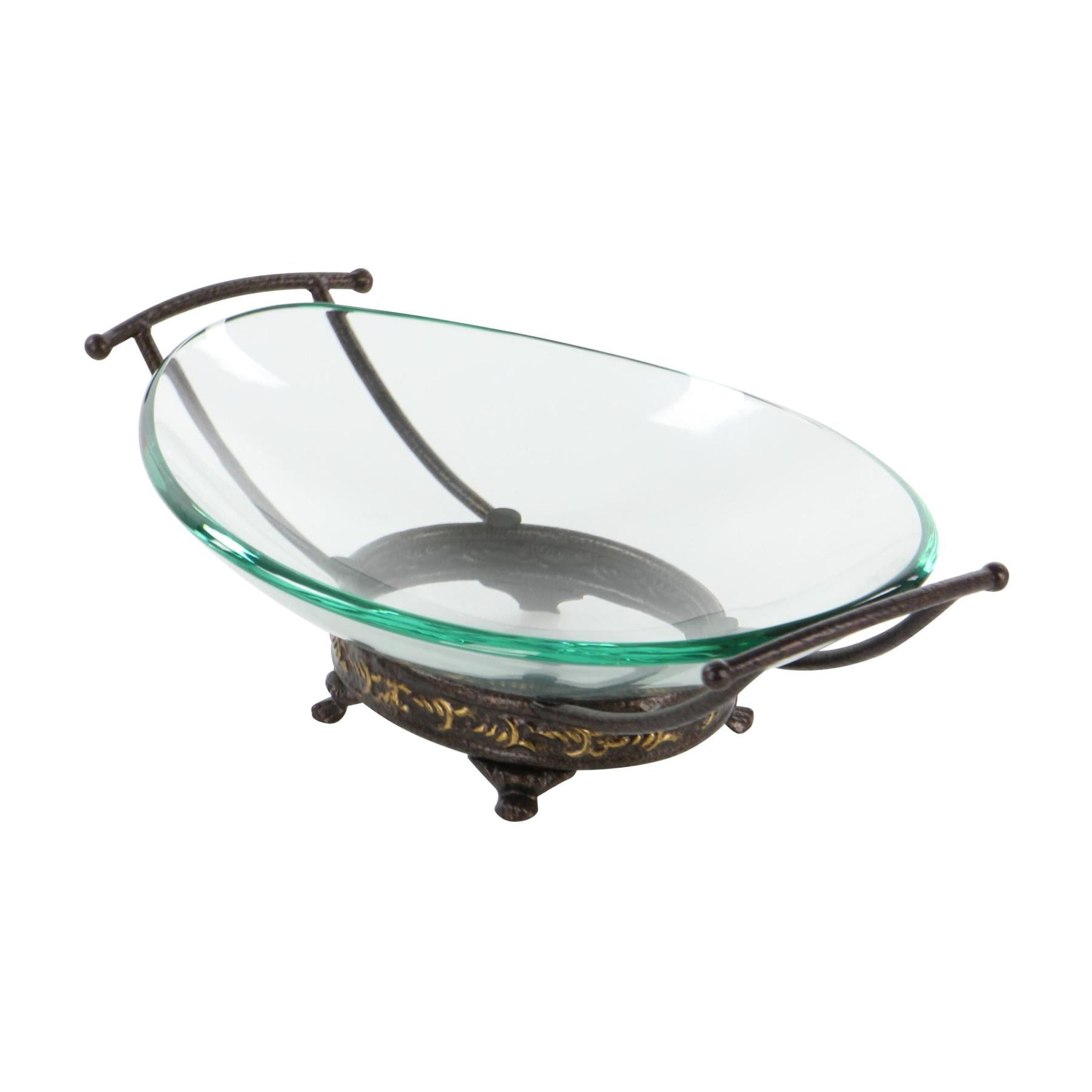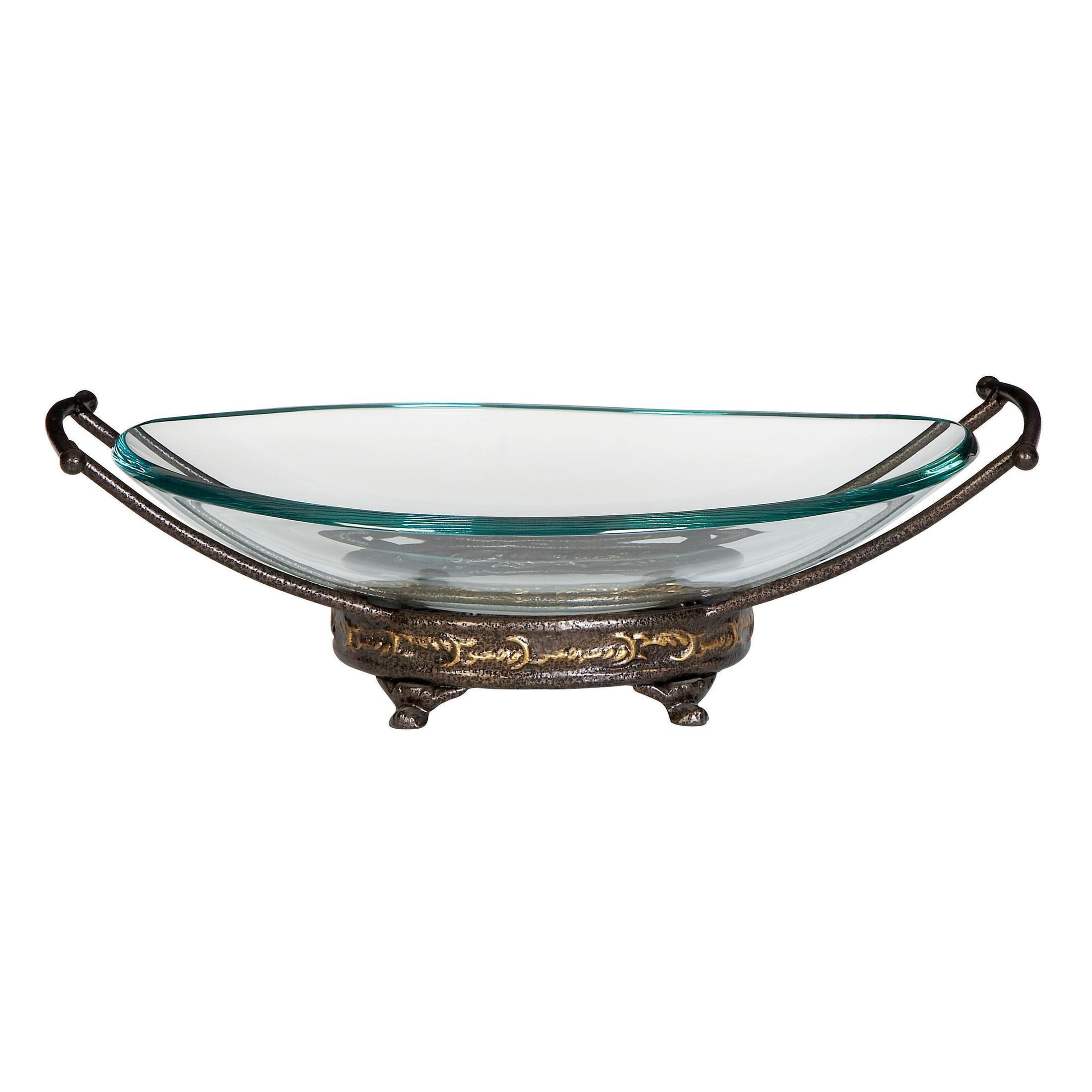 Designed with timeless sophistication, rich old-world textures and warm hues come together for a refined classic taste of luxury The clear decorative serving bowl is crafted from a durable iron frame and thick glass body, ensuring sturdy quality construction This oval serving bowl for kitchen showcases a glass bowl with a polished clear finish, beautifully contrasted by a brown metal base with gold accents This tempered glass serving bowl flaunts a metal stand adorned with a gold calligraphic motif, adding elegance to any surface The clear tempered glass serving bowl measures 17L x 11W x 5H inches, and weighs 7.20 lbs The polished clear decorative serving bowl boasts intricate patterns, with its oval shape accentuated by the delicate gold details on the base Wipe clean with a dry cloth The traditional serving bowl for table combines a welded metal base with precisely cut and molded glass to create an elegant piece Traditional style DecMode 17″ x 5″ Clear Tempered Glass Kitchen Serving Bowl with Brown Metal Base, 1-Piece makes a perfect addition to any home
