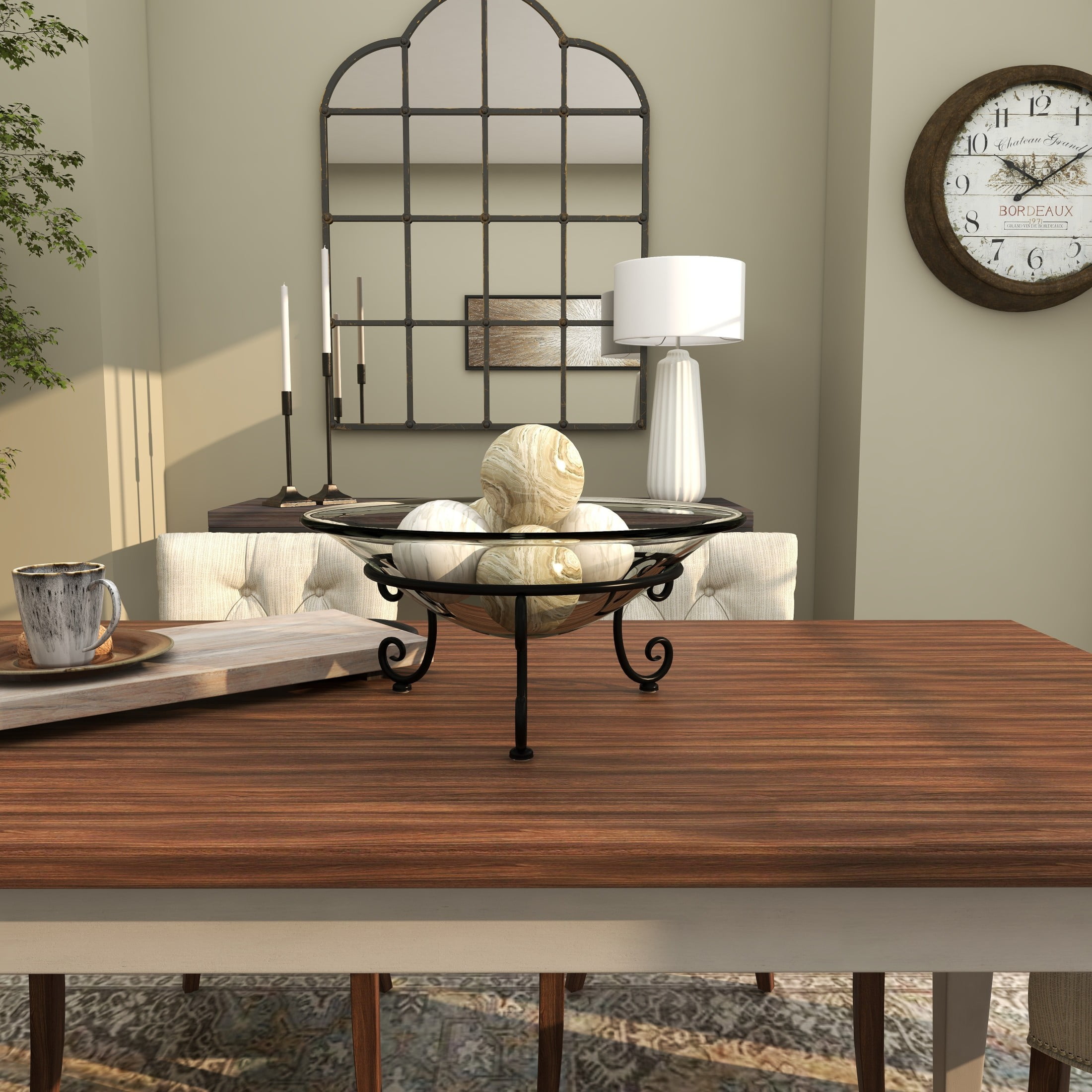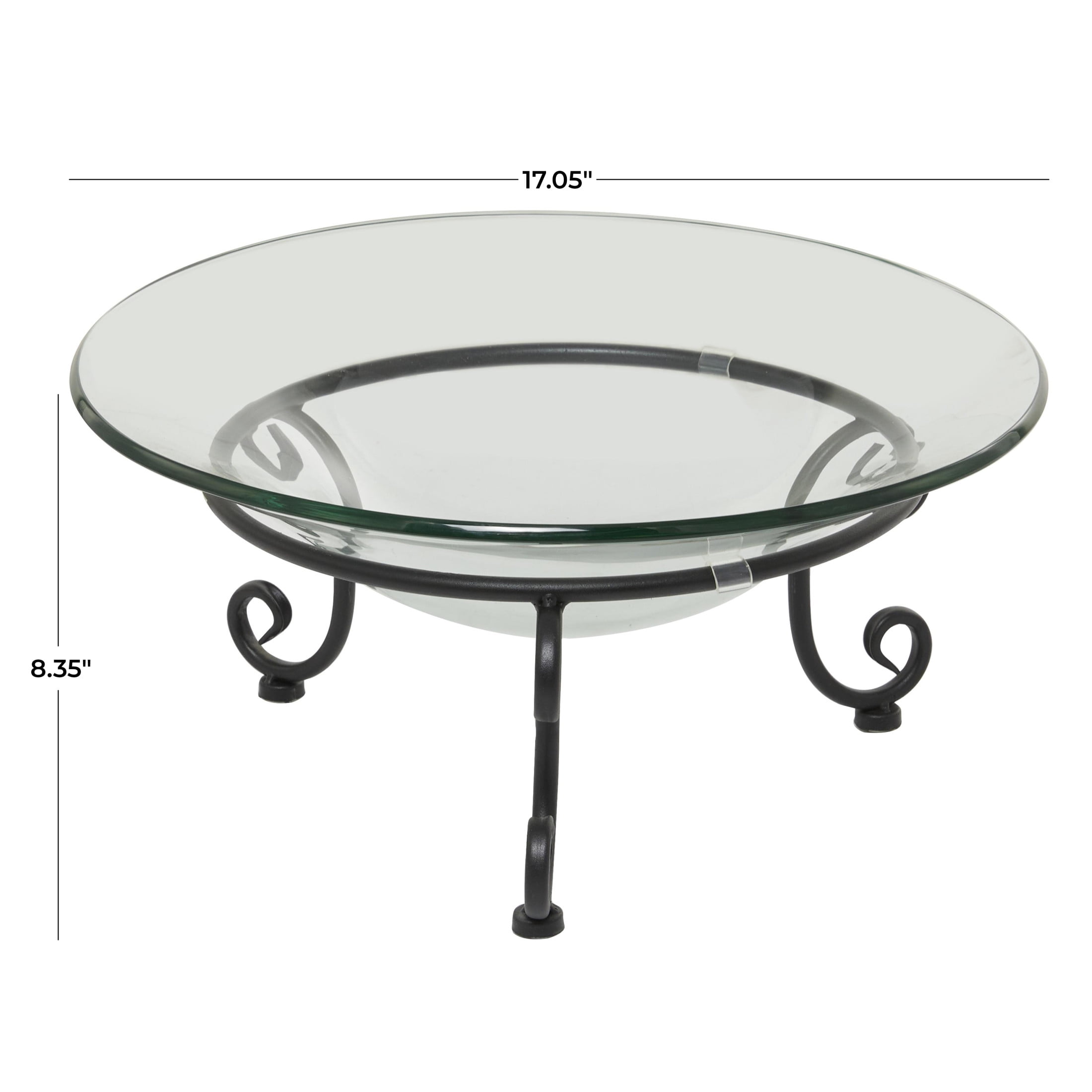 Designed with timeless sophistication, rich old-world textures and warm hues come together for a refined classic taste of luxury The clear decorative serving bowl is crafted from quality tempered glass and iron for a durable construction This round serving bowl for kitchen showcases a polished clear finish on the glass bowl with a black frame stand, highlighting its elegant simplicity The tempered glass serving bowl boasts a wide setting elevated on a sturdy iron stand for an impressive display The clear tempered glass serving bowl measures 17.05L x 16.95W x 8.35H inches, and weighs 8.37 lbs The polished clear decorative serving bowl exhibits intricate scroll patterns on the metal stand that complement its sleek round shape Wipe clean with a dry cloth The traditional serving bowl for table is crafted with precisely cut and molded tempered glass with a welded metal base for lasting beauty Traditional style DecMode 17″ x 8″ Clear Tempered Glass Kitchen Serving Bowl with Black Metal Scroll Stand, 1-Piece makes a perfect addition to any home