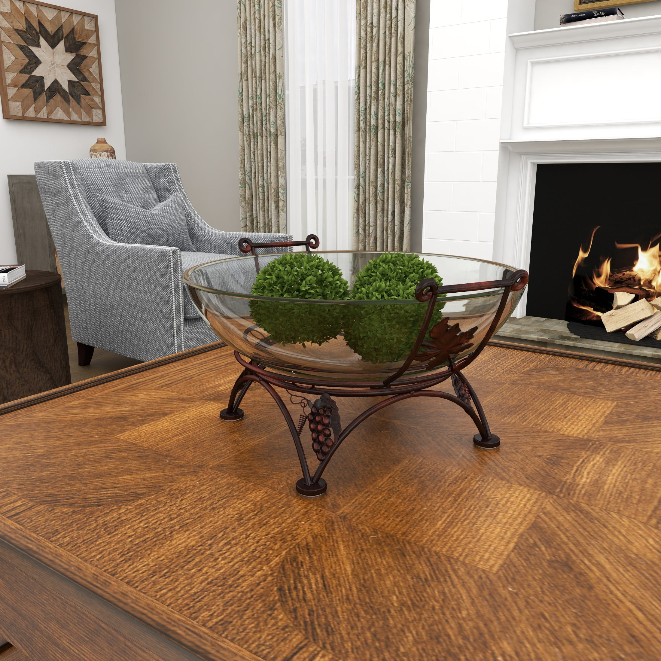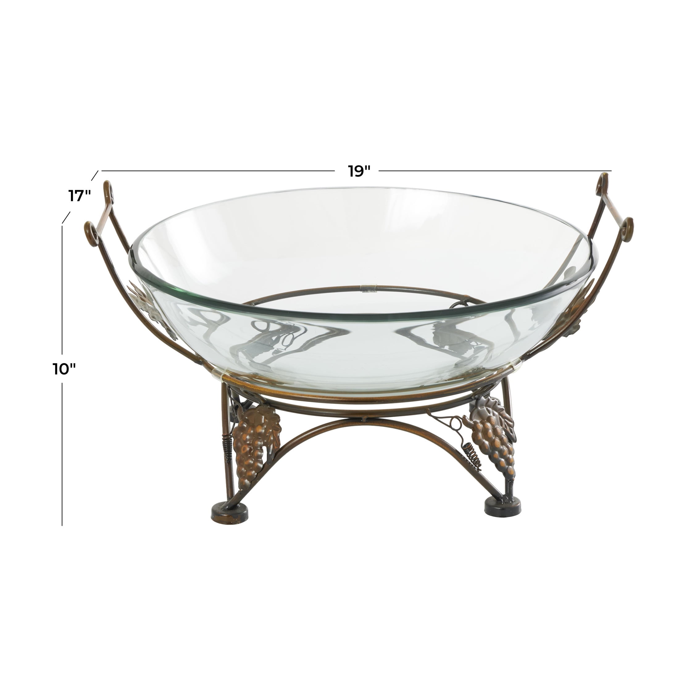 Designed with timeless sophistication, rich old-world textures and warm hues come together for a refined classic taste of luxury The clear decorative serving bowl is crafted from sturdy glass paired with durable iron materials, ensuring longevity and style This round serving bowl for kitchen showcases a clear glass bowl with a polished finish on a copper frame stand, adding elegance to any kitchen setting This tempered glass serving bowl features exquisite wrought iron grapevine designs and sturdy bar handles for easy carrying The clear tempered glass serving bowl measures 19L x 17W x 10H inches, and weighs 14.05 lbs The polished clear decorative serving bowl boasts intricate grape patterns and a smooth round shape that enhances its visual appeal Wipe clean with a dry cloth The traditional serving bowl for table is crafted with a molded glass bowl mounted atop a carefully welded metal leg structure Traditional style DecMode 19″ x 10″ Clear Tempered Glass Kitchen Serving Bowl with Copper Metal Grapes Base, 1-Piece makes a perfect addition to any home