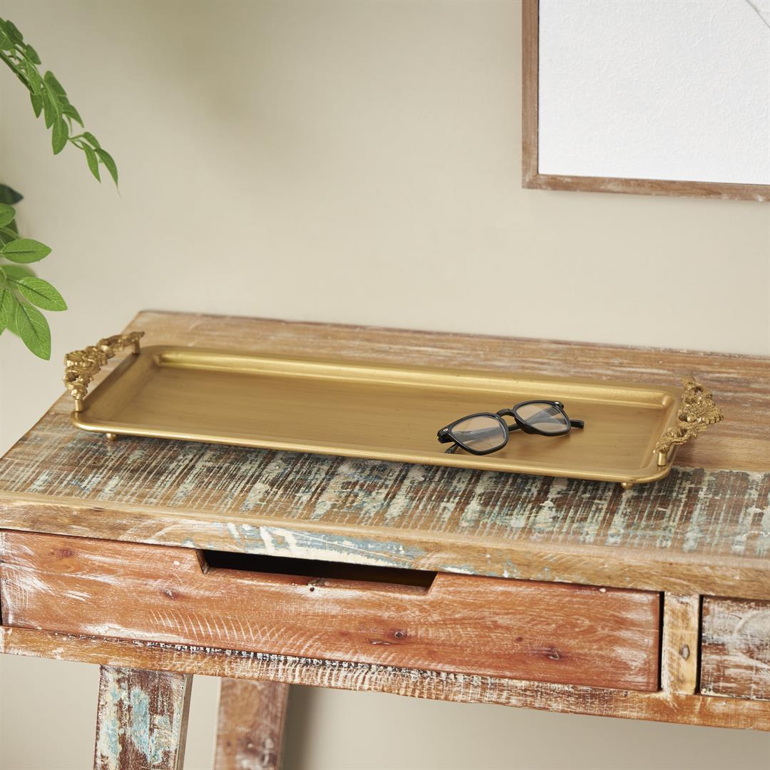 DecMode 24″ x 9″ Bronze Metal Brushed Tray with Antique Scrolled Handles, 1-Piece is a unique addition to your stylish home. Use this metal tray on a cabinet or console to organize or hold small decorative items like sculptures, candles, or accessories. This item ships in 1 carton. Please note that this item is for decorative purposes only and is not food safe. Suitable for indoor use only. This item ships fully assembled in one piece. This is a single bronze colored ottoman tray. Natural style.