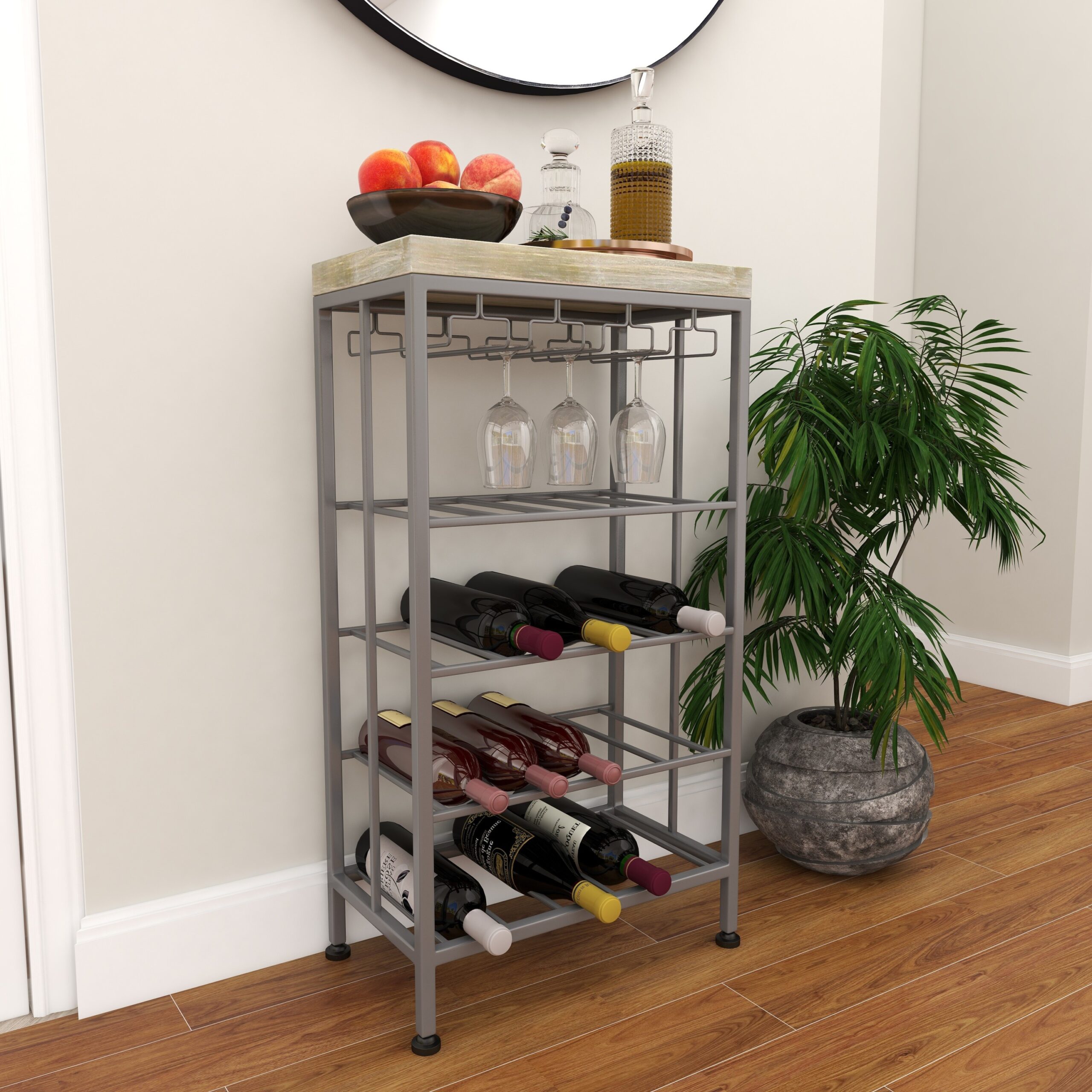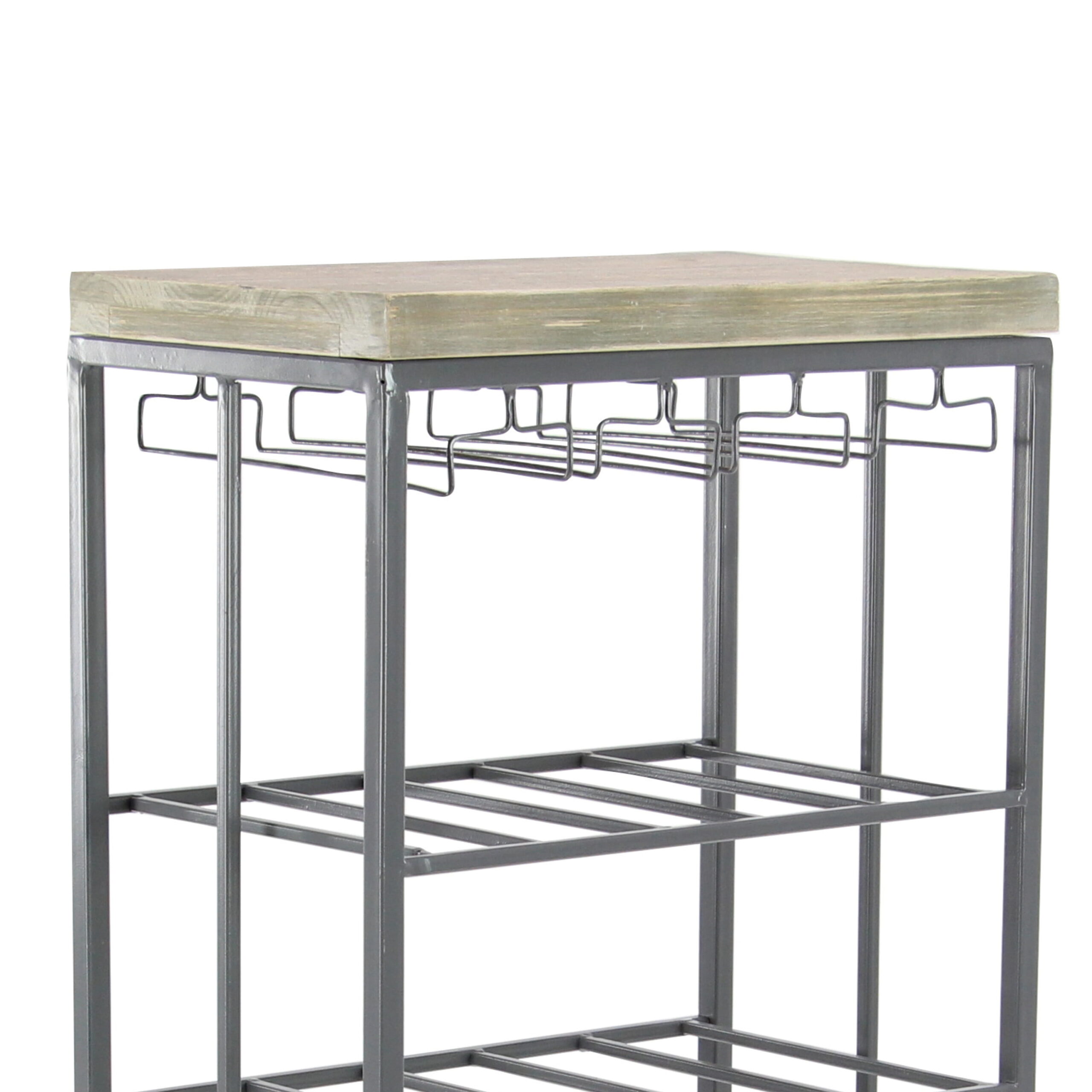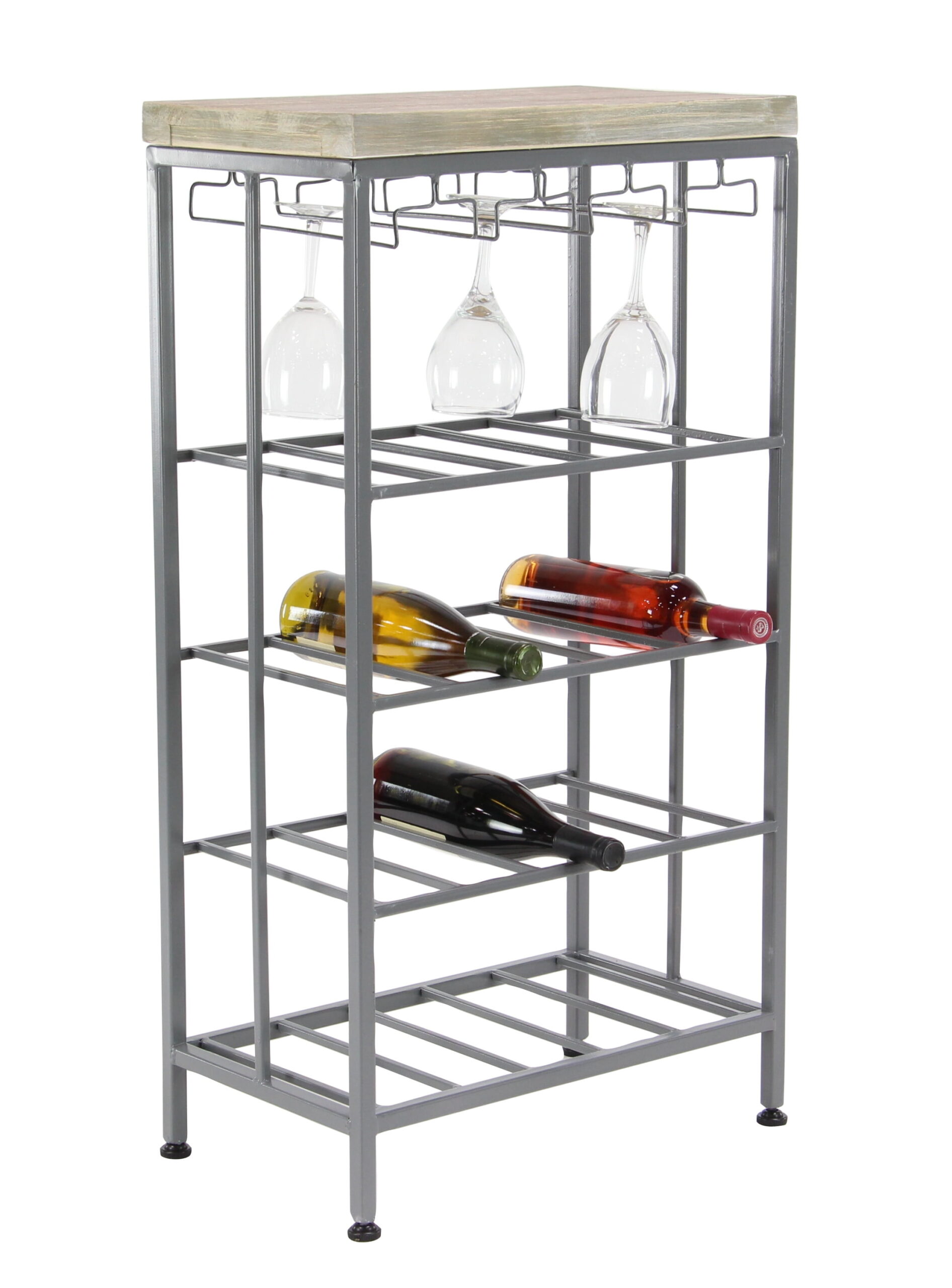 Ideal decor that works best in contemporary themed homes This corner wine rack is crafted from wood and metal, lending it a durable design This metal wine rack has a gray and soft brown color palette that’s perfect for contemporary spaces This wine rack features dangling wine glass holders and four shelves that will hold up to 15 bottles This item measures 19L x 11W x 36H; weight: 13.26 lbs An accent furniture featuring a wine storage with rectangular shelves for wine bottles and hanger-shaped rack for glassware Wipe clean with a dry cloth Black rectangular wine storage is crafted with welded metal frames and mounted wooden top Contemporary style DecMode 36″ x 19″ Grey Metal Contemporary Wine Rack makes a perfect addition to any home