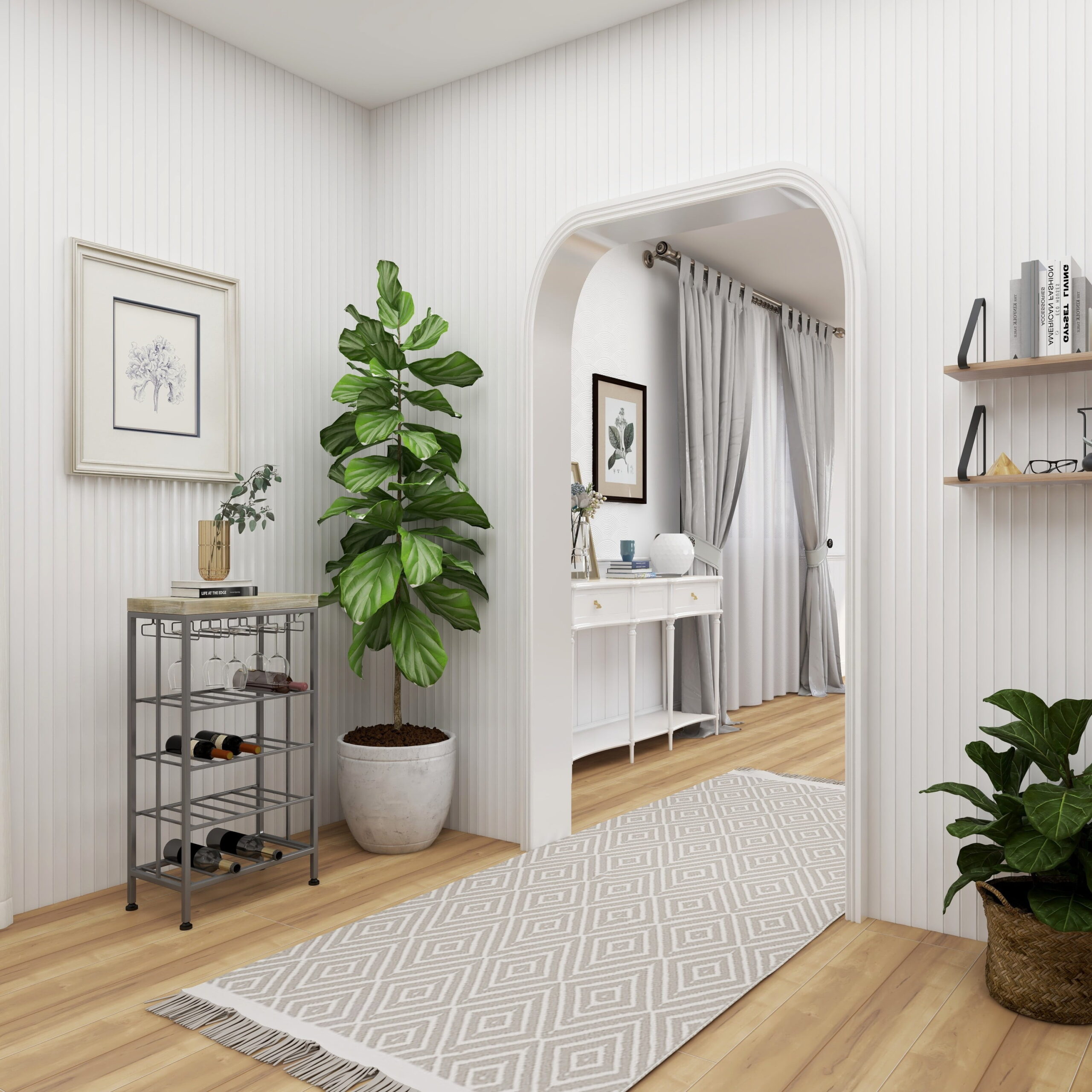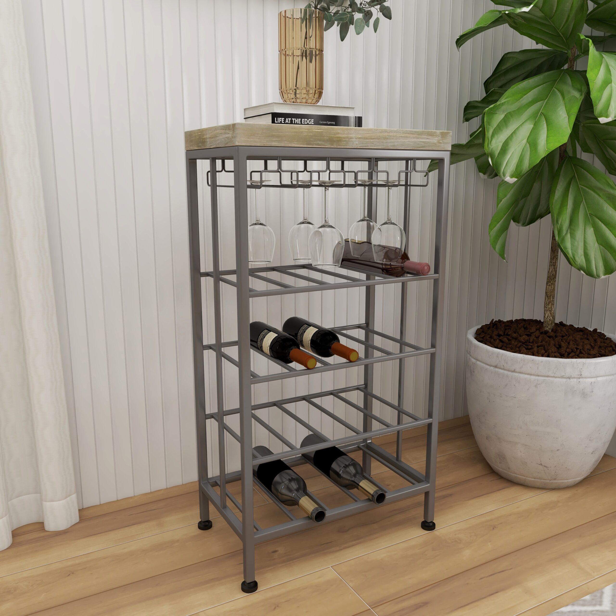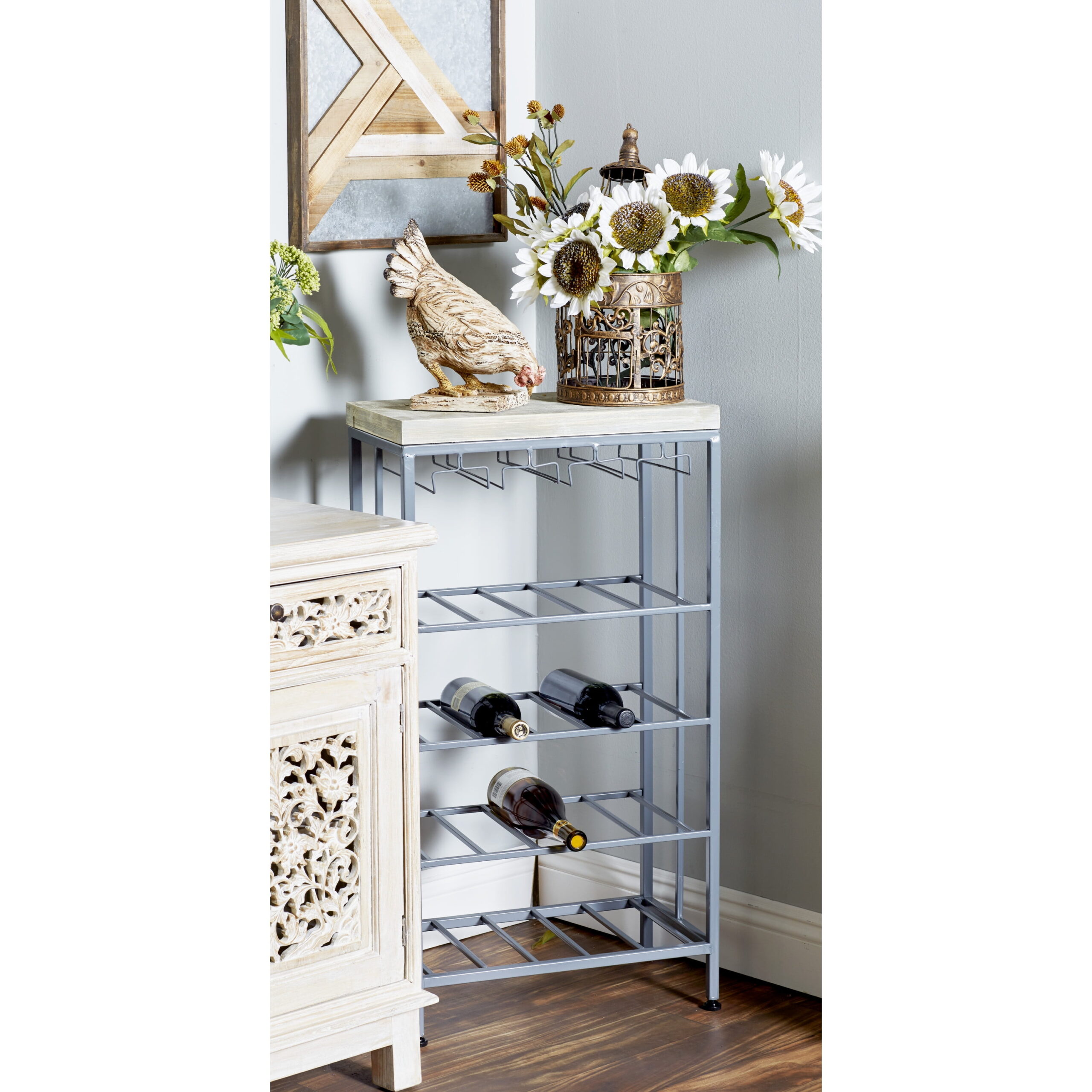 Ideal decor that works best in contemporary themed homes This corner wine rack is crafted from wood and metal, lending it a durable design This metal wine rack has a gray and soft brown color palette that’s perfect for contemporary spaces This wine rack features dangling wine glass holders and four shelves that will hold up to 15 bottles This item measures 19L x 11W x 36H; weight: 13.26 lbs An accent furniture featuring a wine storage with rectangular shelves for wine bottles and hanger-shaped rack for glassware Wipe clean with a dry cloth Black rectangular wine storage is crafted with welded metal frames and mounted wooden top Contemporary style DecMode 36″ x 19″ Grey Metal Contemporary Wine Rack makes a perfect addition to any home