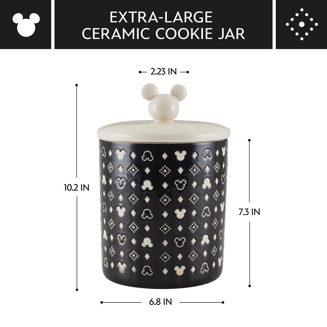 Bring the timeless magic of Disney Mickey Mouse to your kitchen with this 12.8-cup ceramic jar with airtight lid from Disney Home, a line of kitchenware inspired by Disney’s early-era black-and-white animated masterpieces. Crafted from durable ceramic and topped with an airtight lid that uses Mickeys beloved 3D silhouette as a handy knob, this Ceramic Jar is ideal for keeping dry goods fresher for longer. Its exterior is decorated with a geometric pattern featuring Mickeys silhouette to help home chefs show off their playful side and love for the worlds most famous mouse while cooking up their own magic. The Monochrome collection combines classic kitchenware designs and contemporary functionality with trusted culinary performance and the nostalgic charm of classic Disney.