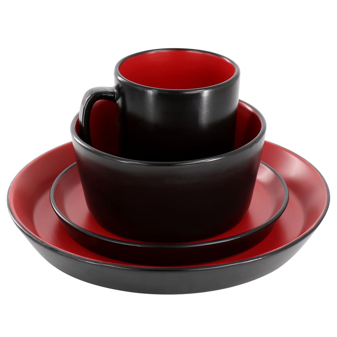 Set: 16 Piece Dinnerware Set Color: Red/Black Construction: Stoneware Shape: Round Style: Solid Two tone design with matte finish Dishwasher Safe Microwave Safe Service for 4 Includes: 4x’s 10″ Dinner Plates 4x’s 7.5 Inch Dessert Plates 4x’s 6″ 24oz Cereal Bowls 4x’s 15 oz. Mugs Per Item Measurements: Dinner plates- 10in diameter, 1.2in height, 1.75lb weight Dessert plates- 7.5in diameter, 0.8in height, 0.95lb weight Bowls- 6in diameter, 3in height, 24oz capacity, 1.15lb weight Mugs- 4.8in length, 3.6in diameter, 4.2in height, 15oz capacity, 0.85lb weight