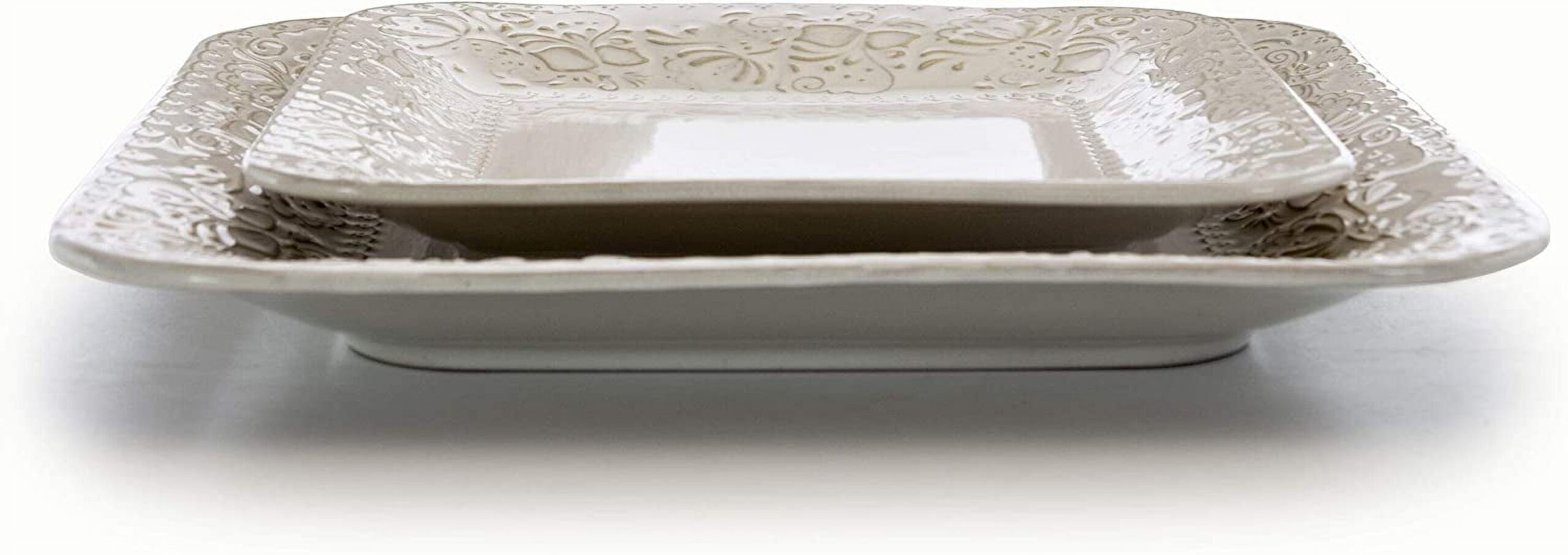 Elama Ivory Lotus 16 Piece Square Dinnerware Set: Material: Stoneware Color: Ivory Pattern: Embossed Floral Shape: Square Set Includes Four 14″ Dinner Plates Four 10.5″ Dessert Plates Four 20oz. Bowls Four 10oz. Mugs Per Item Measurements: Dinner Plate: 14″ diameter, 10.5″ length, 10.5″ width, 1″ height, 2.35 lb. weight Dessert Plate: 10.5″ diameter, 8″ length, 8″ width, 1″ height, 1.2 lb. Weight Bowl: 6″ diameter, 3″ height, 20oz. capacity, 1.10 lb. weight Mug: 4″ diameter, 4.5″ height, 3″ handle, 10oz. capacity, 0.85 lb. weight