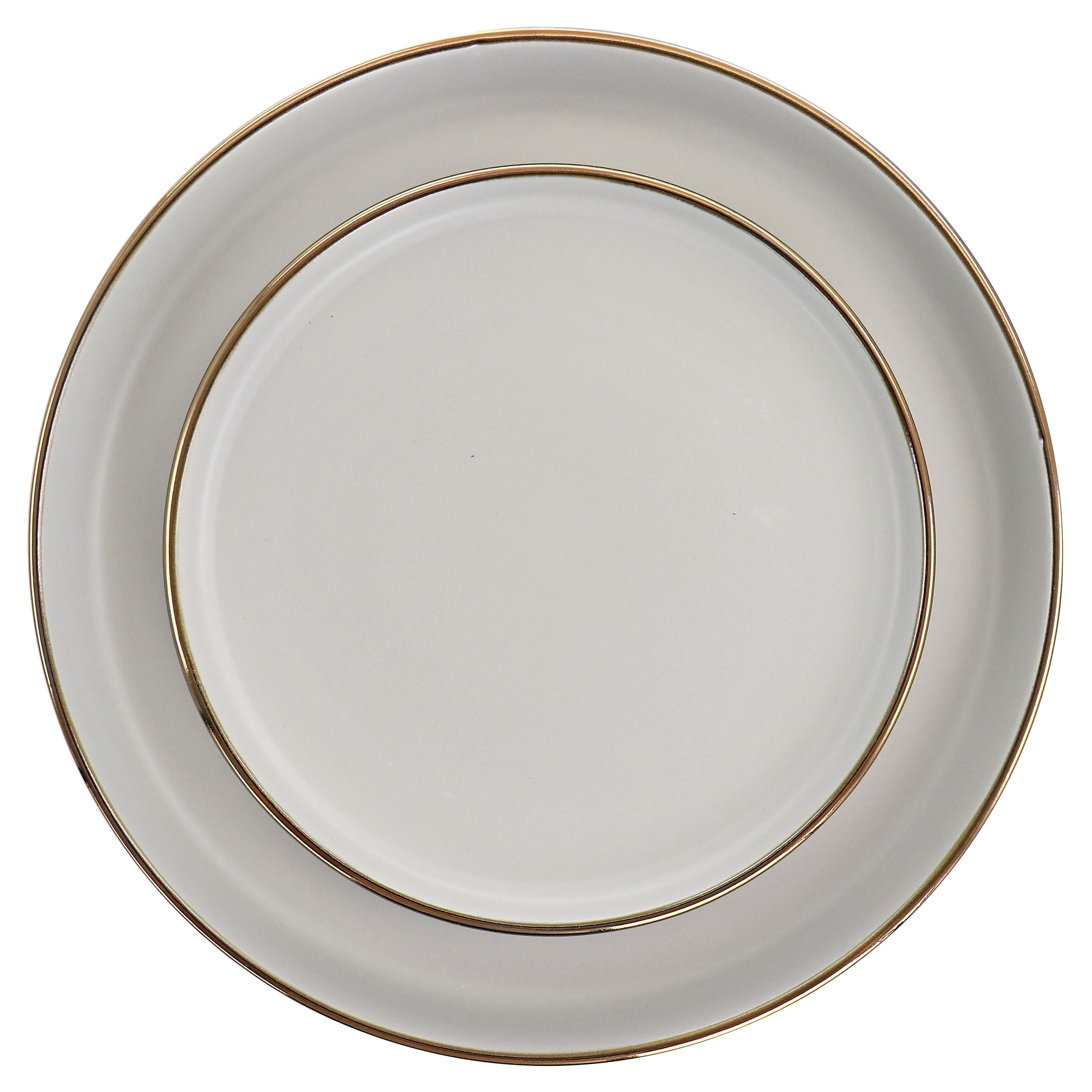 Add a beautiful accent to your dining table with the Elama Louis 16 Piece Round Stoneware Dinnerware Set in sophisticated Slate Matte Colors with Gold Rim Trim. Each dish is creatively crafted with a unique flat base, raised rim and trimmed in gold. Beautifully finished off with a thin, elegant gold rim this set is a statement piece. Constructed of Stoneware, this set is ideal for special occasion gatherings and sturdy for every day use. Each plate is microwave safe for quick reheating and dishwasher safe for easy cleaning.