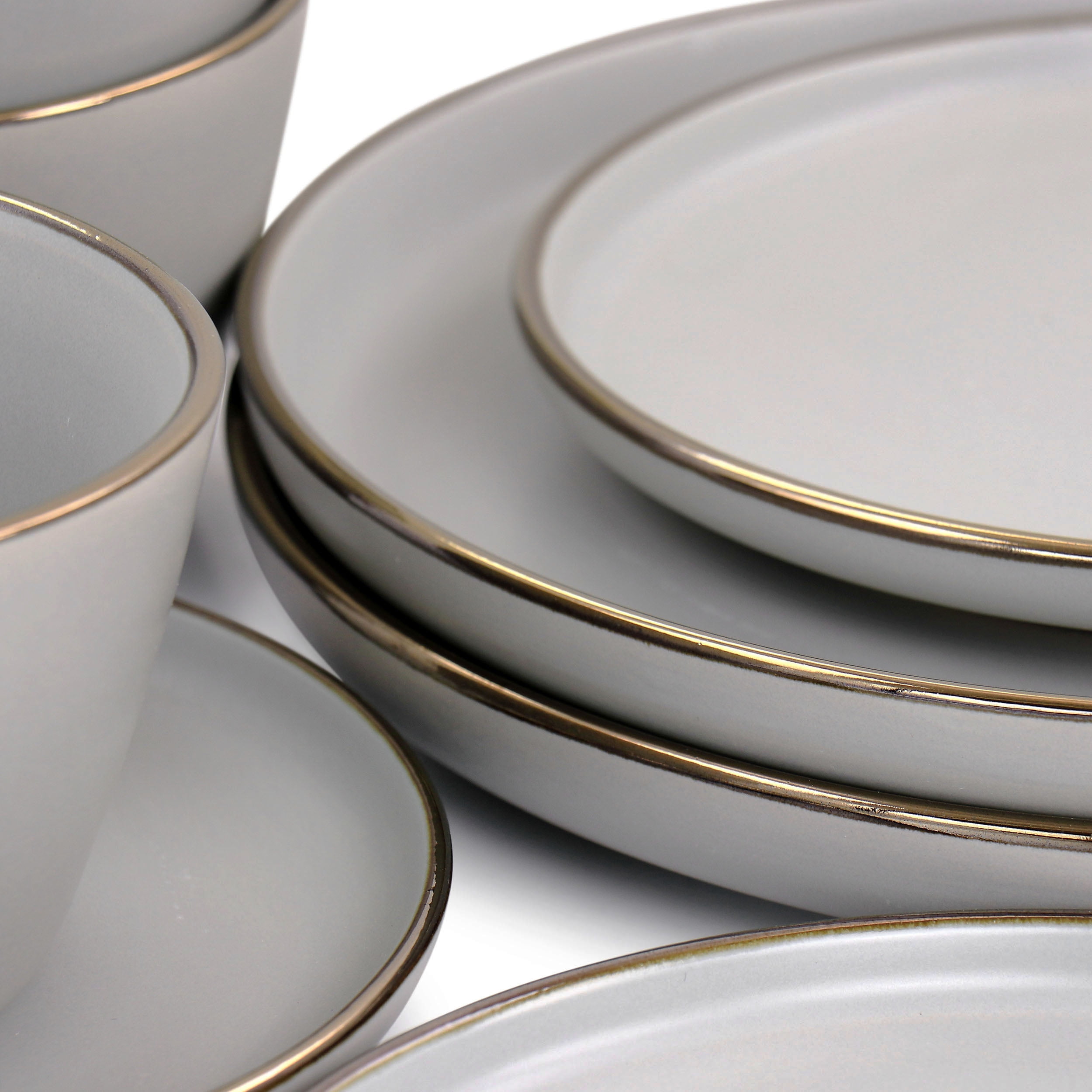 Elama Louis 16 Piece Stoneware Dinnerware Set in Matte Slate with Gold Rim