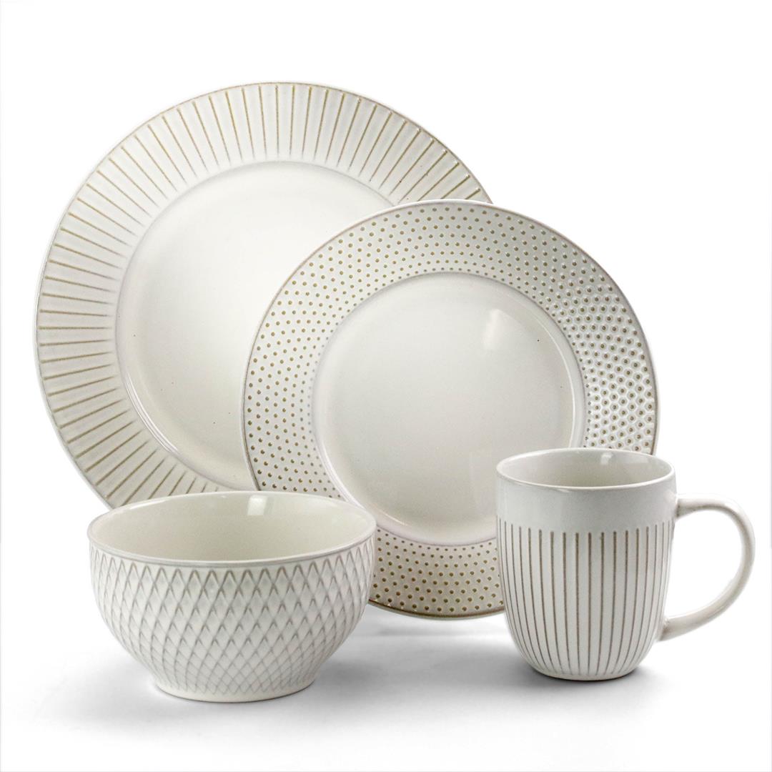 A STUNNING ACCENT TO YOUR TABLE The Elama Market Finds 16 Piece Round Stoneware Dinnerware Set in Embossed White BEAUTIFULLY COLORED In Elegant White with Embossed accents, this tableware set will surely set a tone at dinner time A FULL SERVICE FOR 4 Each dish is creatively crafted into a unique and contemporary shape, adding a little something more special to meal time MICROWAVE SAFE For easy heating DISHWASHER SAFE For easy cleaning Included Components: Four 10oz. Mugs