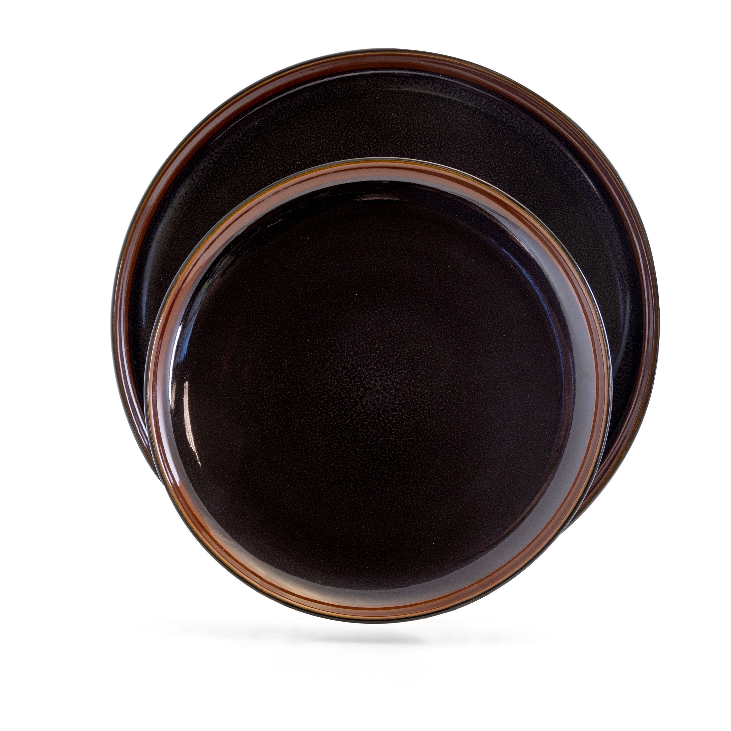 Constructed of stoneware with a deep rich black tone, washed design, and brown trim, this set is sure to make a statement Each piece in this 4 person set is microwave and dishwasher safe, making it easy and convenient for reheating and cleaning up Construction: Stoneware Finish: Reactive glaze Color: Metallic Black, Brown Rim design: Washed Shape: Round Includes: Four dinners plated, Four dessert plates, Four bowls, Four mugs Measurements: Dinner plate: 10.5″ Diameter, 1″ Height, 1.80 lb. Weight, Dessert Plate: 8.5″ Diameter, .90″ Height, 1 lb. Weight, Bowl: 7.5″ Diameter, 2″ Height, 1 lb. Weight, Mug: 3″ Diameter, 1.5″ Handle, 4″ Height, 10 ounce capacity, 0.75 lb. Weight
