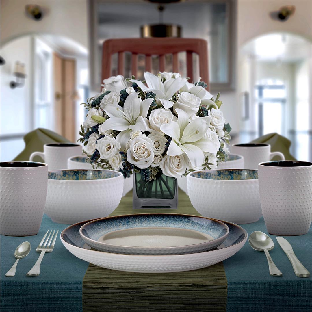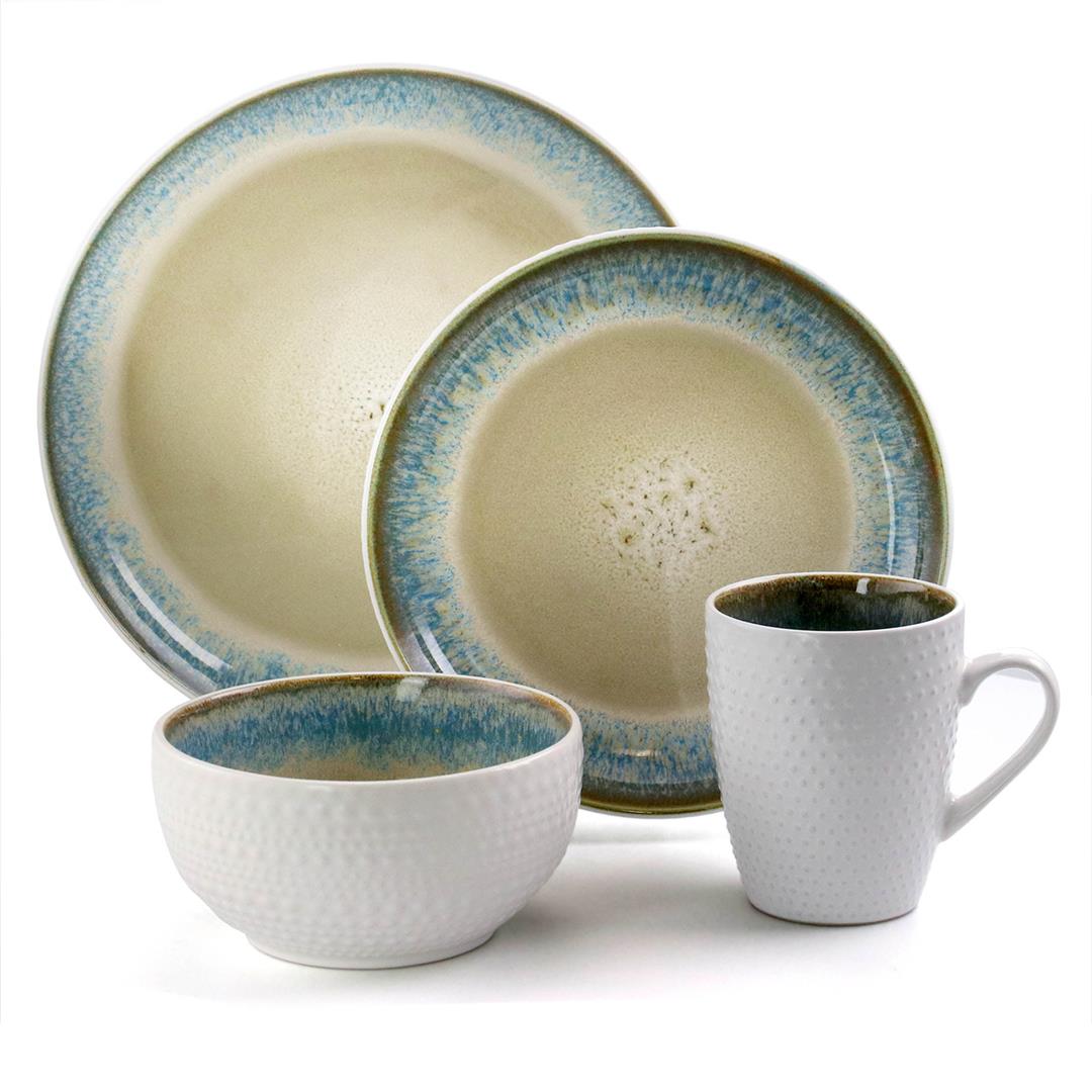 Add a beautiful accent to your dining table with the dinnerware set in hues of Taupe, Blue, and Brown. Each stoneware dish is creatively crafted into unique and contemporary shapes, making your plates the talk of the evening.