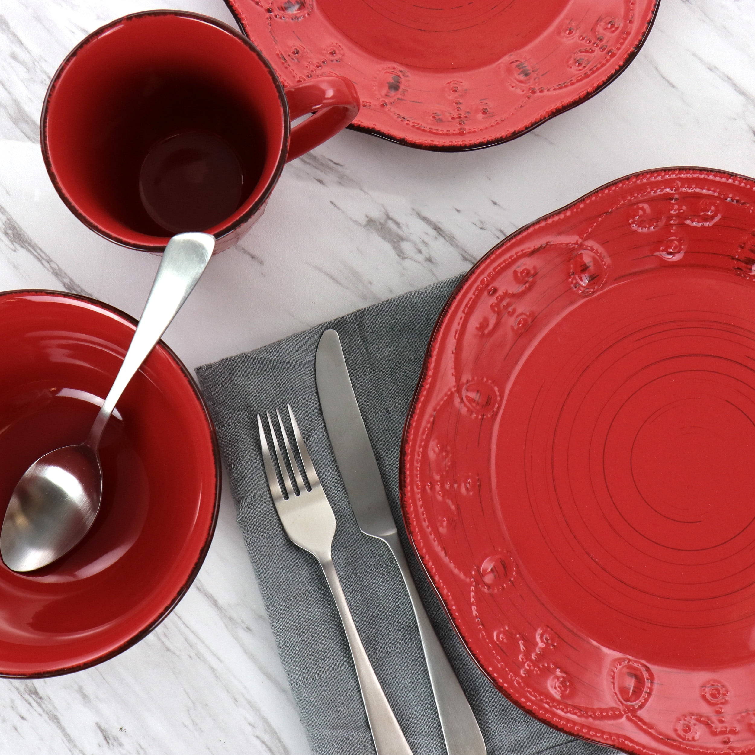 Add a beautiful accent to your dining table with the Elama Rustic Birch 16 Piece Dinnerware Set in Red. This set has scalloped edges and embossed details on all pieces for an elegant and intricate look. The bold color and delicate design will make a statement for any occasion. This set includes four Mugs, four bowls, four desert plates, and four dinner plates, completing a 4 person table setting. Each plate is microwave safe for quick reheating and dishwasher safe for an easy cleanup.