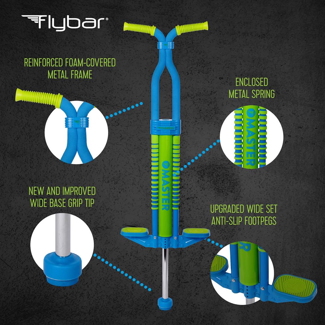 Flybar Master Pogo Stick for Boys and Girls Age 9 and Up, 80 to 160 Lbs, Blue/Green: The Master Gets Even Better – The New Flybar Foam Master Pogo Stick 2.0 is a great pogo for intermediate to advanced riders. It is meant for kids ages 9 and up, and weight ranges from 80-160 pounds Foam Covered Metal Frame – This Flybar Foam Master Pogo Stick 2.0 features an enclosed spring and a foam wrapped metal frame. The soft foam material offers a cool look while also providing protection New Rubber Sure Grip Handles – The New 2.0 Edition features a comfortable and durable hand grip that makes it easy to hold on when flying high New Wider Sturdy, Non-Slip Foot Pegs – Wider textured foot pegs are closer to the center to increase stability. The pegs are reinforced for safety and balance New Reinforced Shaft, Piston And Spring The core components have been reinforced for strength and durability New Wider Tip The wider tip provides a safer, stable, smoother bounce. The tip cap is covers to help keep debris out and give it a new refreshing look
