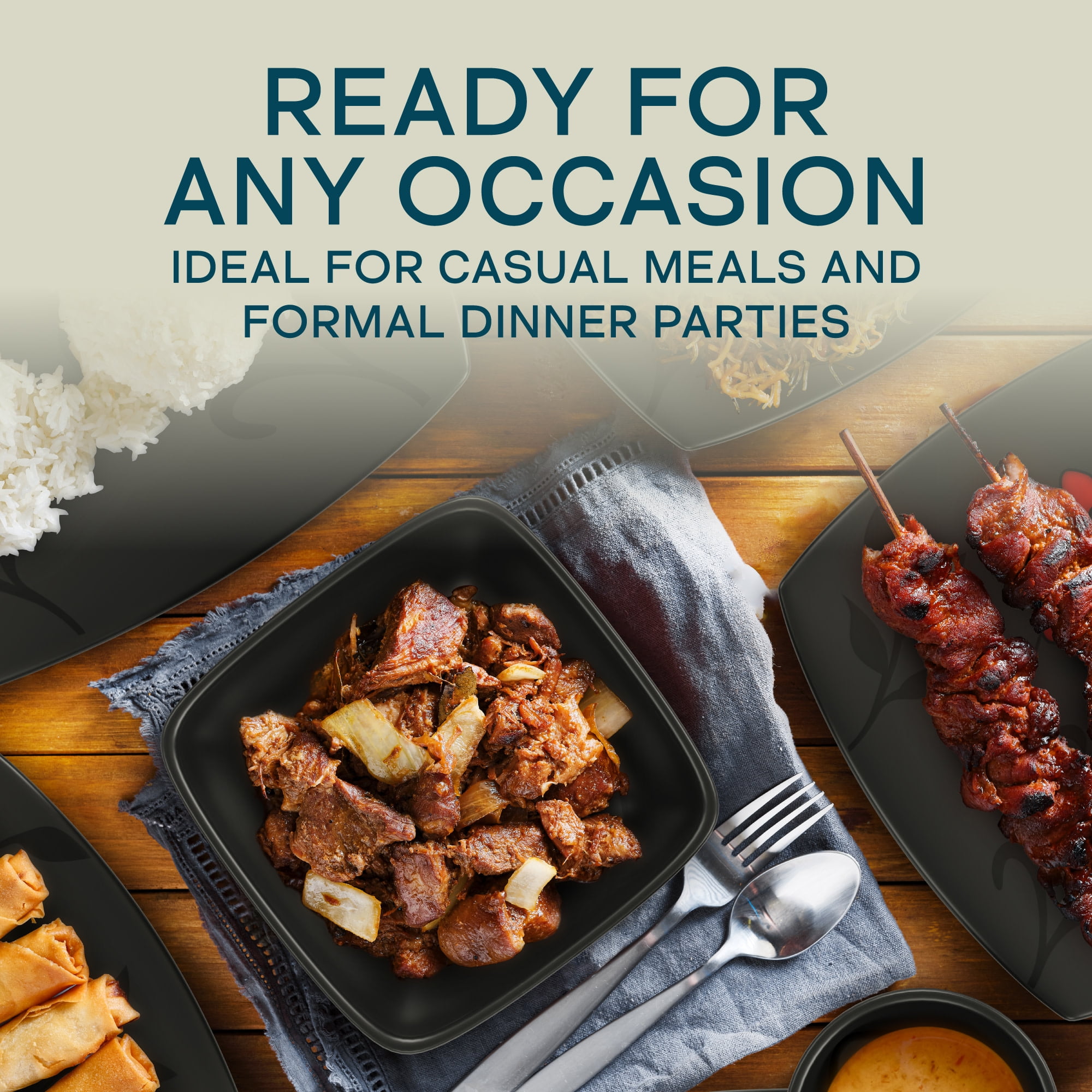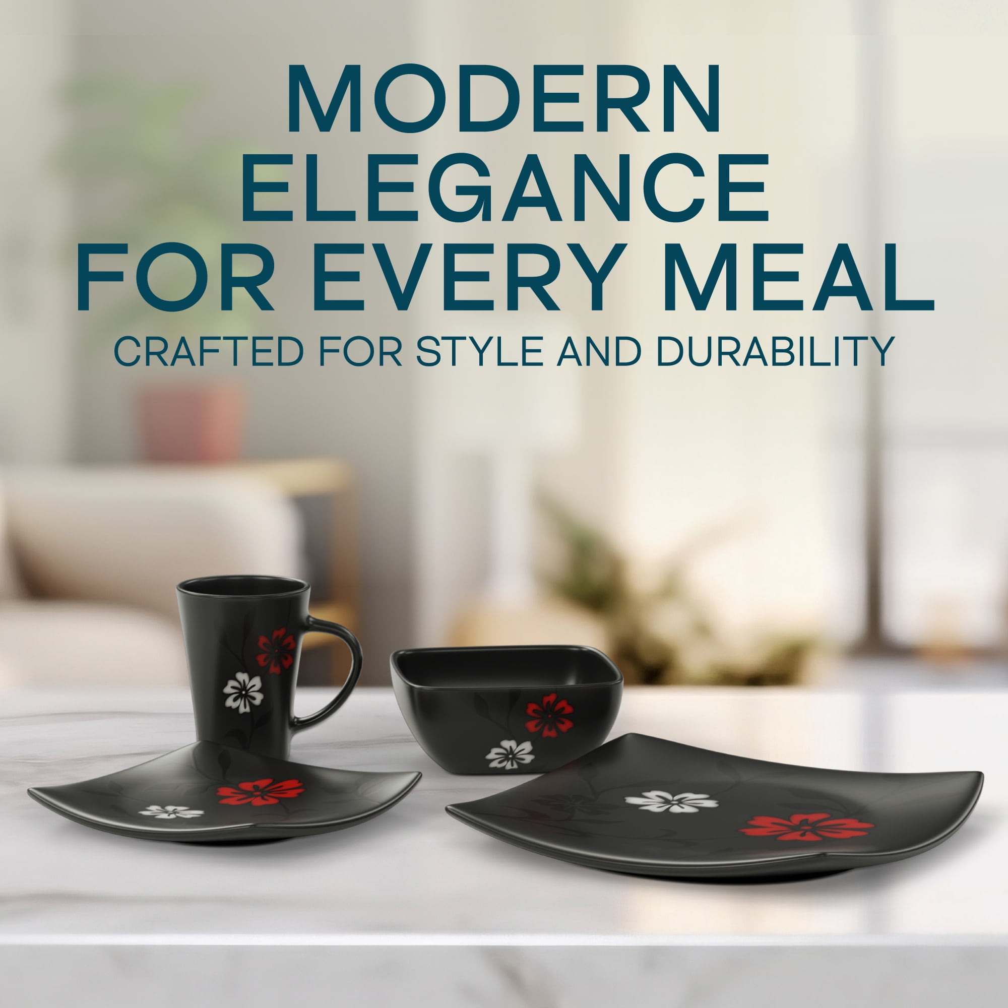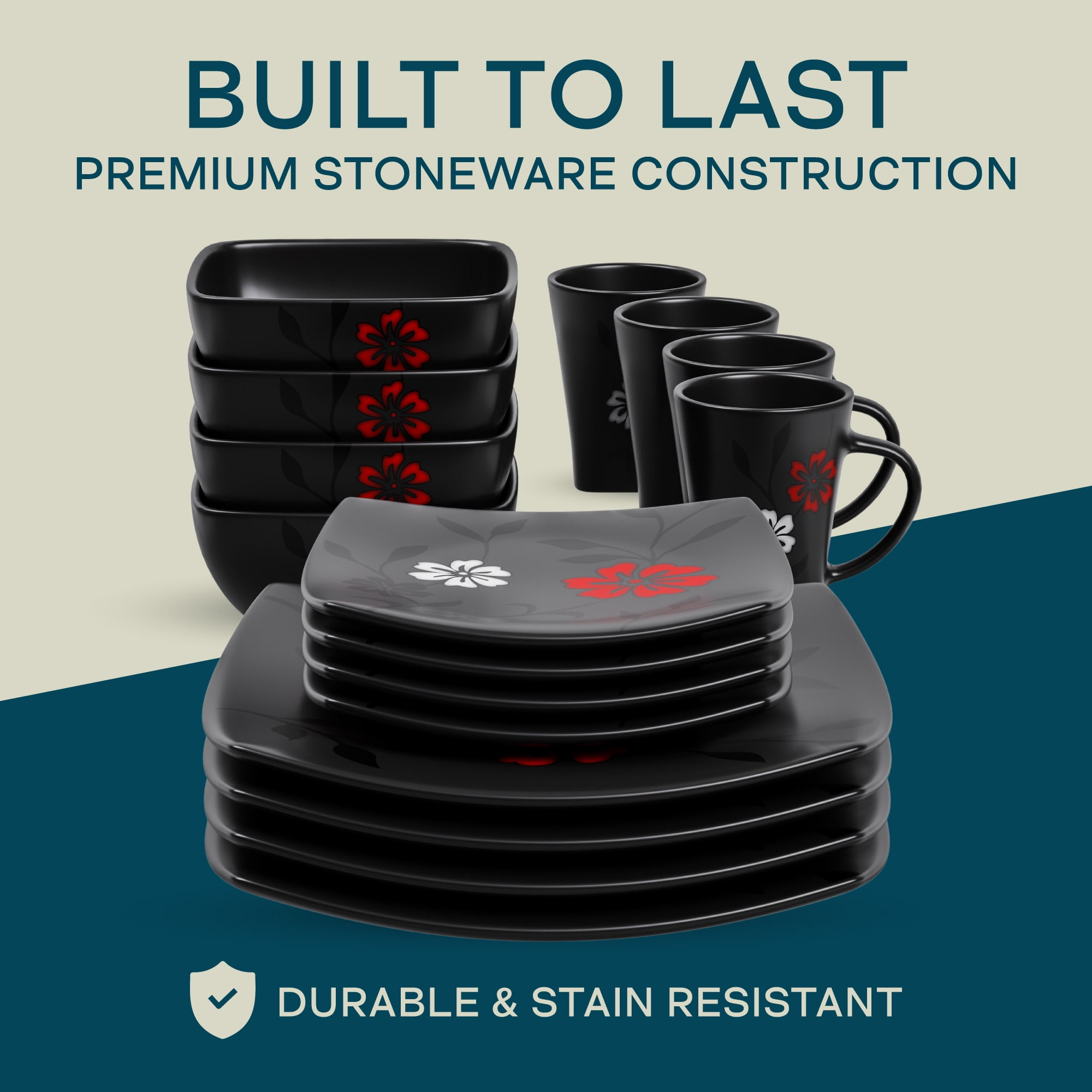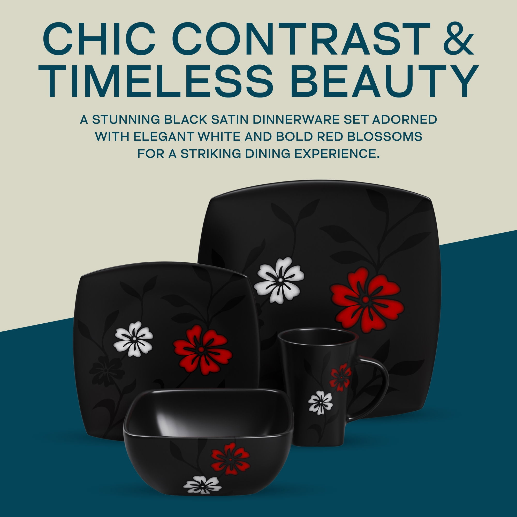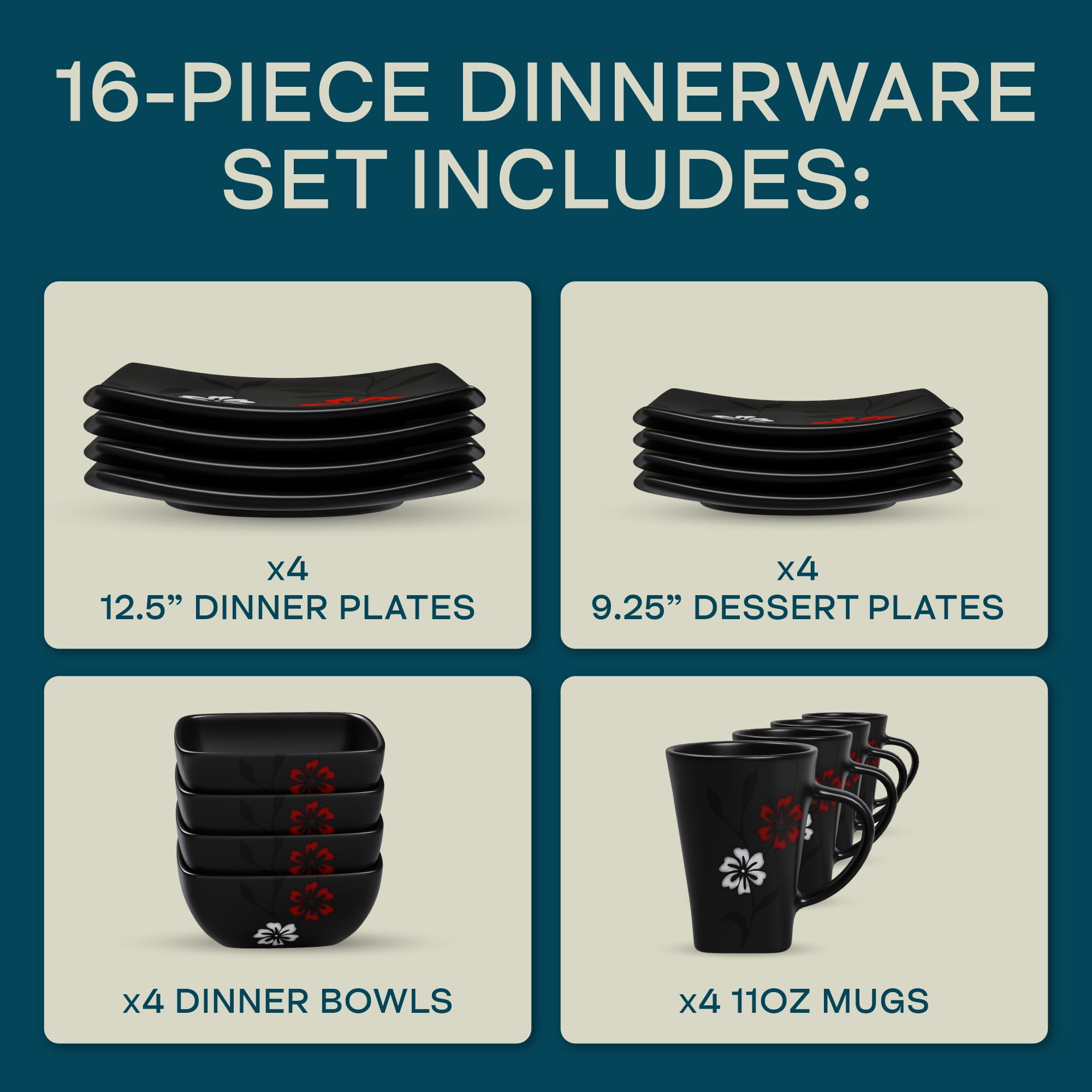 Elegant Floral Design: This Gibson Elite Couture Evening Blossom dinnerware set showcases a stunning black satin finish with delicate white and red cherry blossoms, bringing an artistic touch to your table for any occasion. Complete Service for Four: The 16-piece ceramic dinnerware set includes(4) 12.5″ dinner plates, (4) 9.25″ dessert plates, (4) 7″ bowls, (4) 10oz mugs. Each piece features a unique soft square shape, making it a modern and functional choice for any meal. Versatile for All Occasions: With its elegant floral pattern and modern dinnerware set design, this collection is perfect for casual dinners, family gatherings, or special occasions. Soft Square Silhouette: The square shape of the plates and bowls gives this dinnerware set a contemporary edge, ideal for those who appreciate fashion-forward table settings. Microwave & Dishwasher Safe: Designed for convenience, this microwave safe dinnerware set allows easy reheating of meals, while the dishwasher safe feature ensures hassle-free cleaning after every use.