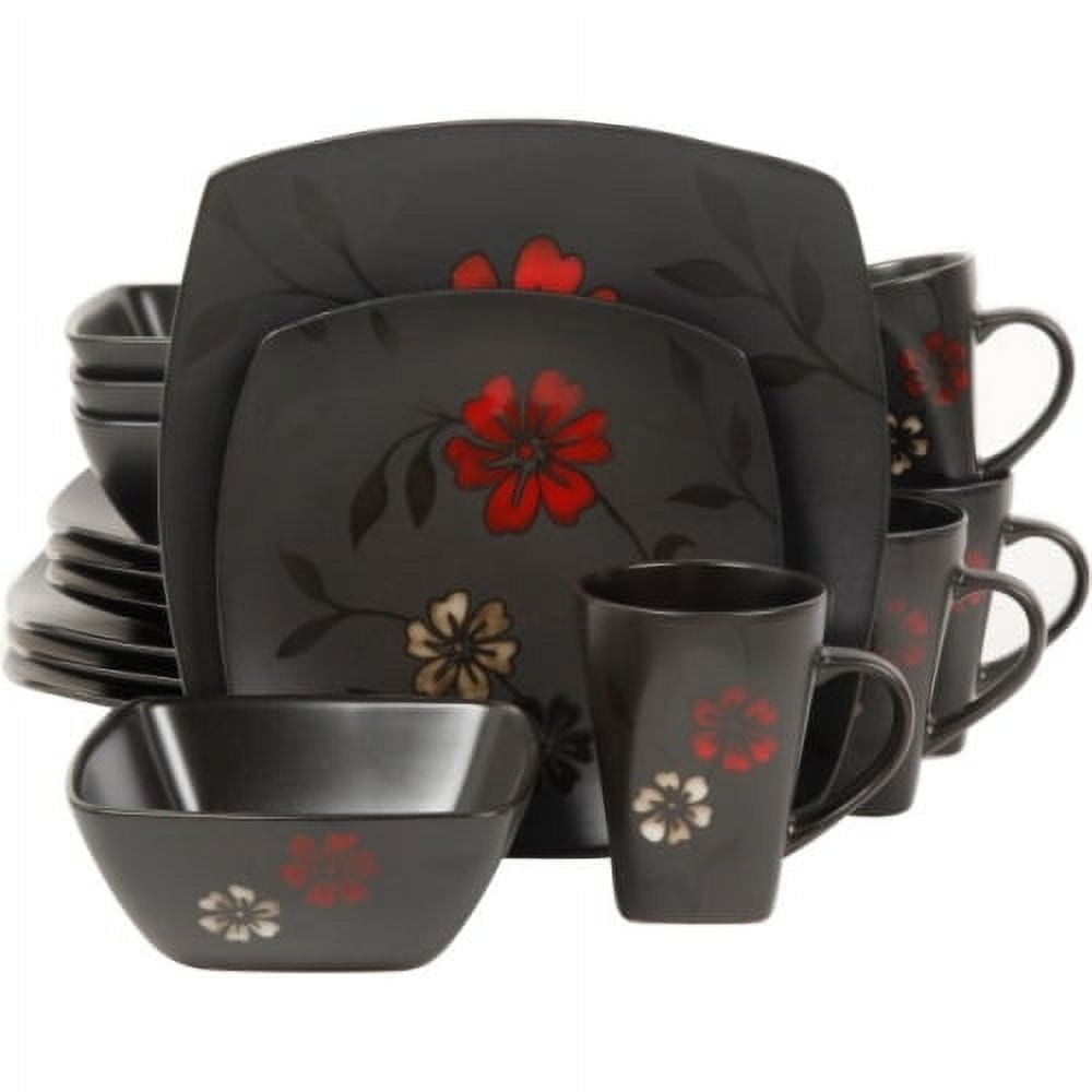 This Gibson 16-Piece Evening Blossom Dinnerware Set features a black satin design with blossoms in pops of white and red color. It includes four dinner plates, four salad plates, four bowls, and four mugs. The ceramic dinnerware set is conveniently dishwasher-safe for easy care and cleanup. It is an ideal addition to all of your kitchen and serving needs or it makes a wonderful gift for any wedding or housewarming occasion.