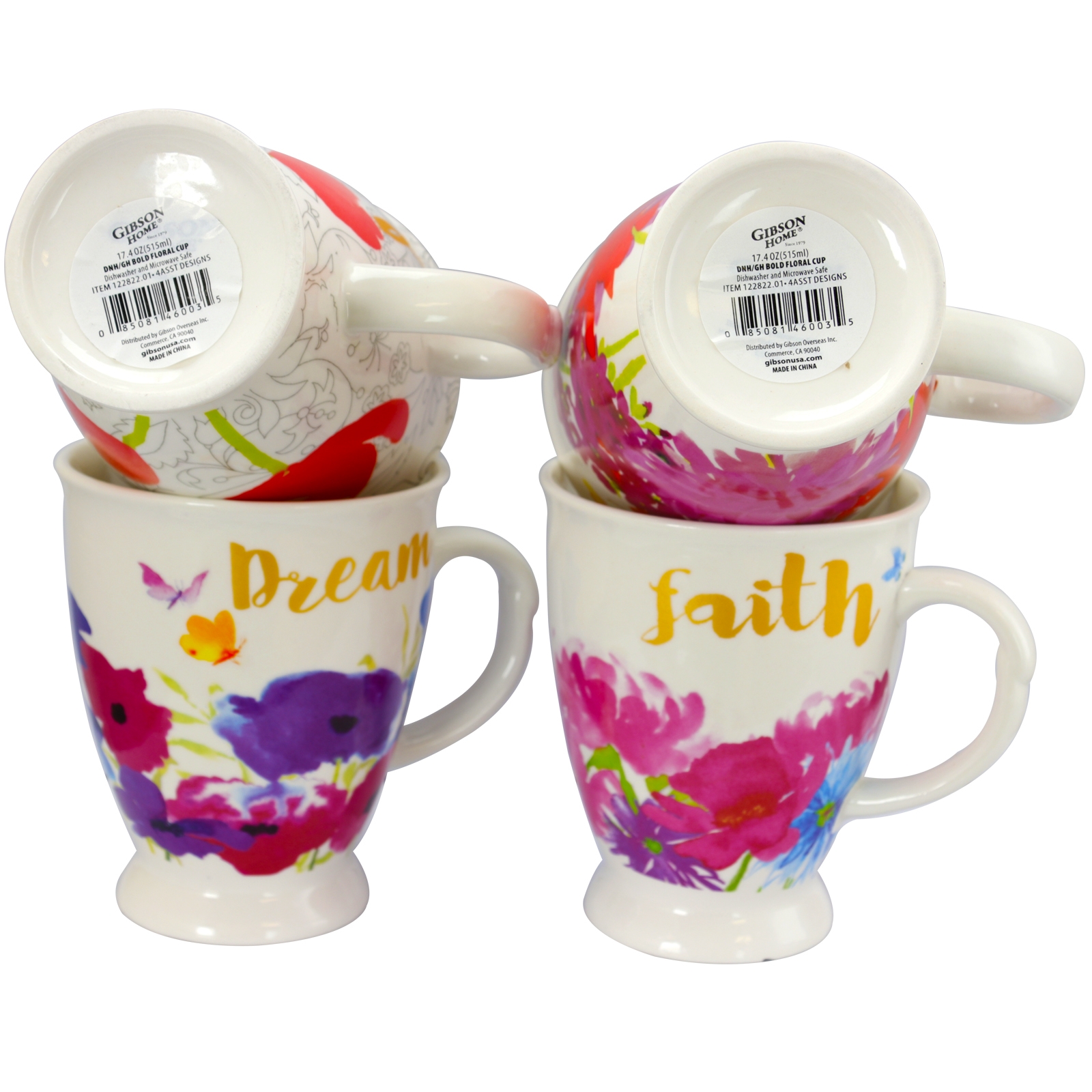 The Gibson Fold Floral mugs are the perfect combination to your early morning Coffee, Tea, or any other drink you might desire. The gold scripture on the mugs will give you the positive message. 4 assorted mugs with scrips of “Dream, Joy, Faith, and Love” The mugs have a mixture flowers that brightens up the mood you are in. Set includes four 17.4 oz. mugs (5.25″ x 4.75″ x 4″ – 0.75 lbs.) Item Dimensions: 7.50″ x 7.50″ x 4.50″ Item Weight: 3.00lbs