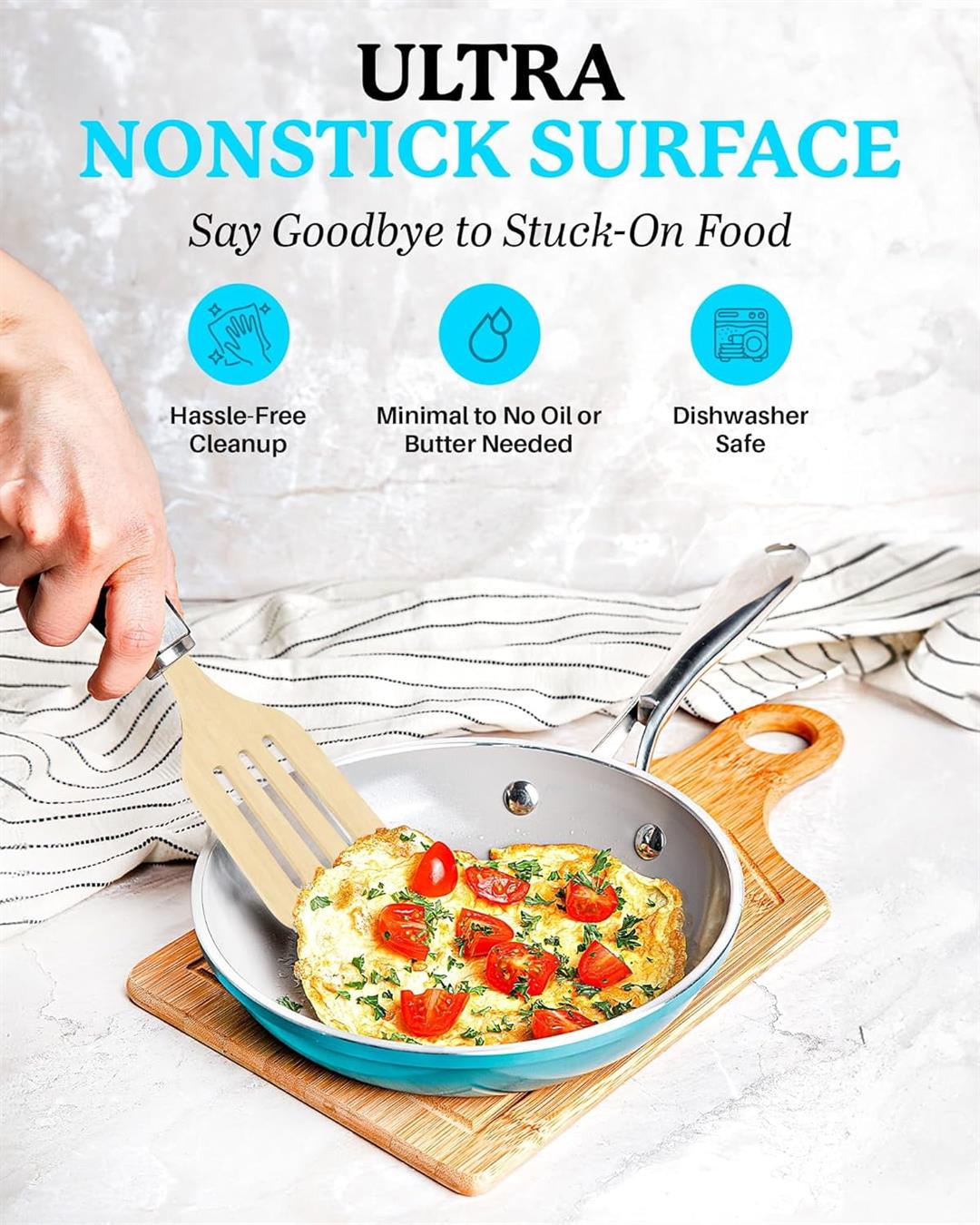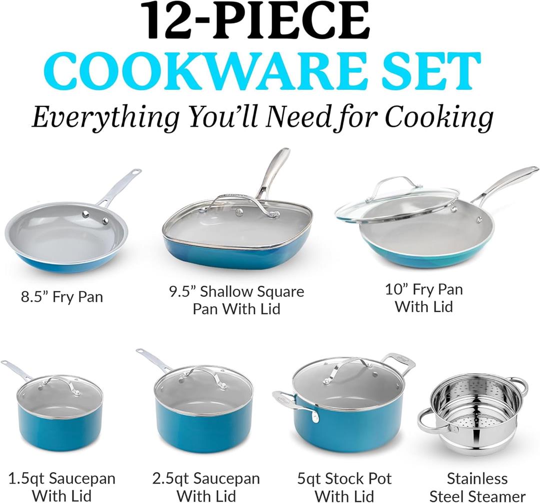 Gotham Steel 12 Piece Pots and Pans Nonstick Set Ceramic Cookware Kitchen Set, With Frying Skillet, Saucepan, Aqua Blue