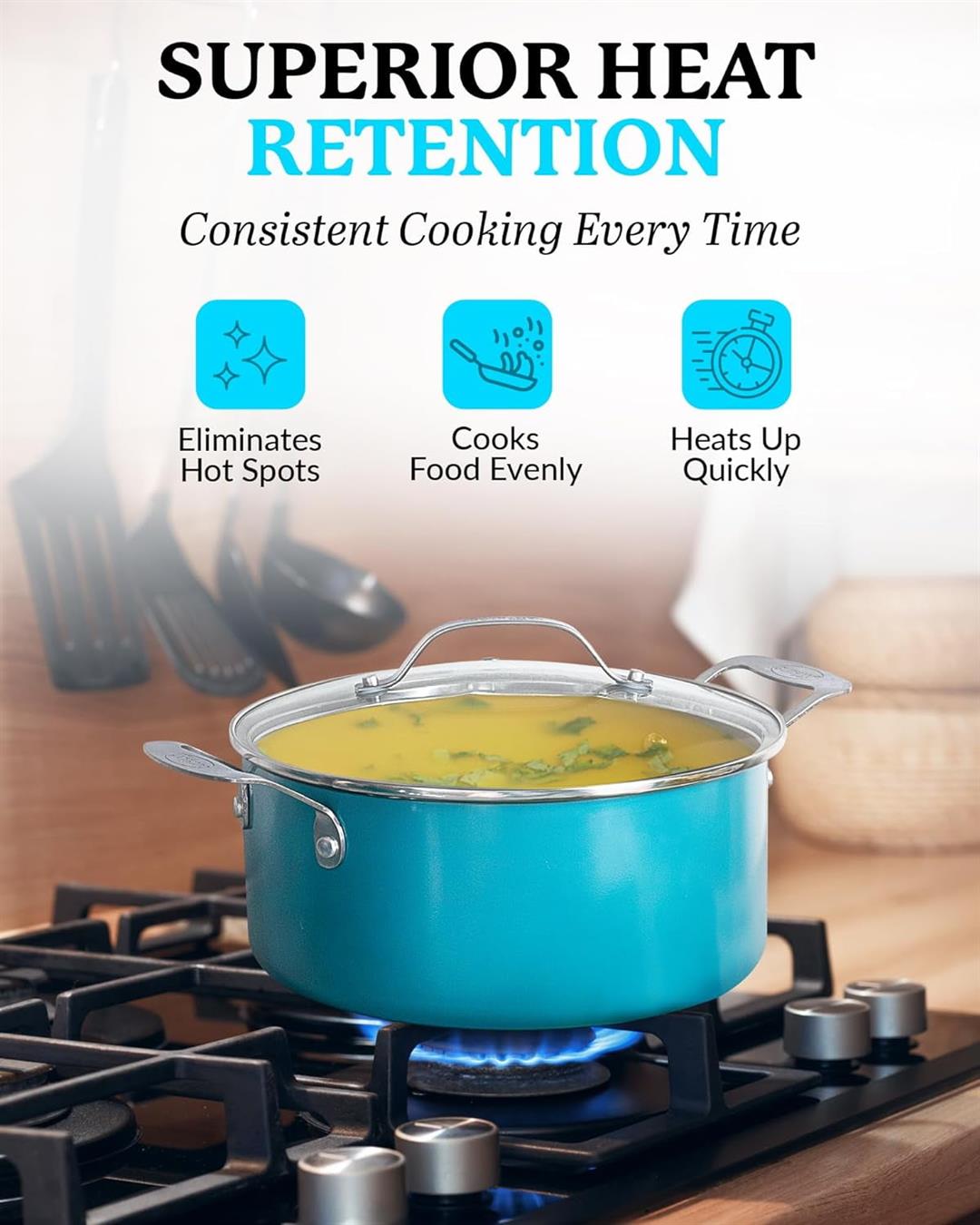 ELEGANY NAVY AND CREAM FINISH: Adds a touch of sophistication to your kitchen, blending seamlessly with both modern and classic decor. HEAVY DUTY CONSTRUCTION: Built to last with a strong foundation and a high-performance nonstick coating, ensuring long-term durability and resilience in the kitchen. ULTRA NONSTICK CERAMIC COATING: Advanced double-coated surface ensures effortless food release and quick cleanup, reducing the need for oils and enhancing your cooking experience. STAY COOL HANDLES: Ergonomically crafted handles stay cool during cooking, offering comfort and safety when transferring from stovetop to oven. OVEN SAFE UP TO 500F: Provides versatile cooking options, perfect for a range of dishes, from quick sauts to slow-braised recipes. COMPATIBLE WITH MULTIPLE STOVETOPS: Suitable for gas, electric, ceramic, and halogen stovetops, and partially compatible (fry pans and sauce pans only, not the stock pot) with induction ovens. HEALTH CONSCIOUS COOKING: Free from harmful chemicals like lead and cadmium, promoting a safer, healthier kitchen environment. DISHWASHER SAFE: Designed for convenience, this set is dishwasher safe, facilitating easy cleanup after every meal. IDEAL GIFT CHOICE: A practical and thoughtful gift for various occasions, enhancing the kitchens of newlyweds, college grads, or anyone who appreciates well-made cookware.