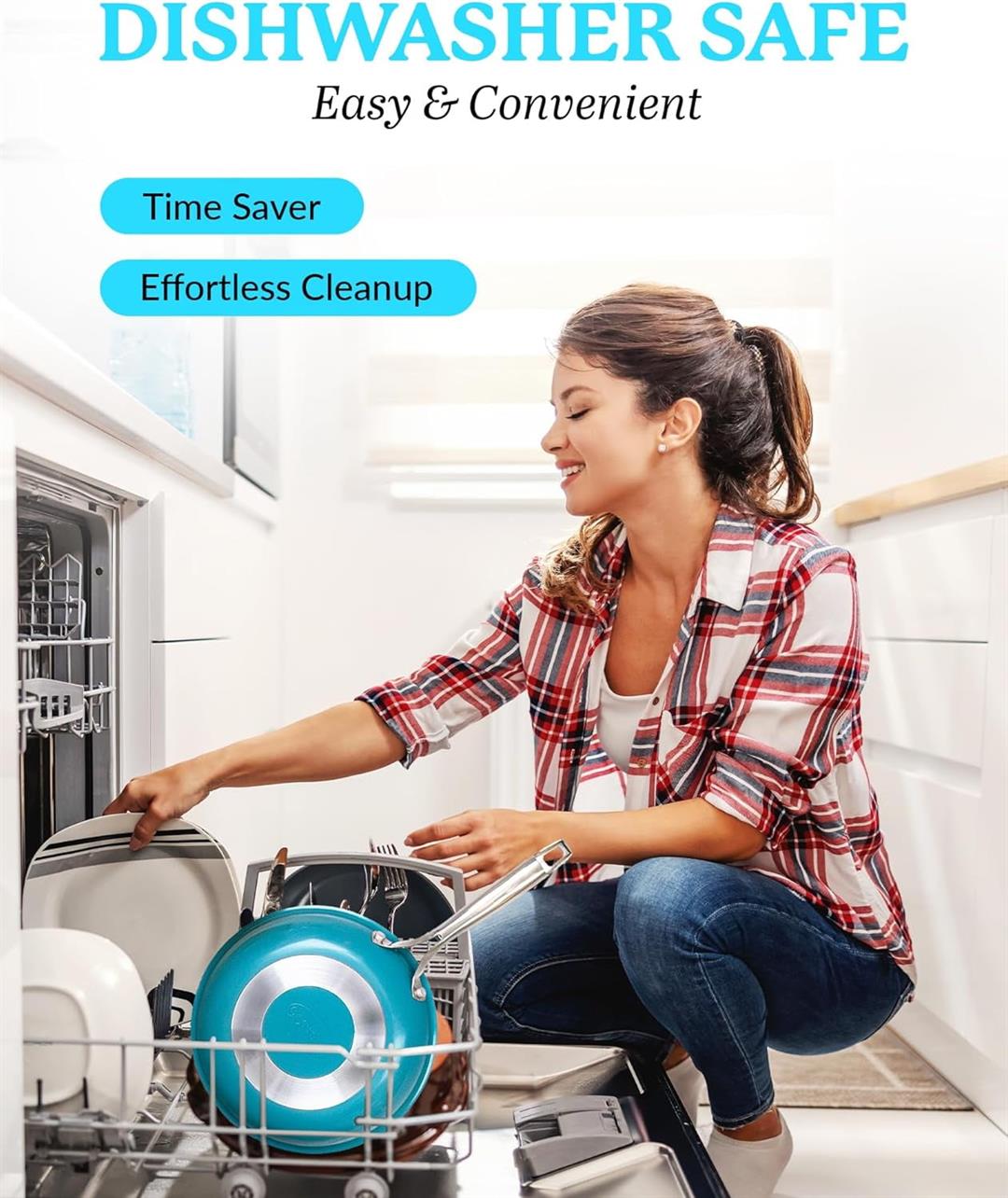 The Gotham Steel Nonstick Ceramic Pots and Pans 12 Piece Kitchen Cookware Set in stunning aqua blue with gray-tone interior combines modern aesthetics with high functionality. This premium set is built with a triple-coated nonstick surface that ensures hassle-free food release and easy cleaning. Celebrated globally, Gotham Steel has revolutionized modern kitchens with its advanced nonstick ceramic and titanium technology! Each piece in this set has been upgraded for enhanced nonstick properties, durability, and even heat distribution, including the integration of diamonds to prevent scratching. Toxin-free and dishwasher-safe, this cookware is perfect for health-conscious cooking. Suitable for all stovetops and ovens up to 500F, it includes frying pans, skillets, saucepans, a stockpot, and more. Transform your cooking experience with this stylish, efficient cookware set.