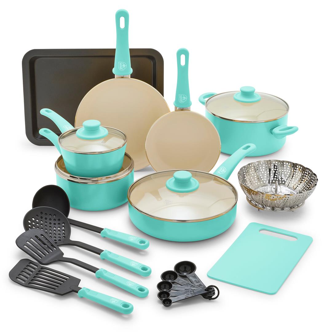18-piece set includes frypans, saucepans, stockpot, steamer, utensils & lids for full kitchen use Healthy ceramic nonstick coating for safer cooking Soft Grip handles stay cool and offer comfort during stovetop use Dishwasher safe and oven safe up to 350F for quick cleanup and flexible cooking Stylish turquoise finish adds personality to any kitchen setup