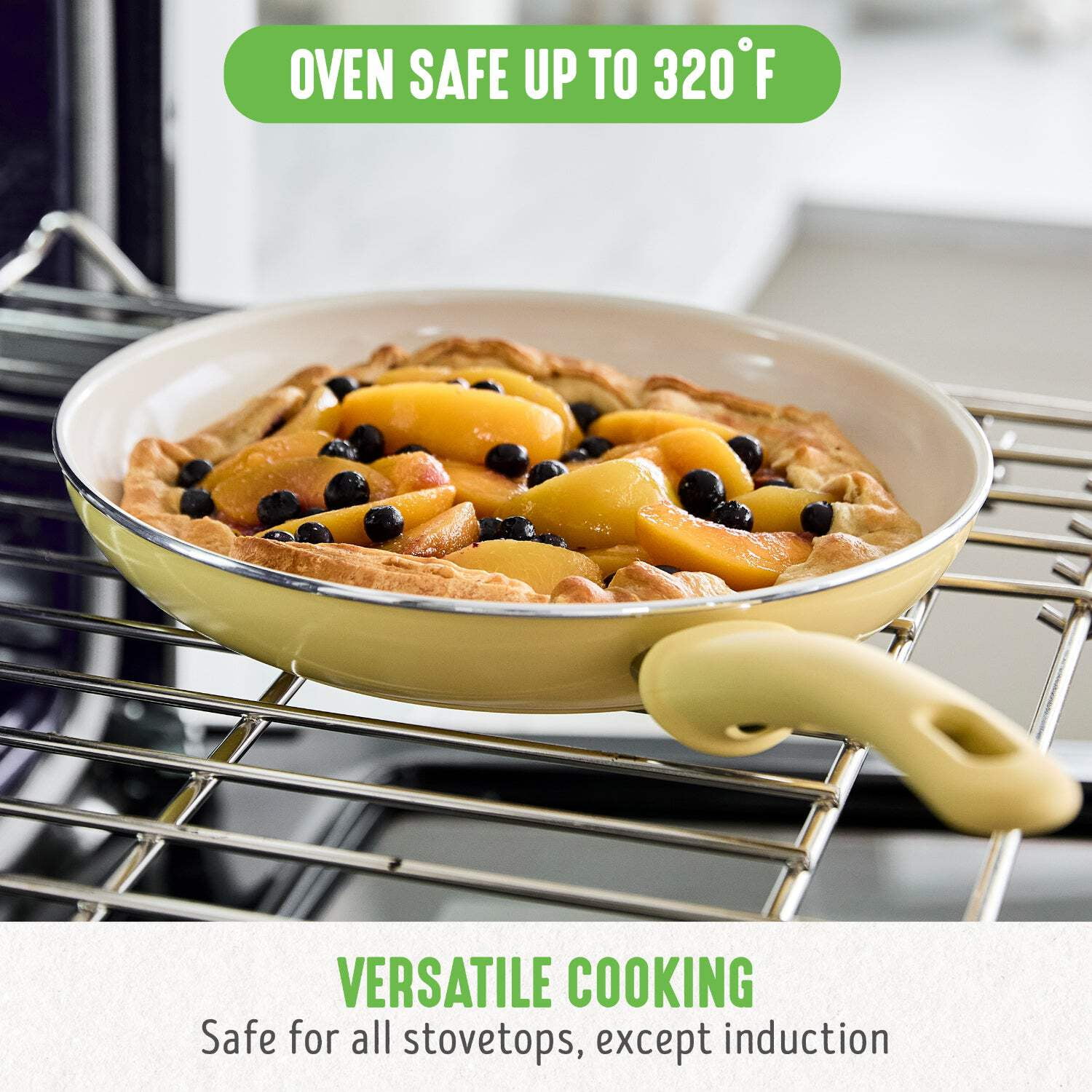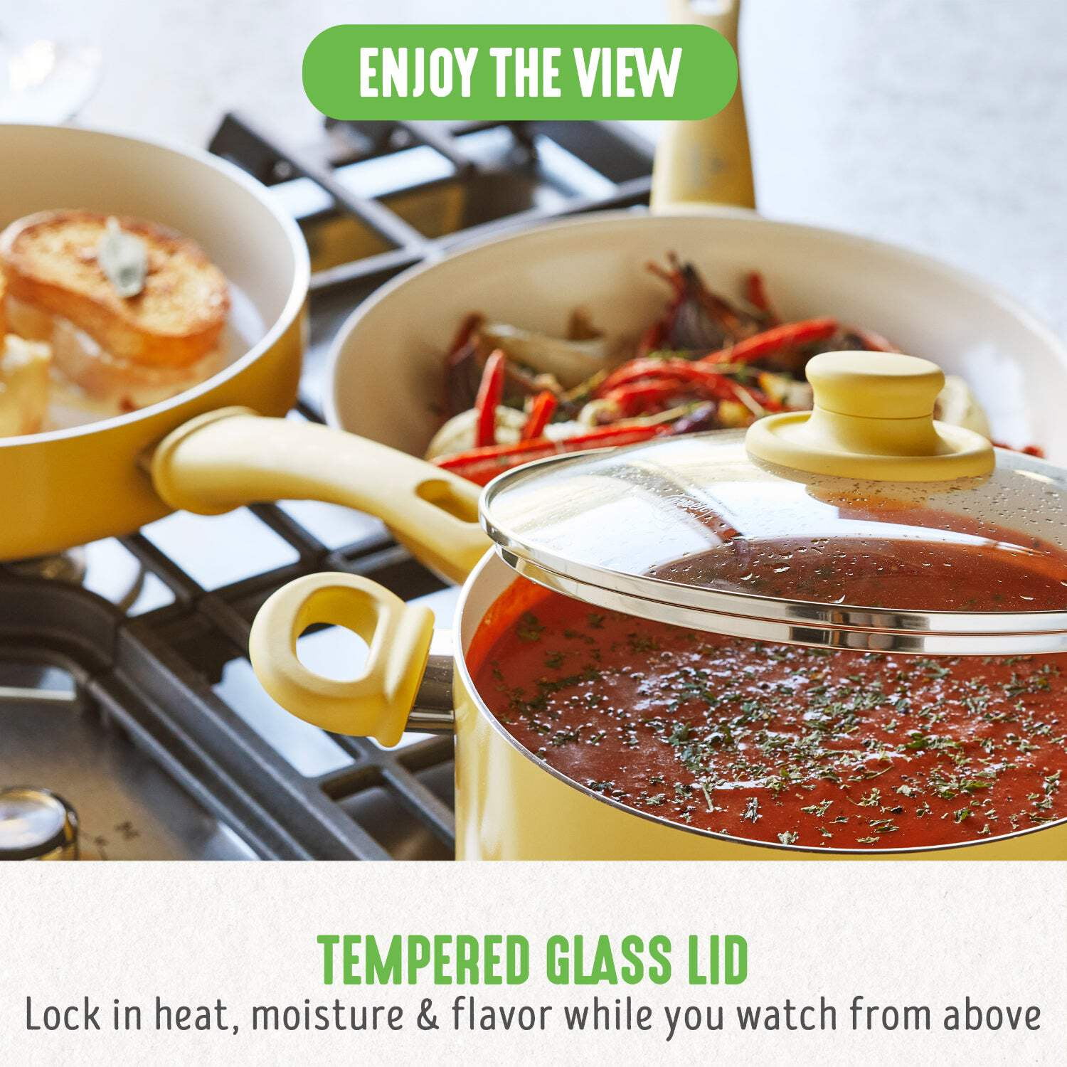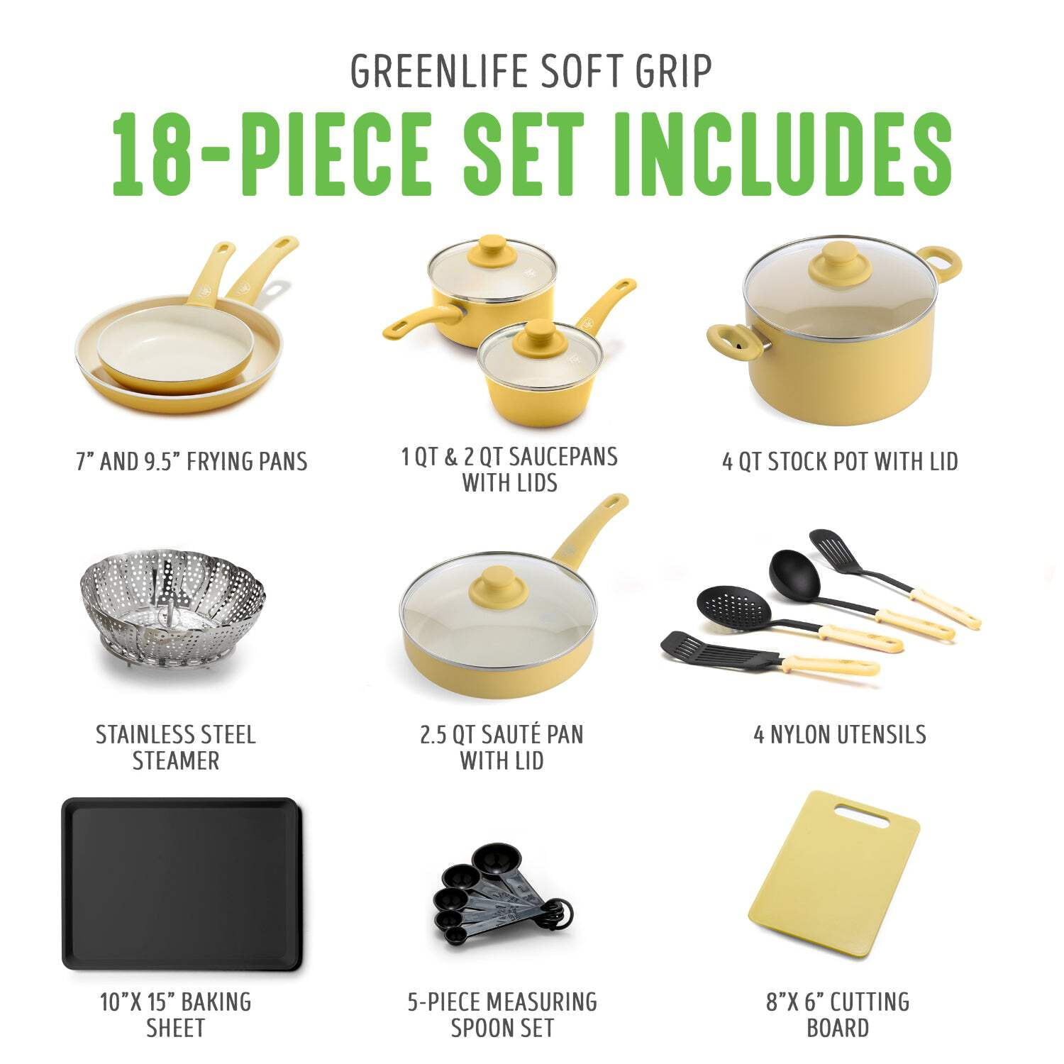GreenLife 18-Piece Soft Grip Toxin-Free Healthy Ceramic Non-Stick Cookware Set, Yellow, Dishwasher Safe The GreenLife 18-piece cookware set with soft grip technology is all about comfort and control. Designed for effortless performance and cleanup, this set features our healthy Thermolon nonstick coating. GreenLifes healthy ceramic nonstick is not stuck in the pastthats why our ceramic nonstick starts with sand and creates 60% less CO2 emissions during the curing phase than traditional coatings. The pans are also crafted with recycled aluminum, because we want your kids kids to cook healthy, too. Finished in vibrant colors, this set is outfitted with stay-cool handles to keep your cooking comfortable. Durable glass lids for a good look at any meal in progress without sacrificing heat. For all stove tops, except induction. Oven safe to 350F. Dishwasher safe. This cookware set includes: 7″ and 9.5″ open fry pans, 1-quart and 2-quart covered sauce pans, 4-quart covered Casserole, 2.5-quart covered saute pan, stainless steel steamer, 10×15 inch baking sheet, 8×6 inch cutting board, 4 nylon utensils, and 5-piece measuring spoon set! By GreenLife