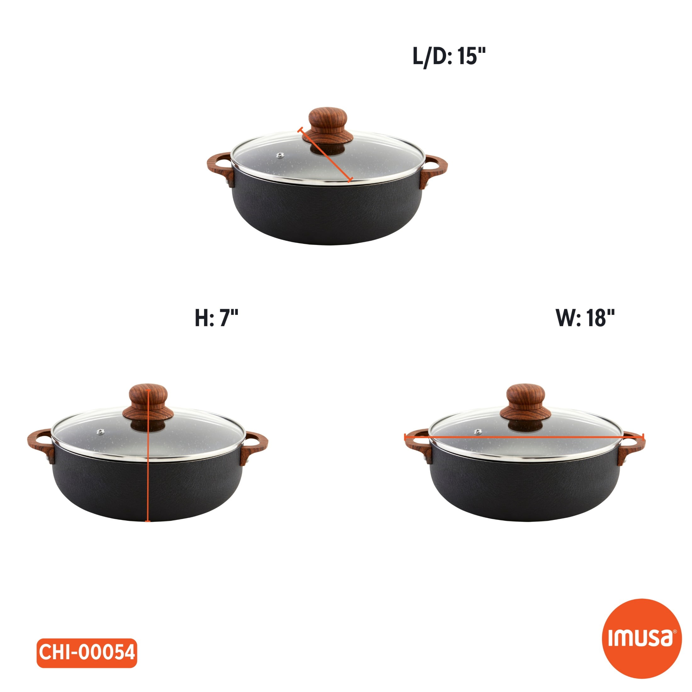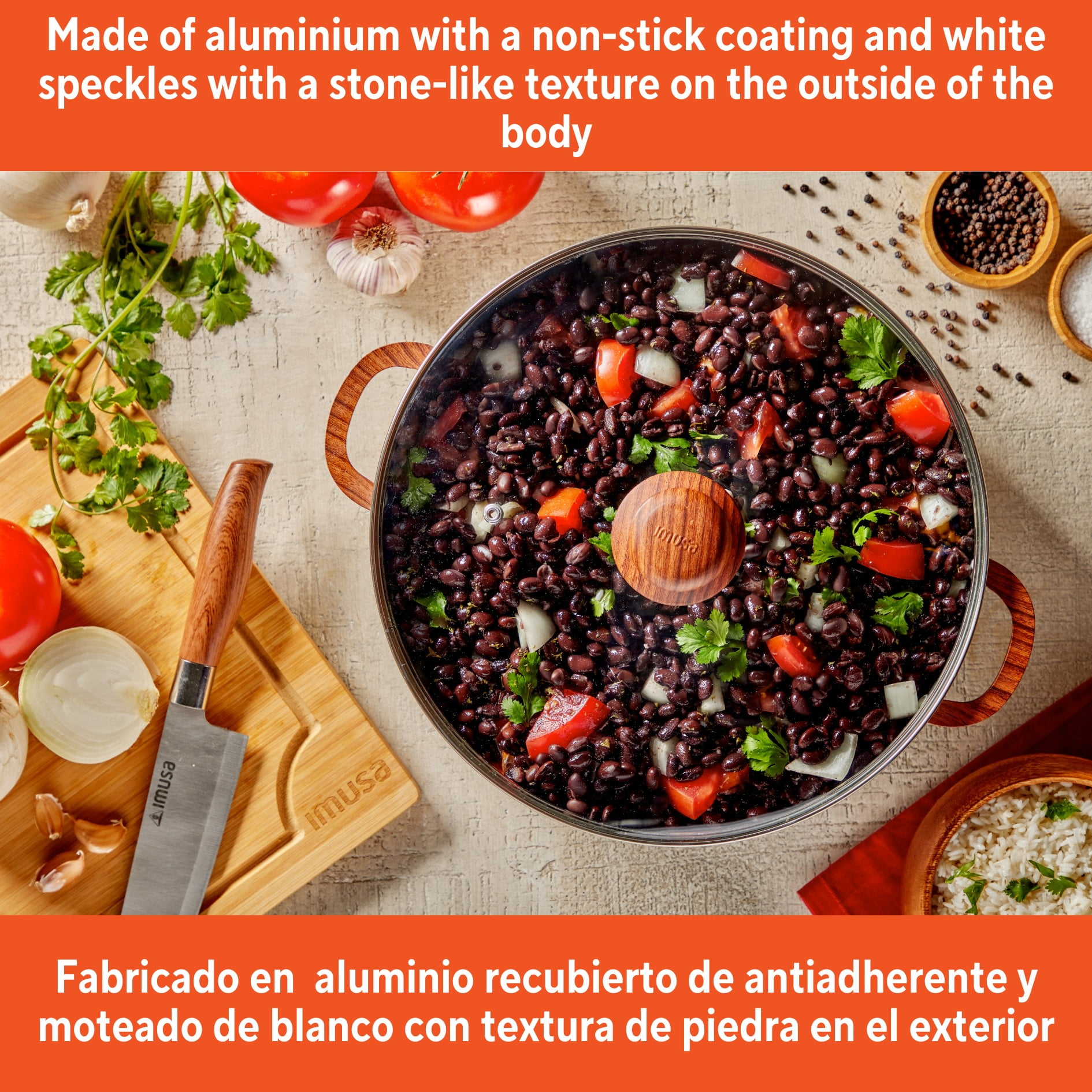 IMUSA 13.5qt Black Stone Aluminum Speckled Nonstick Caldero with Glass Lid & Wood Look Handles, Black
