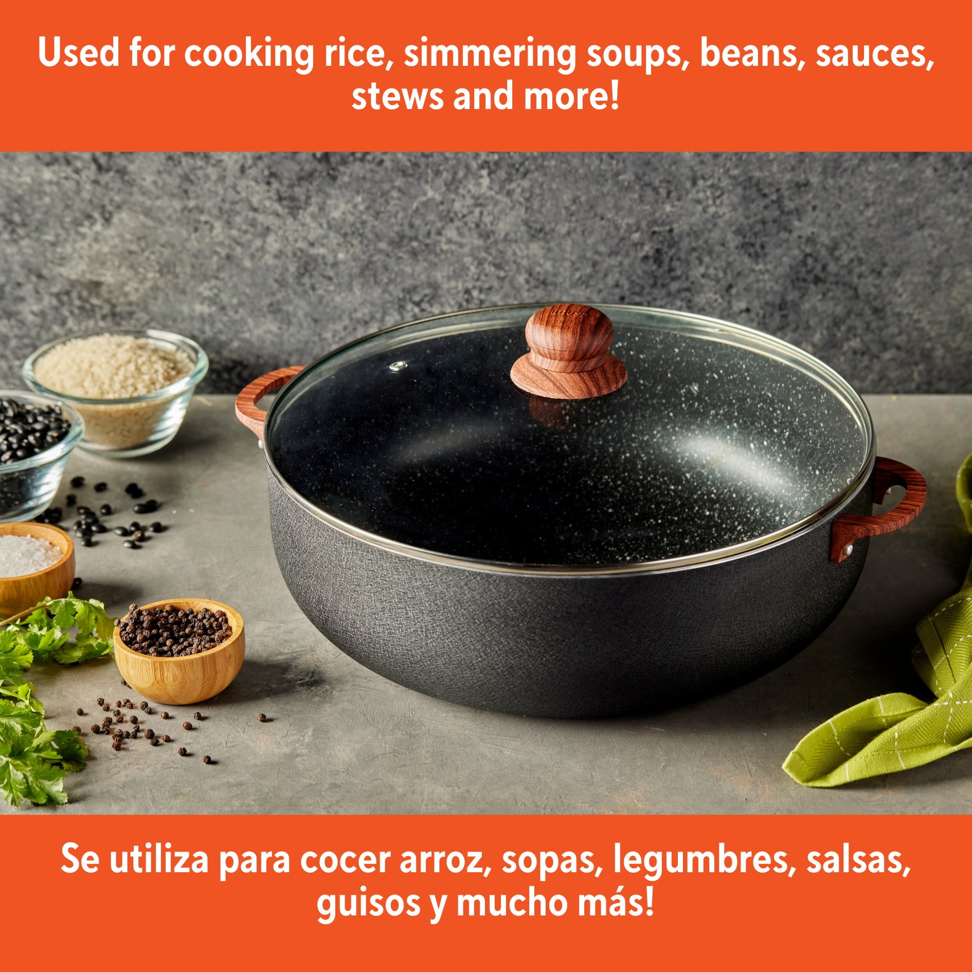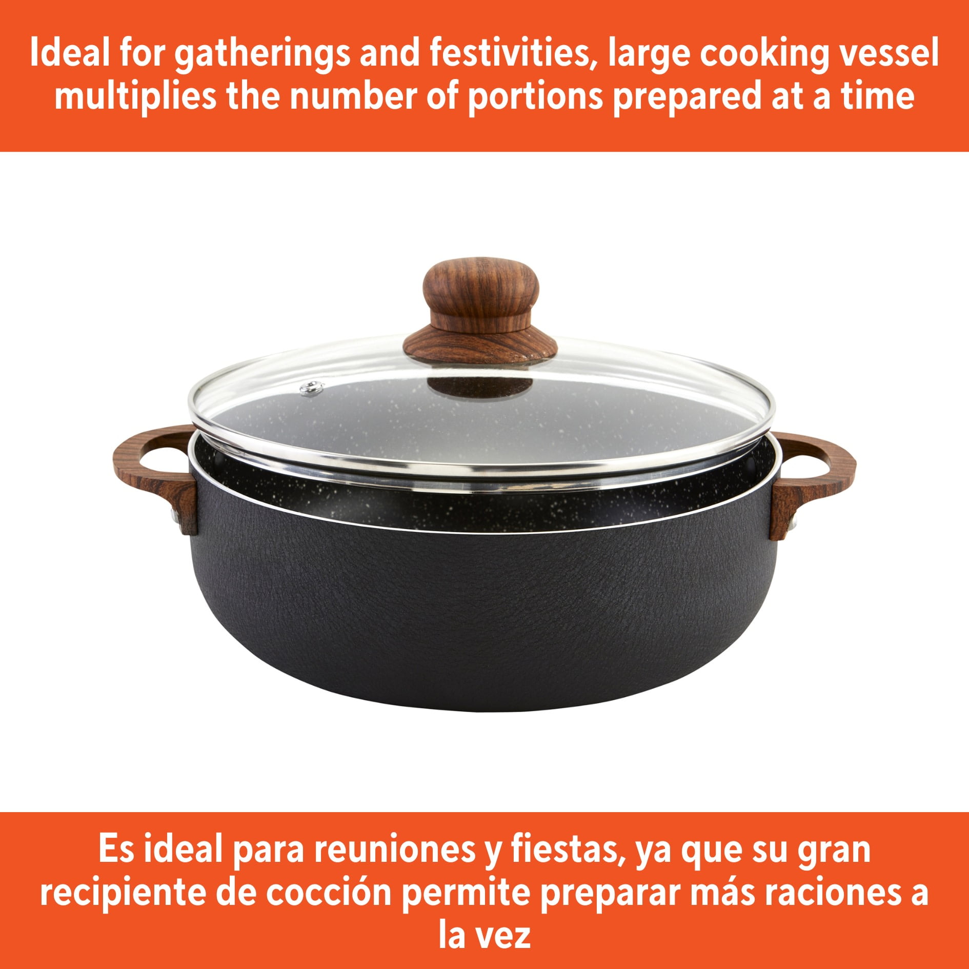 LARGE COOKING CAPACITY: This caldero has a capacity of 13,5 quarts, making it ideal for substantial meal sizes effortlessly, providing extensive versatility in various cooking applications DURABLE AND STYLISH: This caldero is made of aluminum, features nonstick coating with white speckles and a stone like textured exterior for a sophisticated look EFFICIENT AND USER FRIENDLY: Even heat distribution and retention for consistent cooking results, with wood look easy grip handles and knob for comfortable handling, and a tight fitting glass lid with steam vent for optimal cooking control CULINARY ADAPTABILITY: Perfect for cooking rice, simmering soups, beans, sauces, stews, and a wide variety of other delicious dishes, this versatile caldero adapts to numerous cooking styles and recipes, making it an essential tool in any kitchen ESSENTIAL FOR GATHERINGS: Perfect for serving large families and hosting gatherings, this Caldero is excellent for preparing a wide variety of Hispanic recipes, providing that everyone enjoys a flavorful and satisfying meals