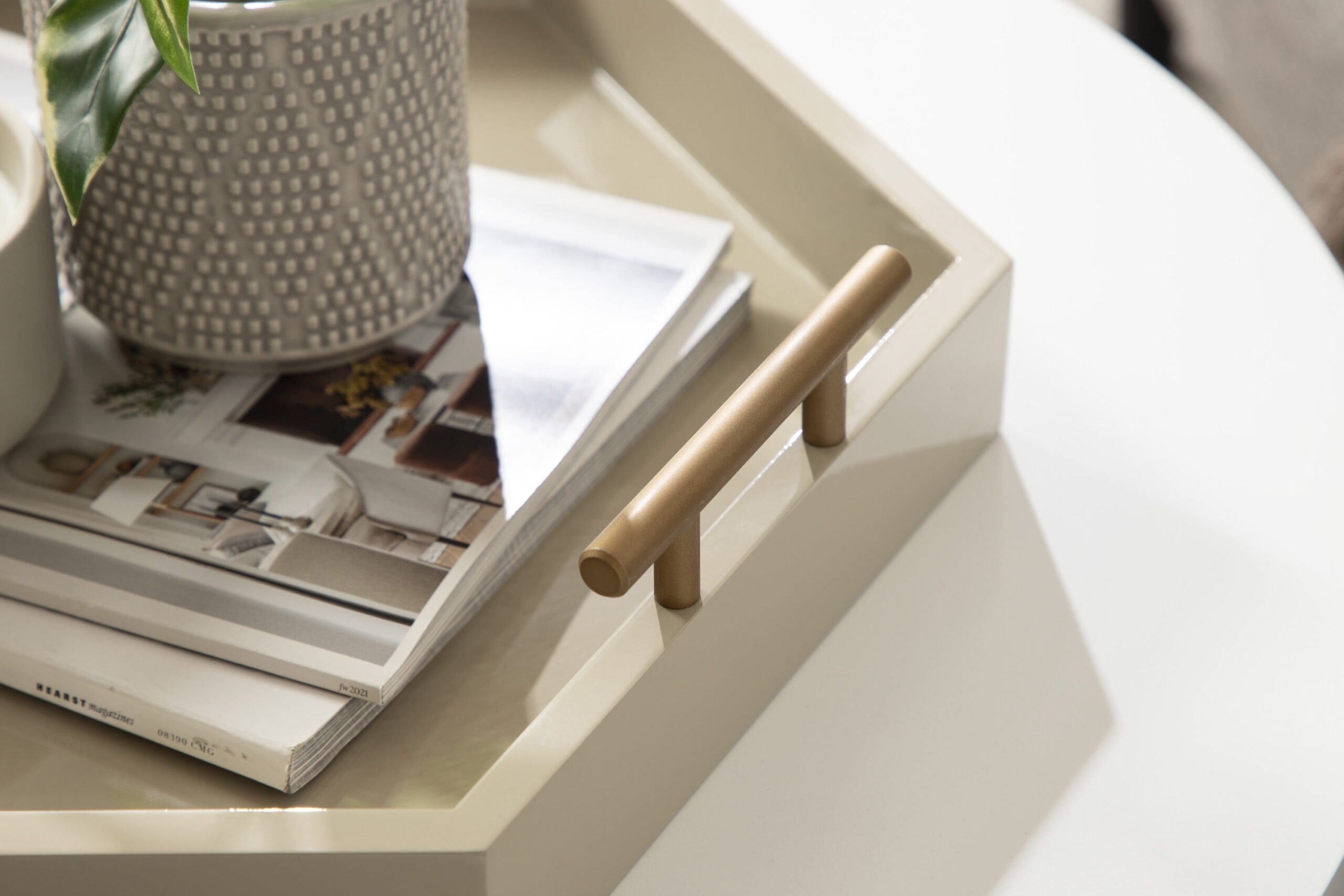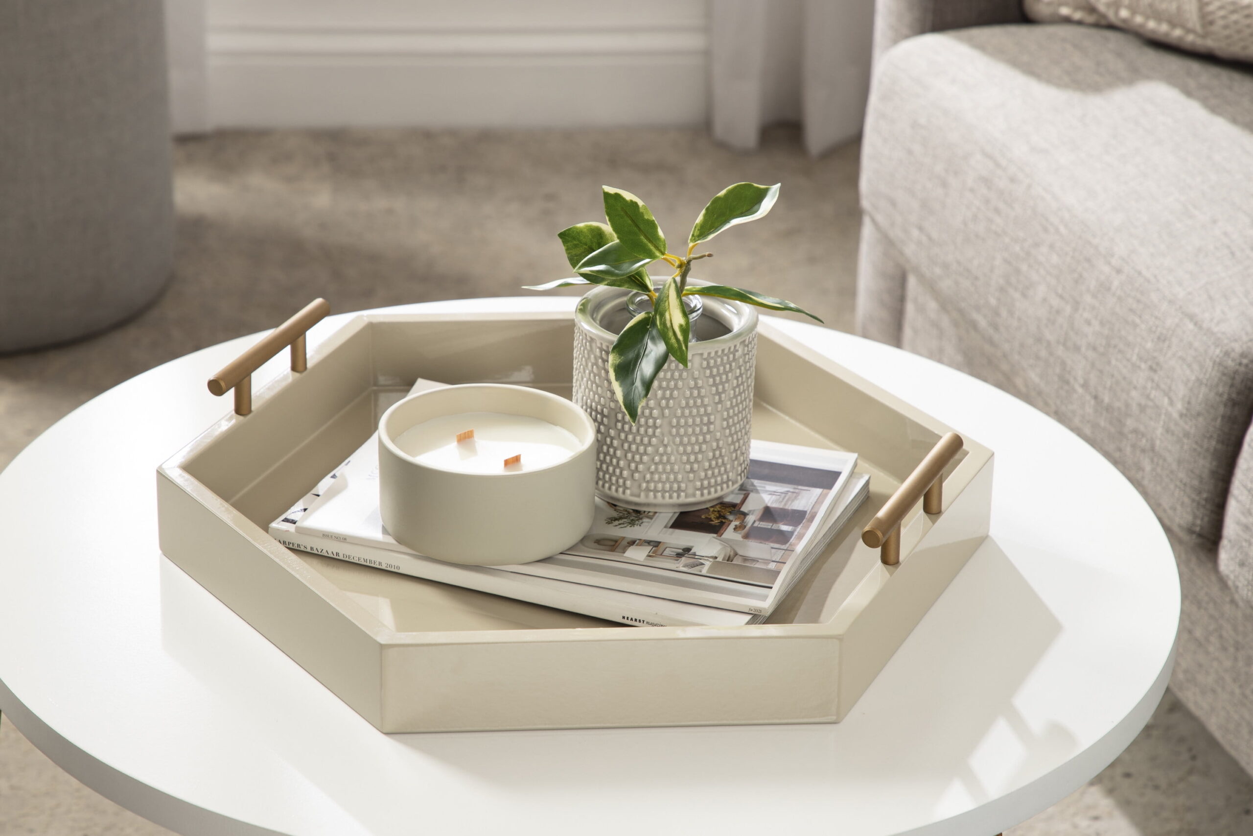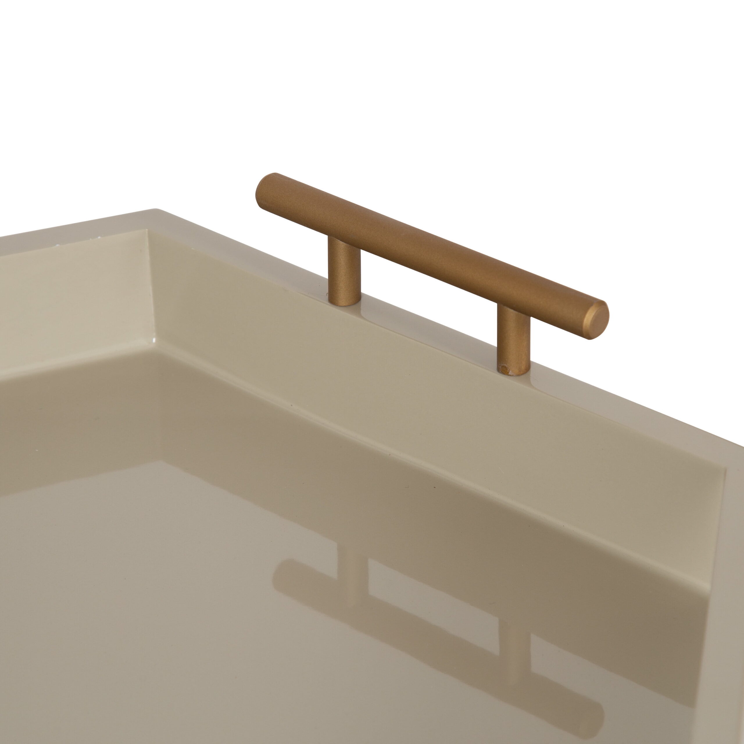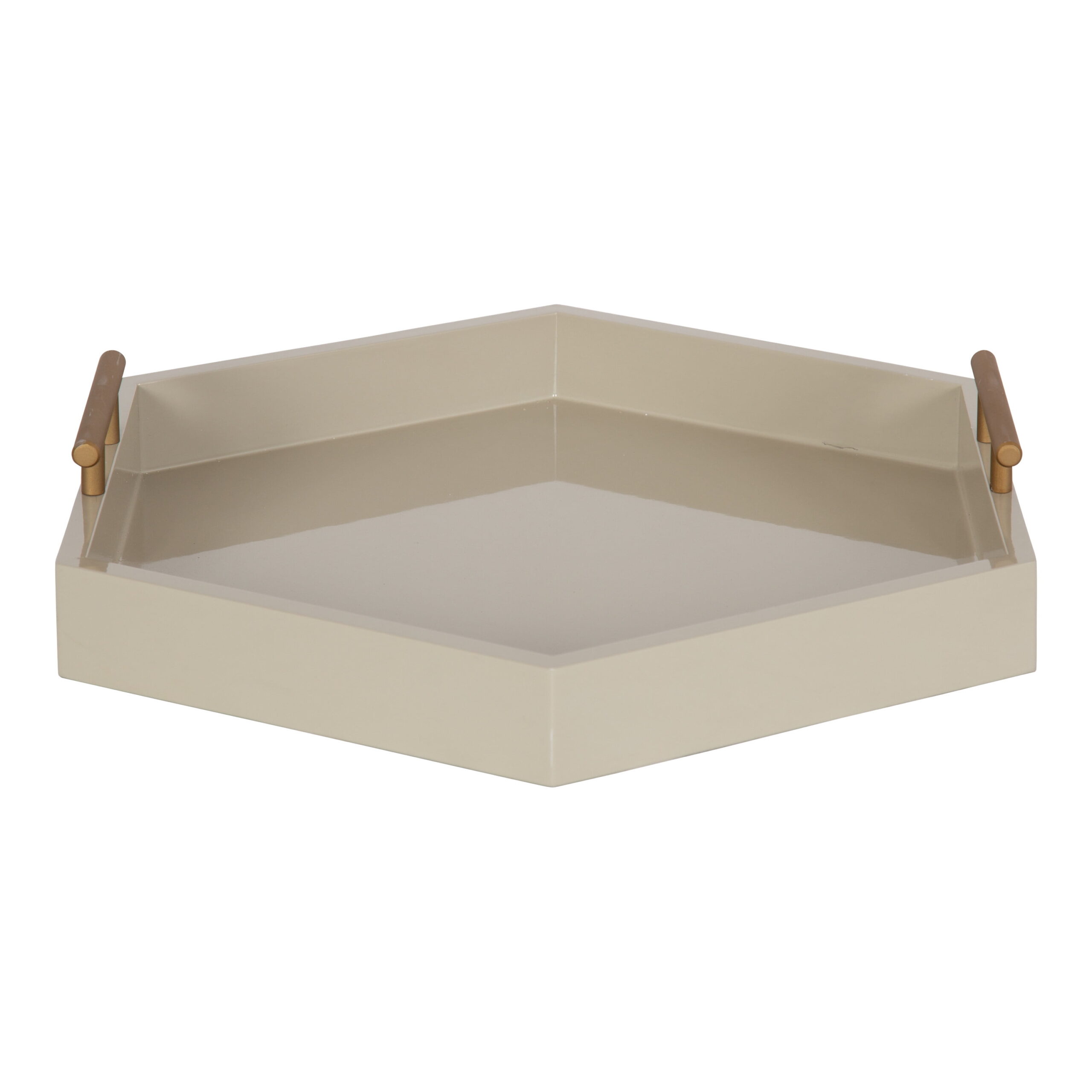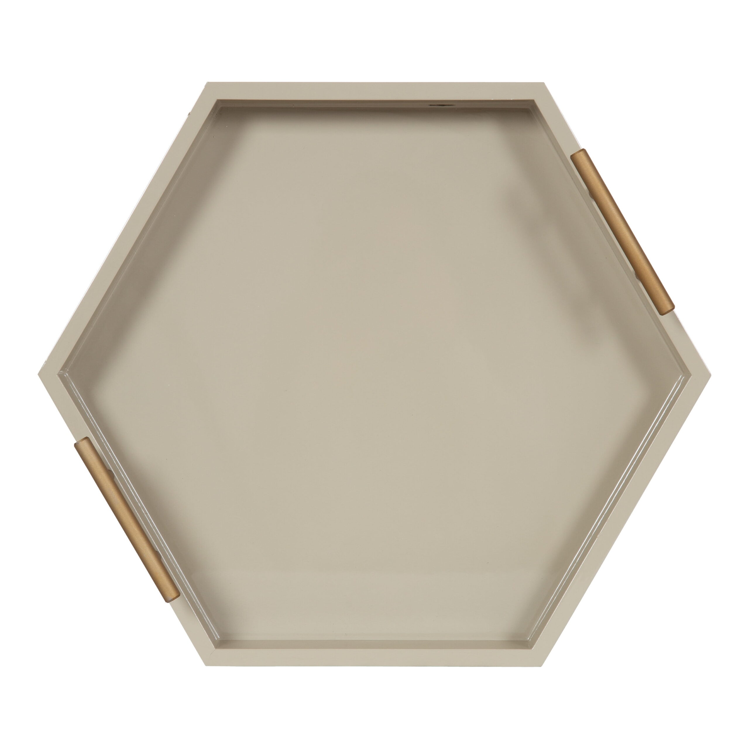 Bring modern glam style into your home with this hexagon-shaped decorative accent tray. The Lipton tray is perfect for showcasing mid-century modern style with its glossy sand finish and unique shape. Place this charming tray on your entrance console table as a trinket tray to hold your keys and mail, as a serving tray for your next fancy get-together, or as a makeup tray next to your vanity. This tray can also be used as a decorative accent on an ottoman to hold your media remotes or on a console as a decorative surface for plants, photos, and other family keepsakes. Constructed of lightweight material with a glossy finish and metal handles, this tray is sturdy yet refined, giving your home a beautiful mid-century theme with a practical design. The tray measures 18 inches wide, 18 inches deep, and stands 3.25 inches high, giving you plenty of room for various purposes. The Lipton allows you to bring a chic and glamorous decorative accent into your home that helps you layer your decor and provides you with another functional space to play with.